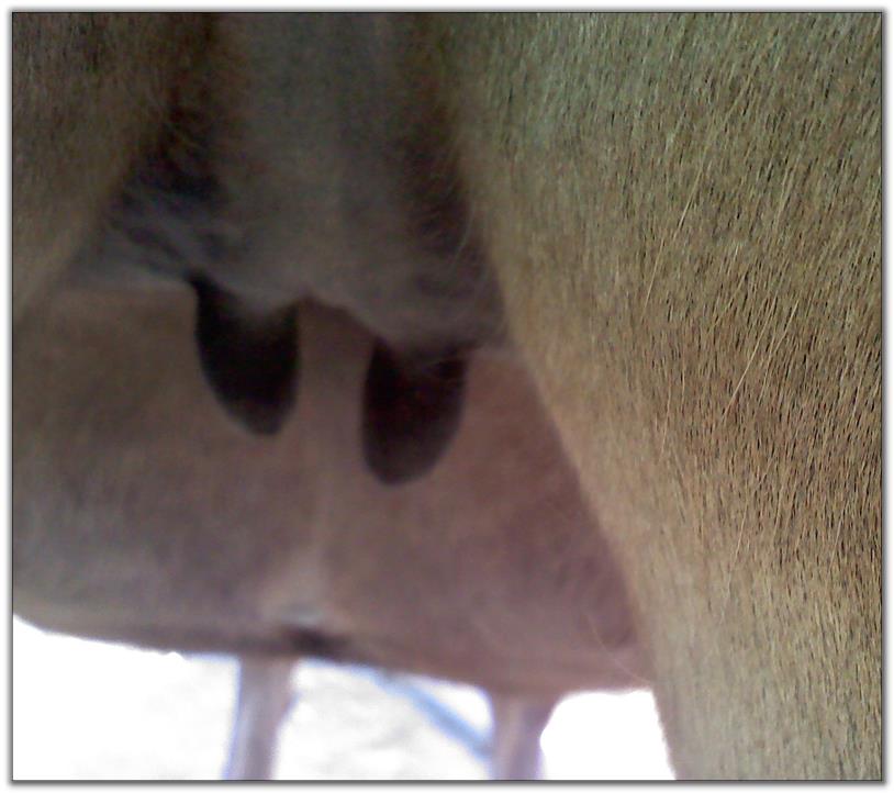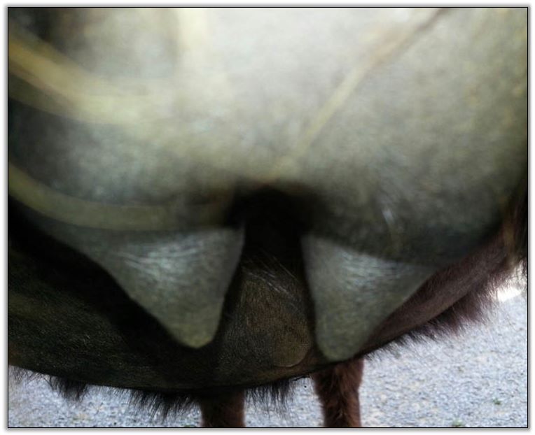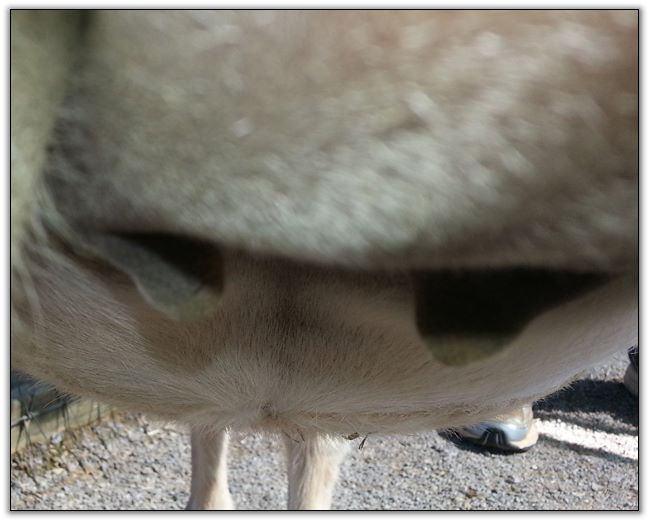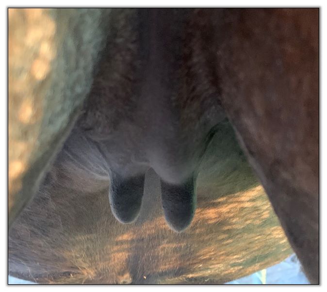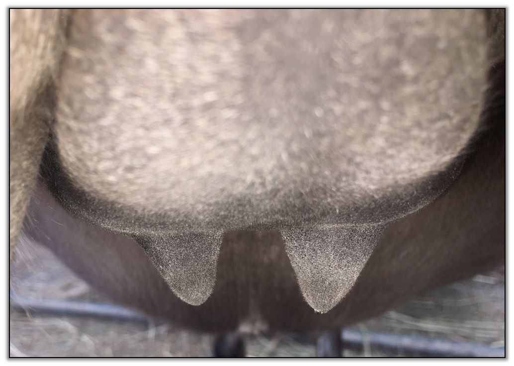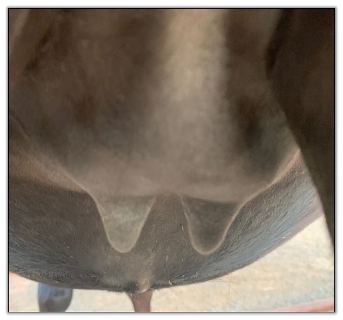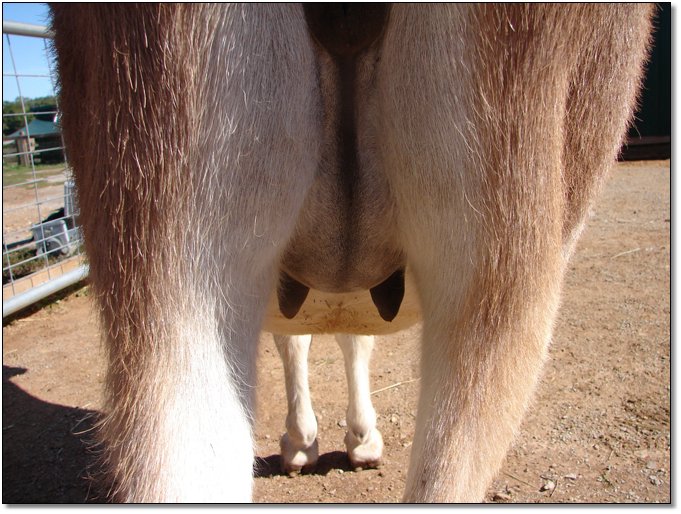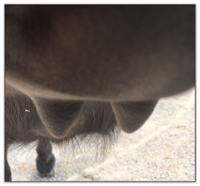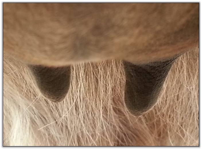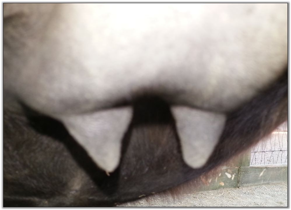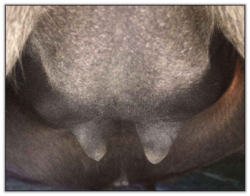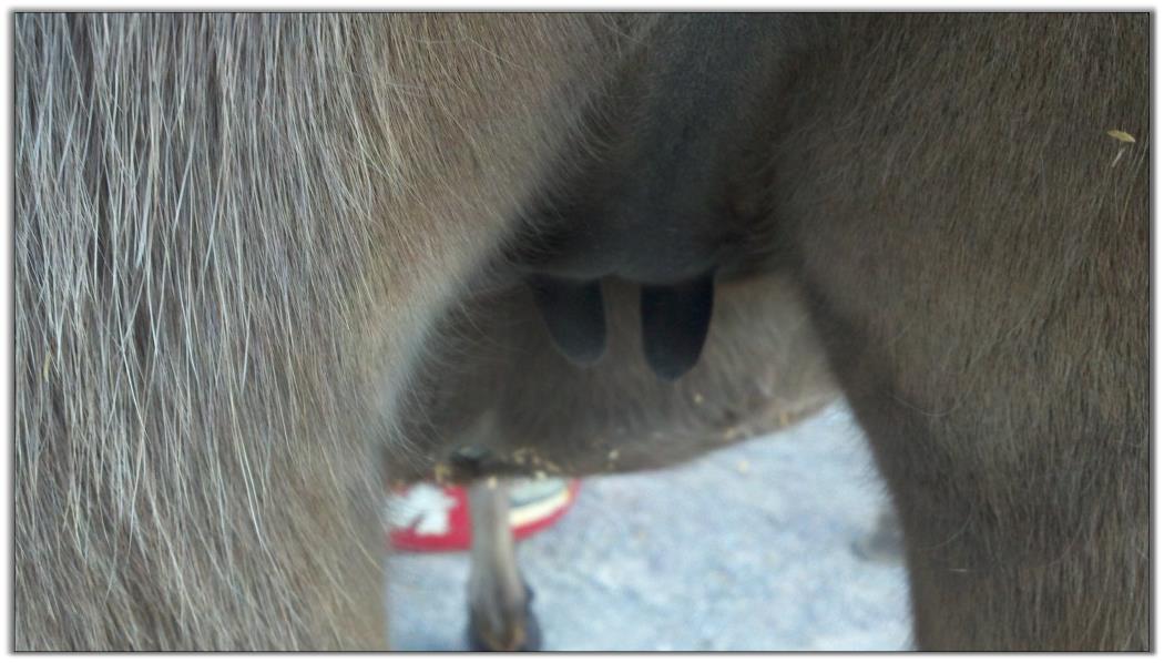 Two hours later and even firmer!! As you can see she is no longer flat but rounding out between her teats. We think she will foal within 24 to 48 hours!