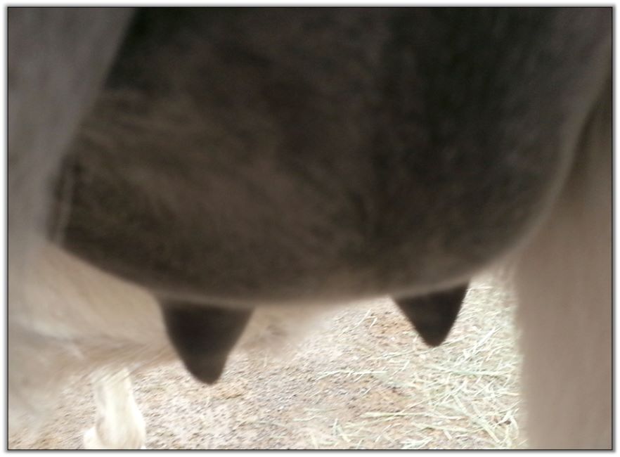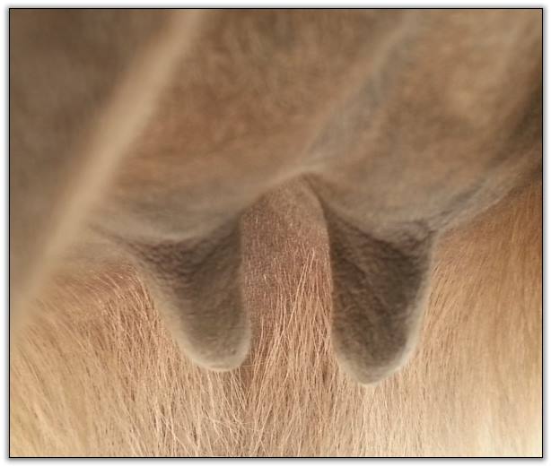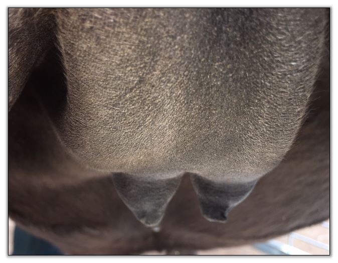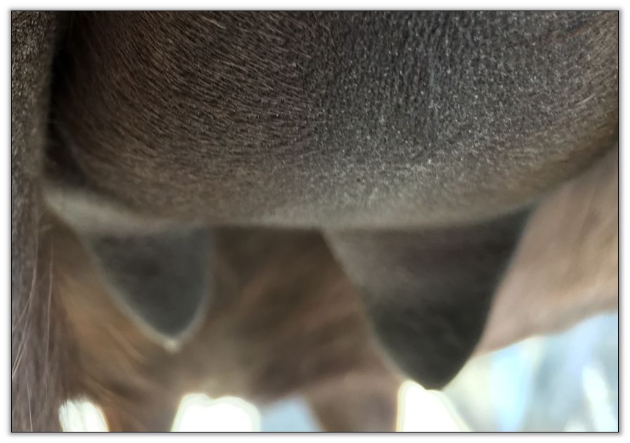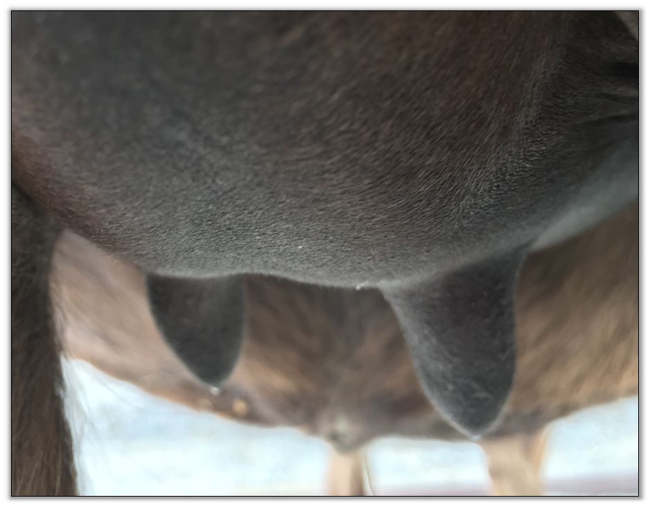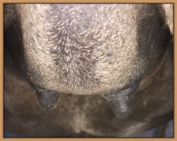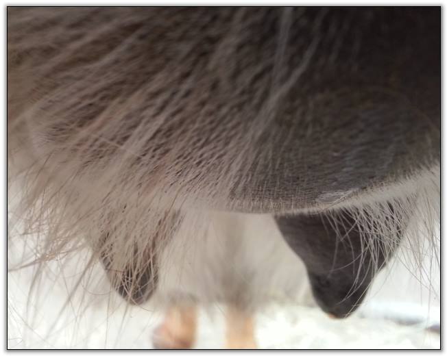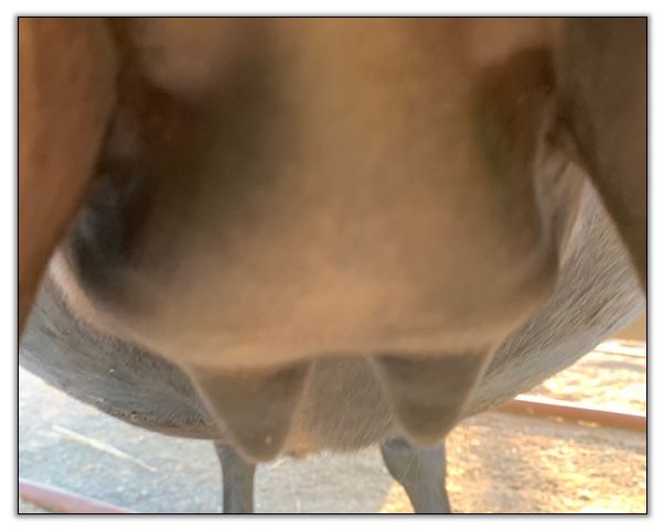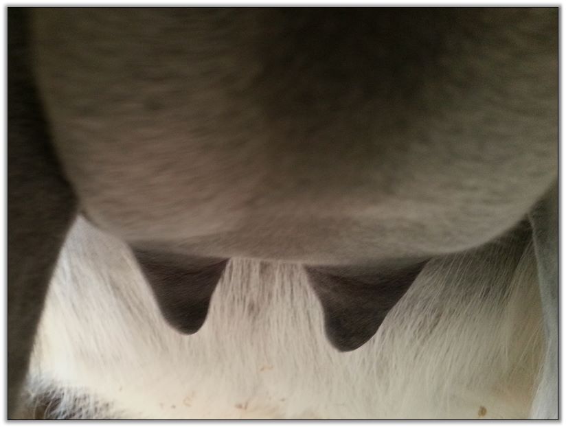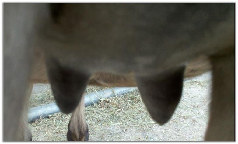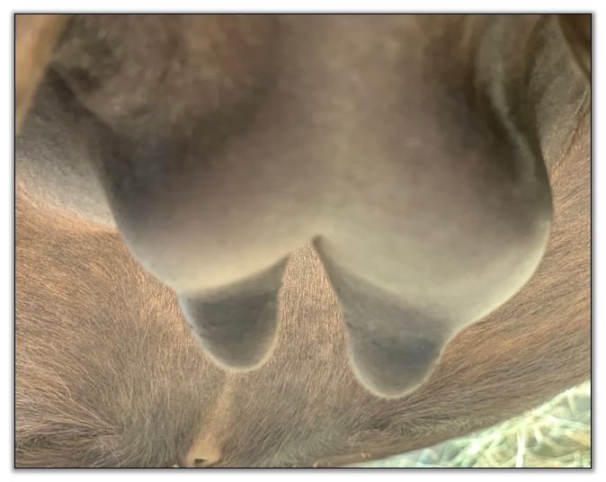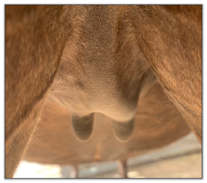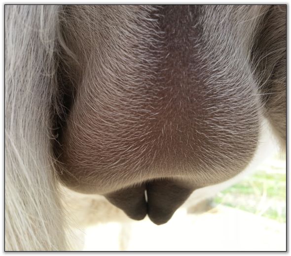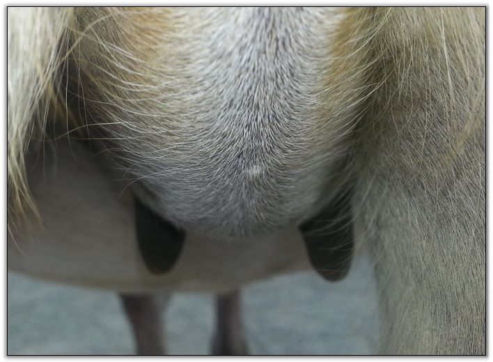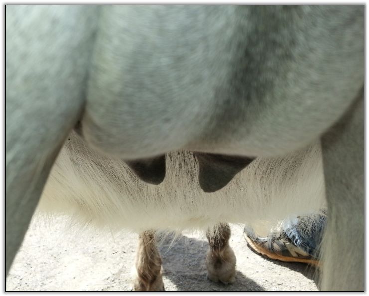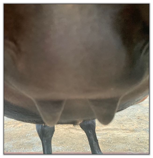 Two hours later and even firmer!! As you can see she is no longer flat but rounding out between her teats. We think she will foal within 24 to 48 hours!
