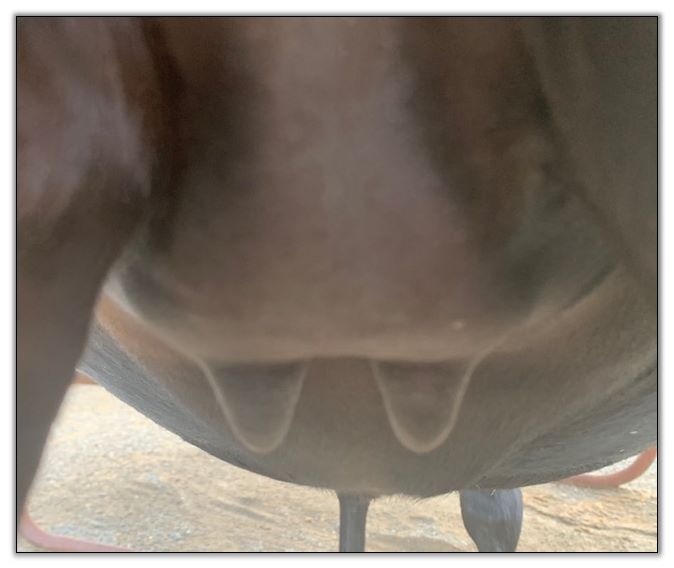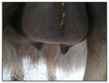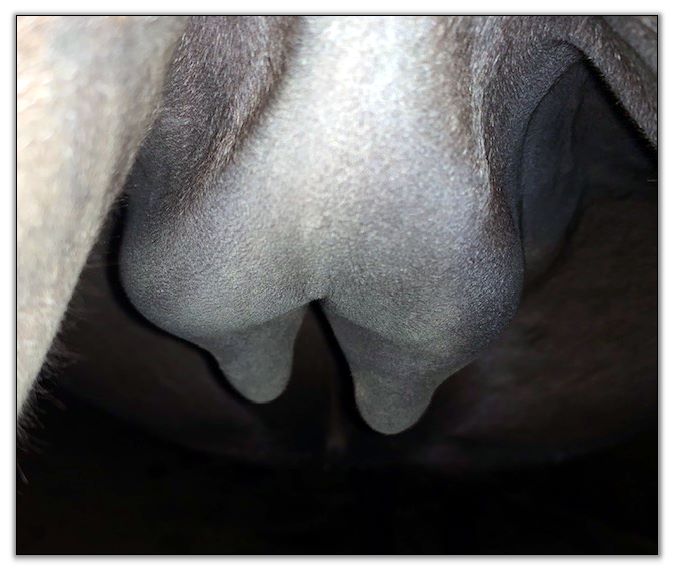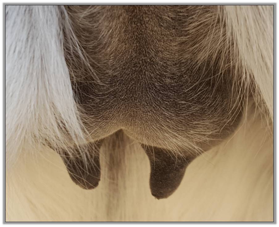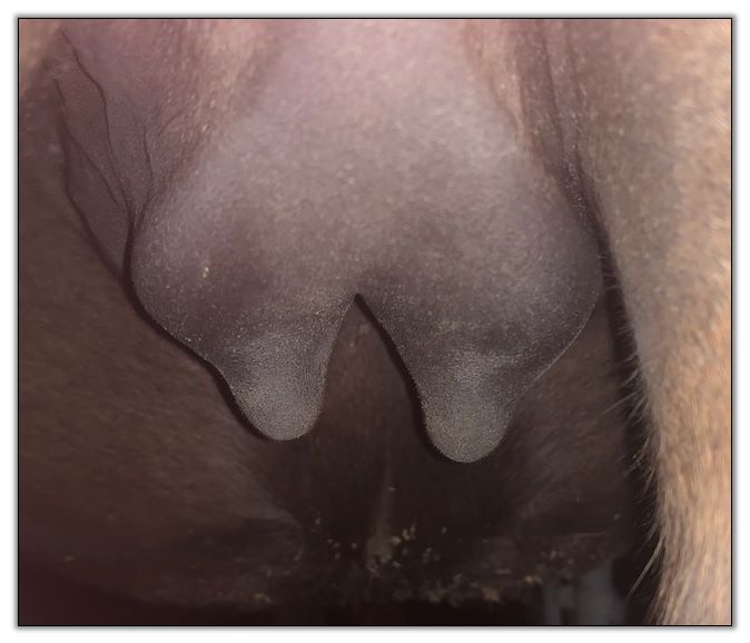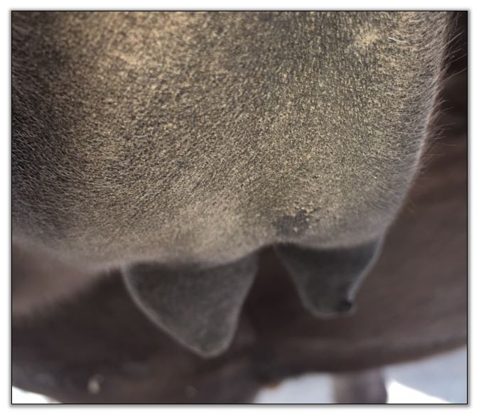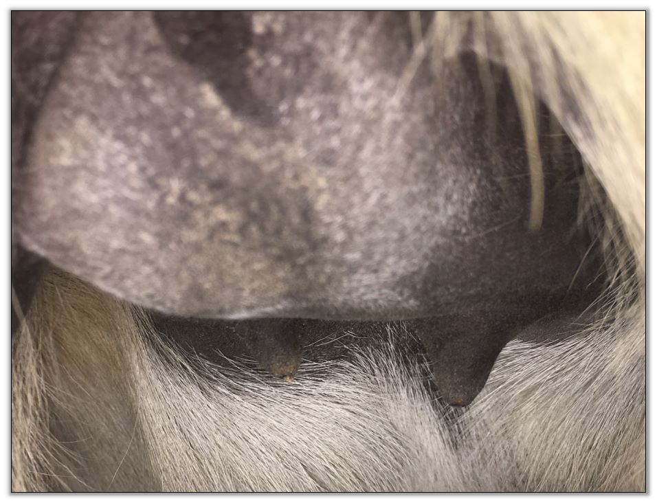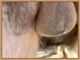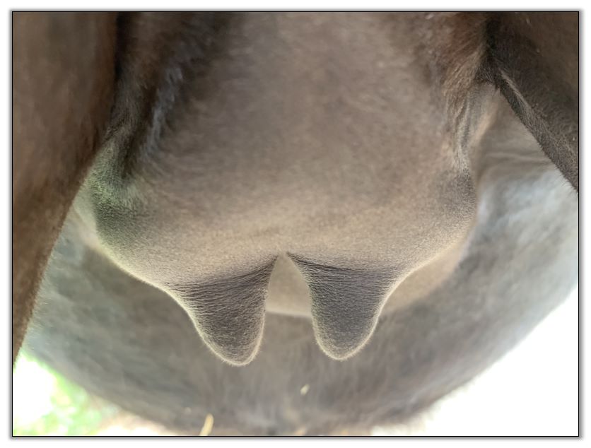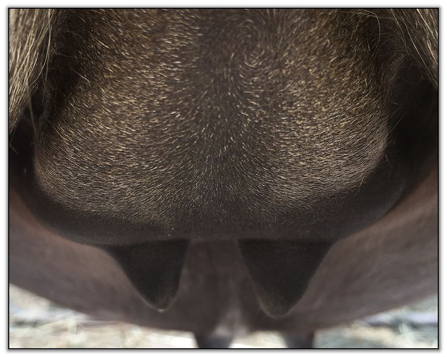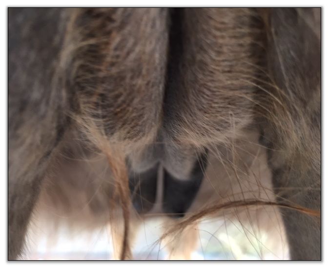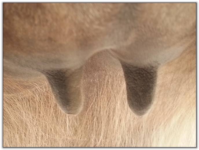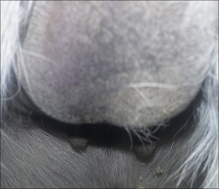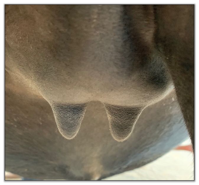 Two hours later and even firmer!! As you can see she is no longer flat but rounding out between her teats. We think she will foal within 24 to 48 hours!