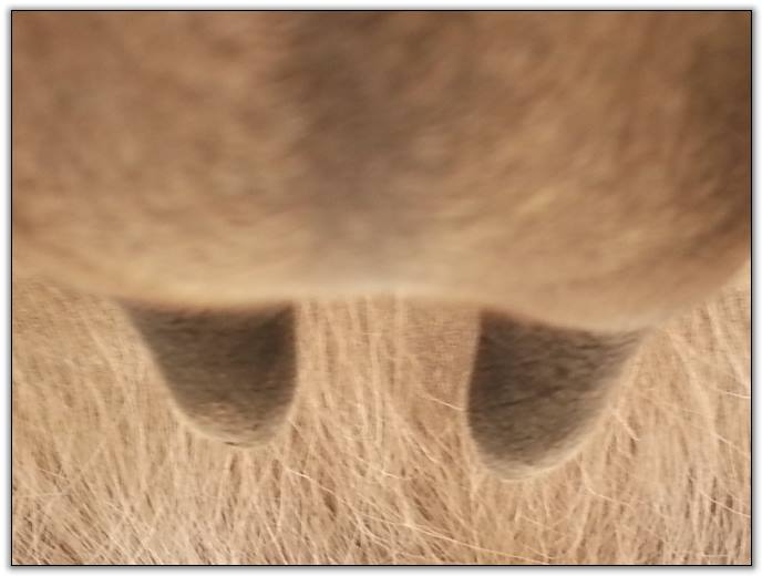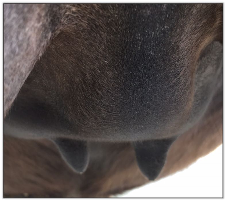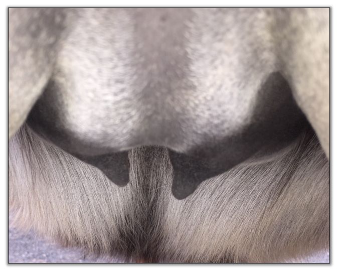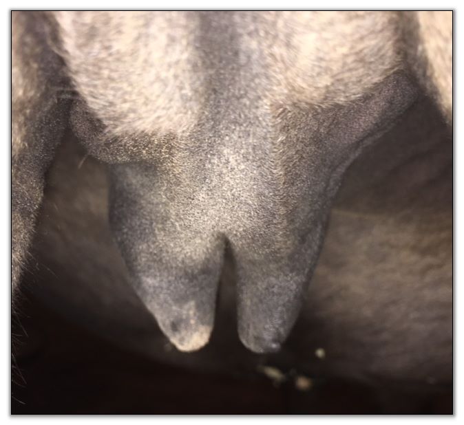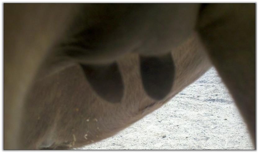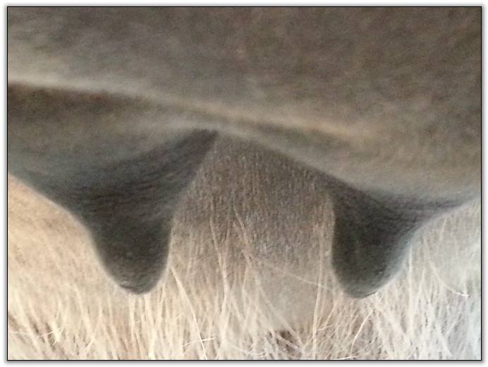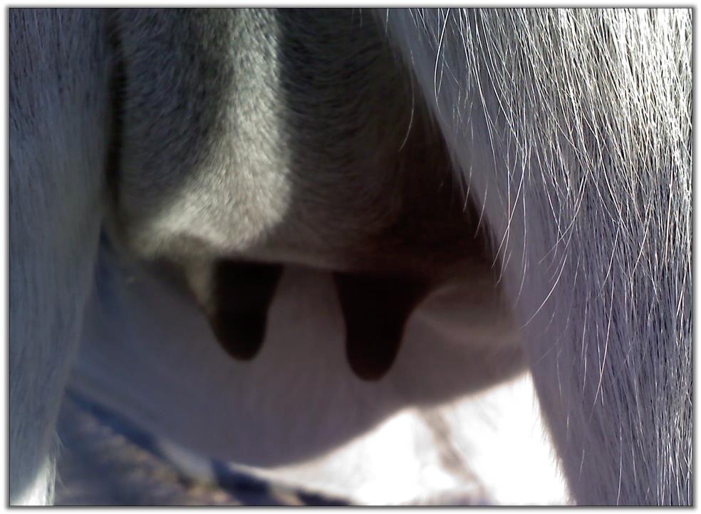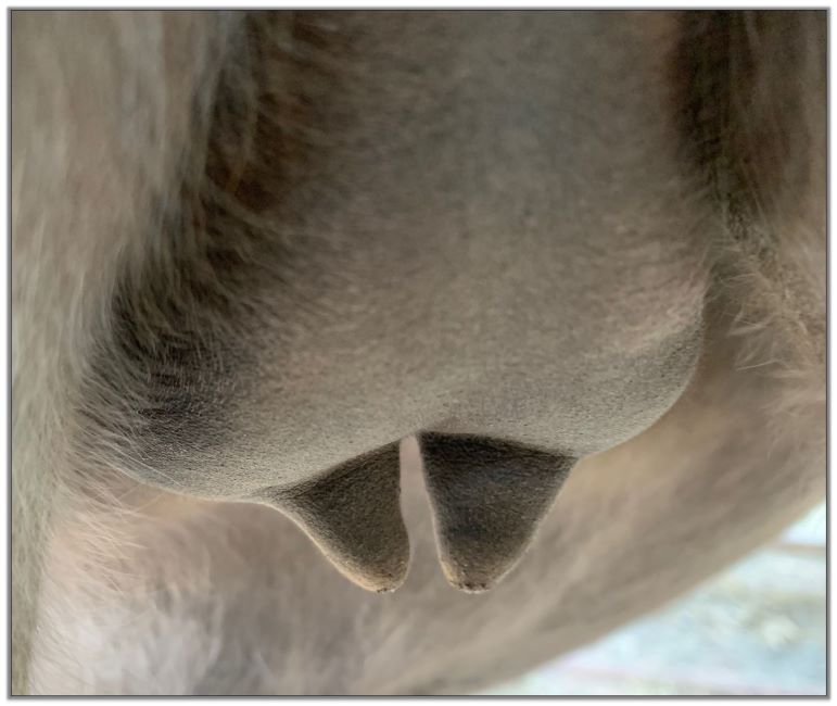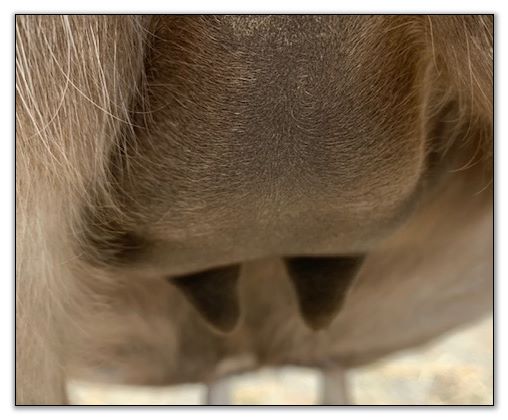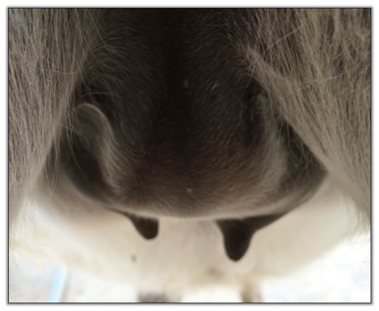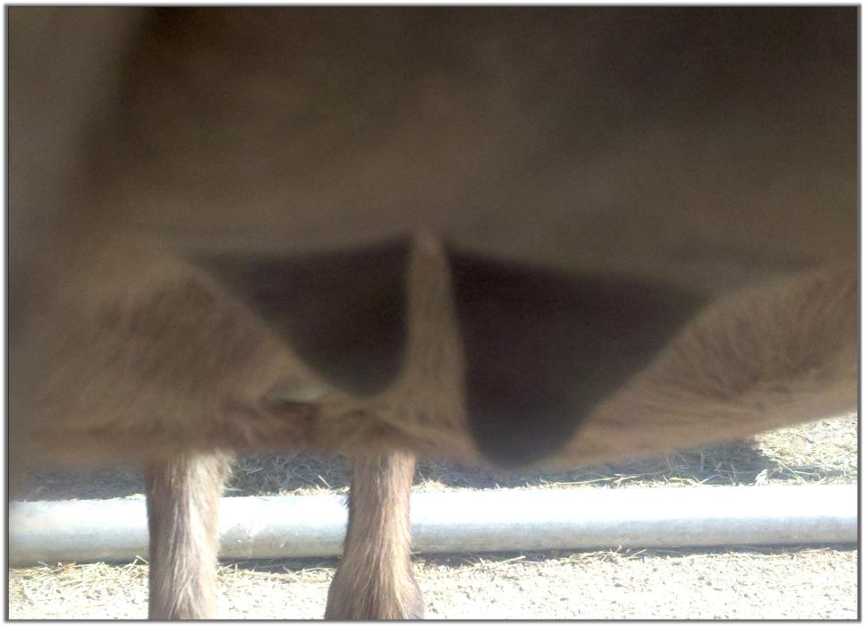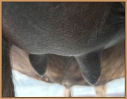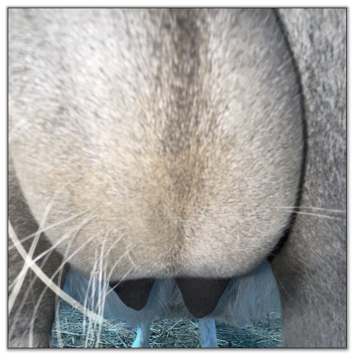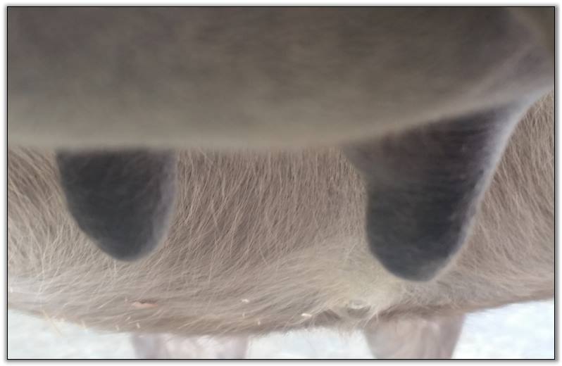 Two hours later and even firmer!! As you can see she is no longer flat but rounding out between her teats. We think she will foal within 24 to 48 hours!