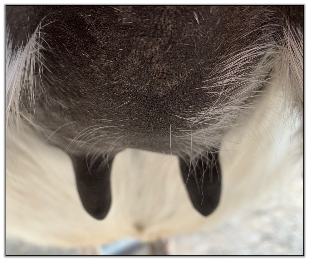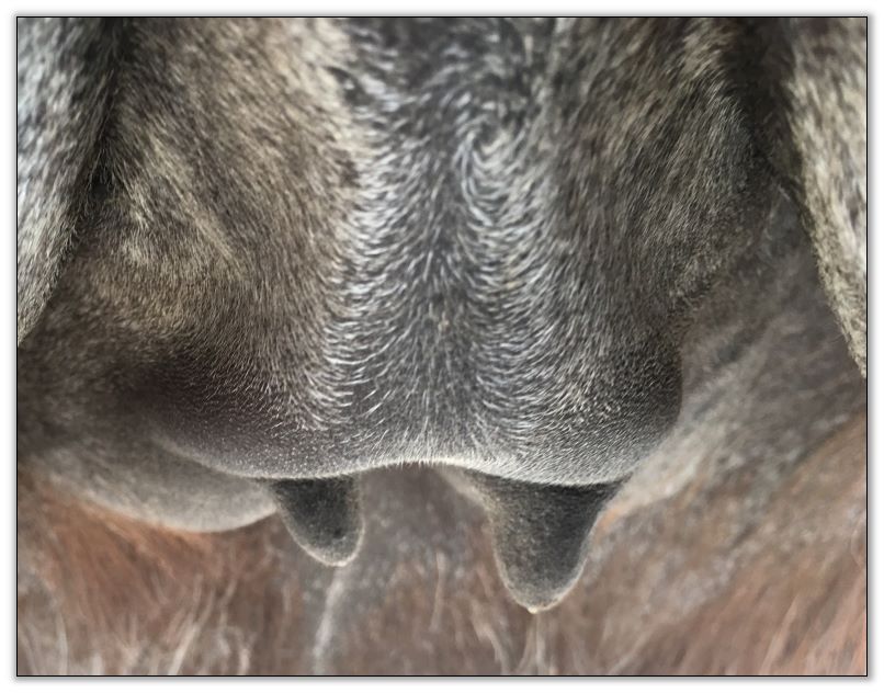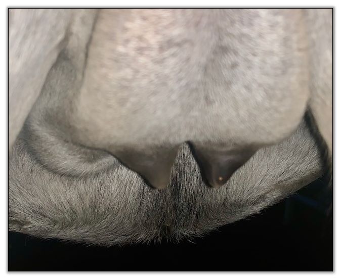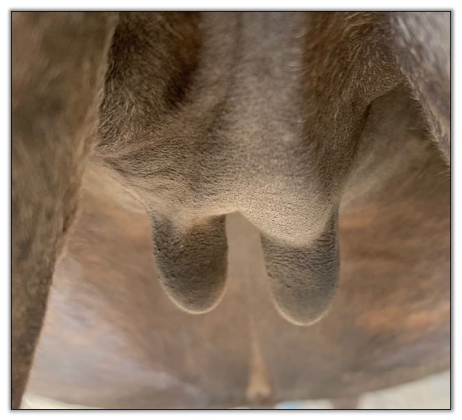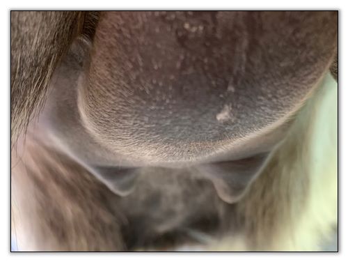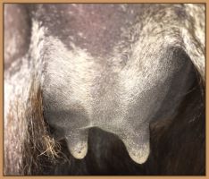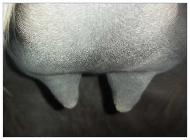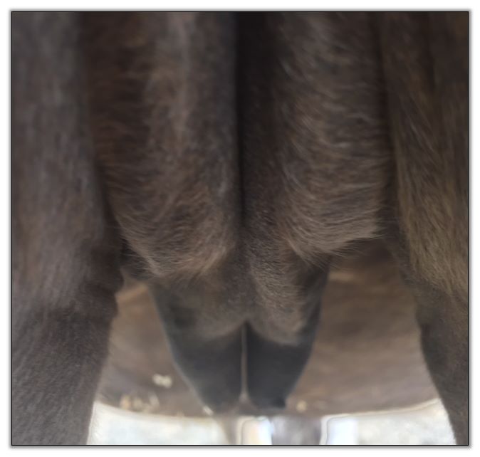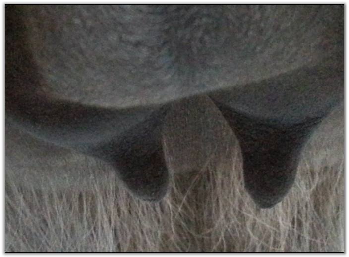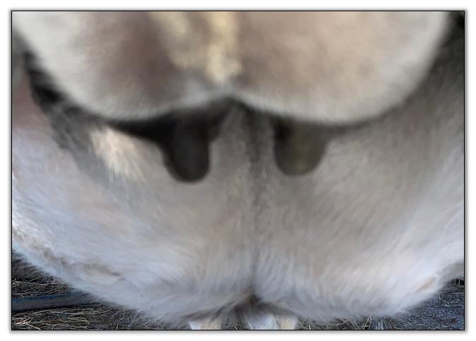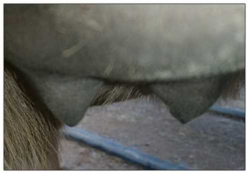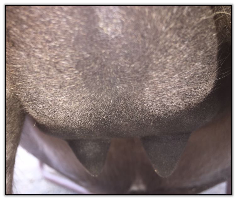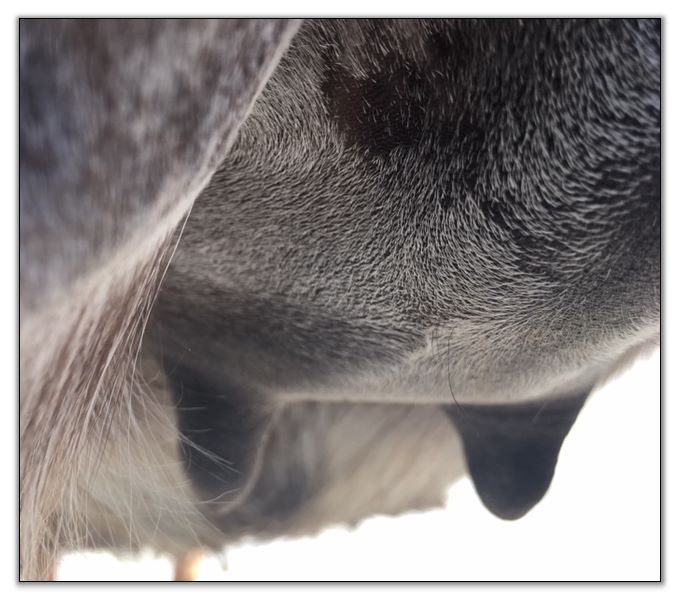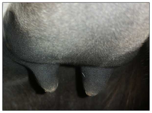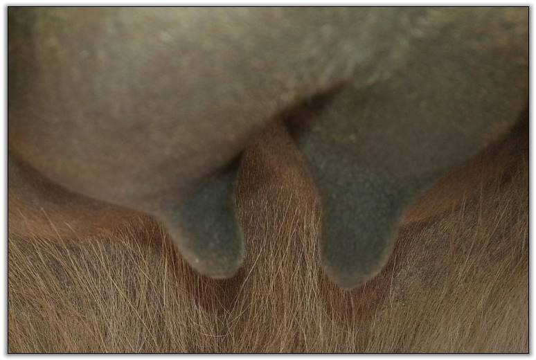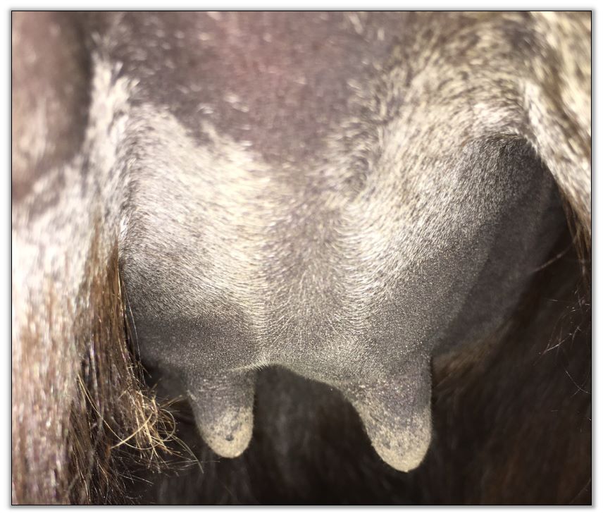 Two hours later and even firmer!! As you can see she is no longer flat but rounding out between her teats. We think she will foal within 24 to 48 hours!
