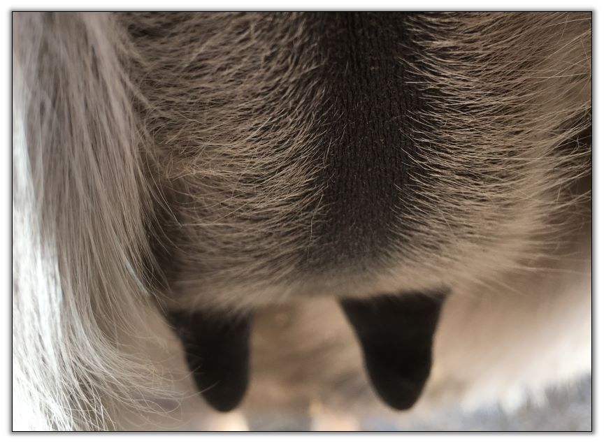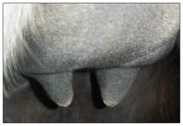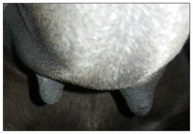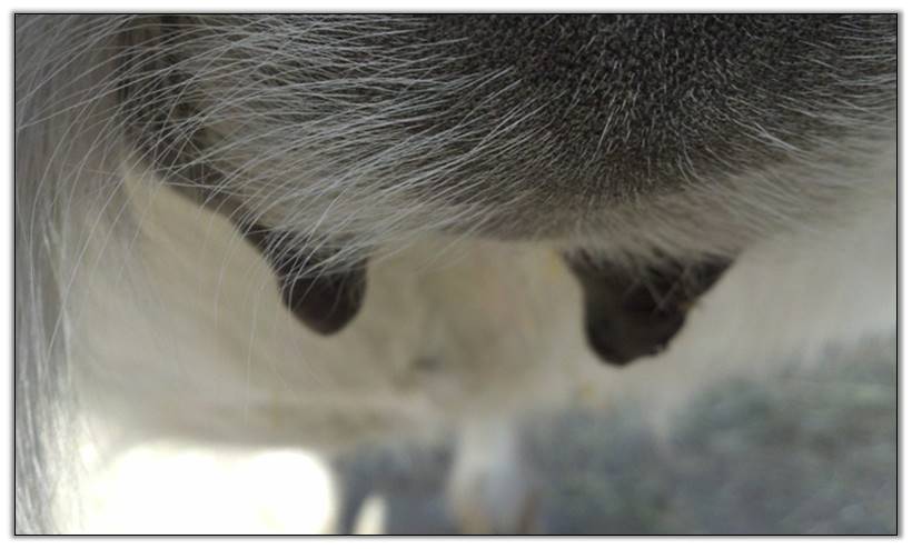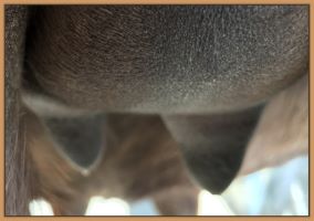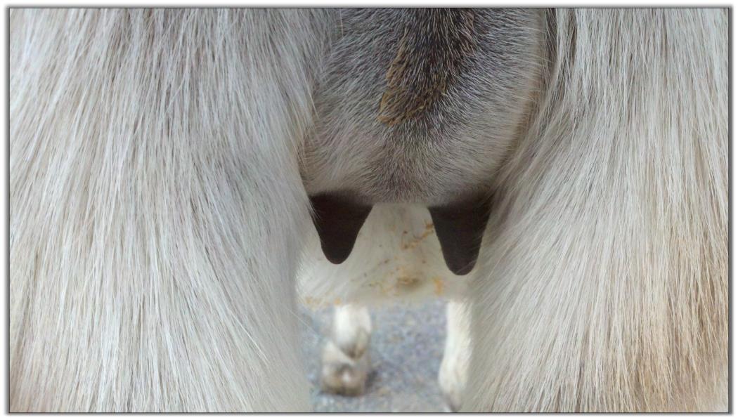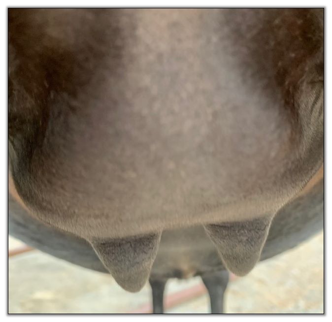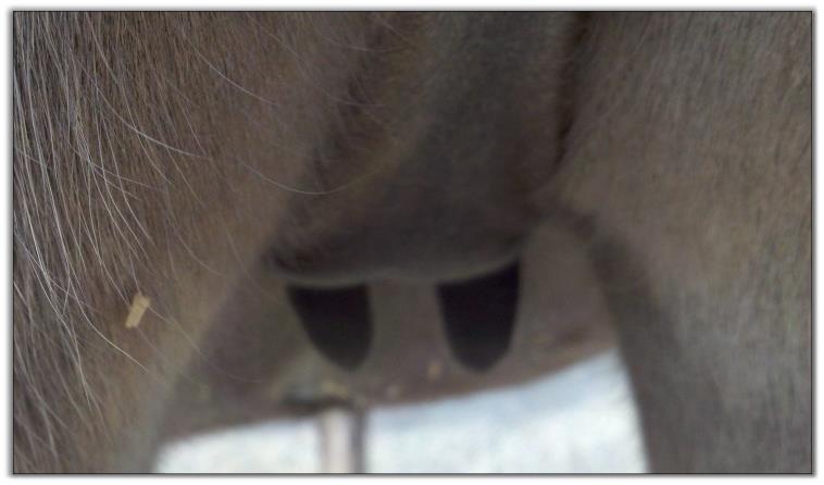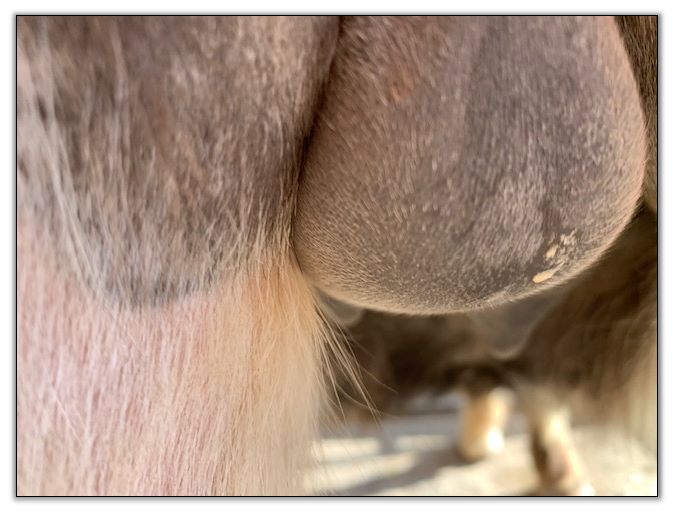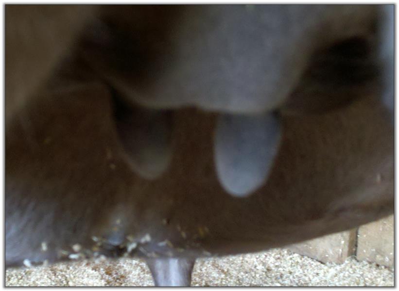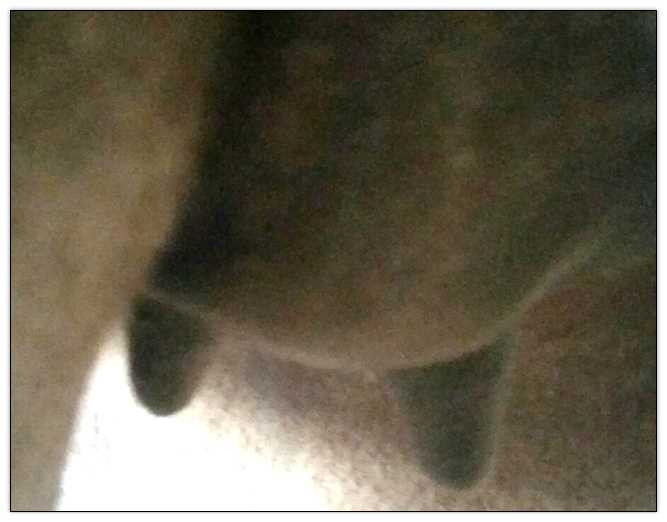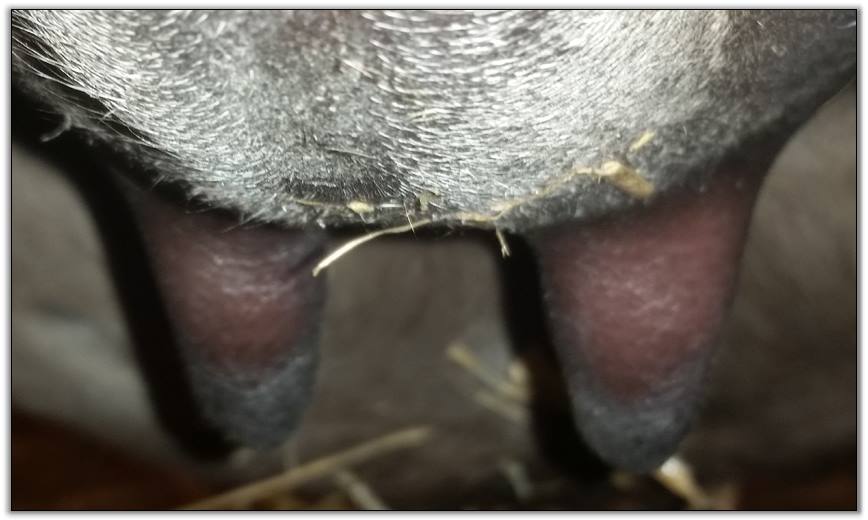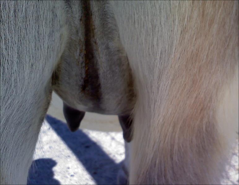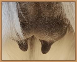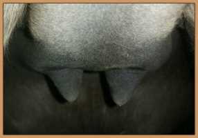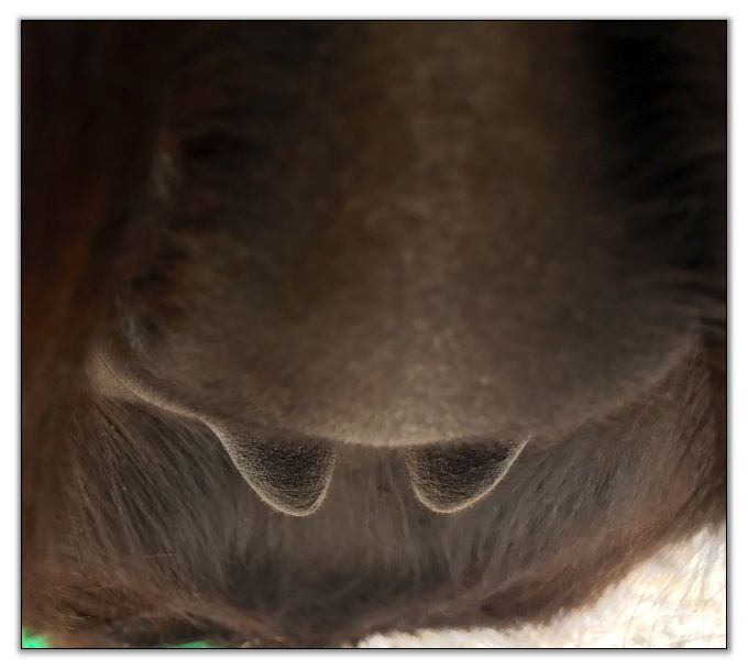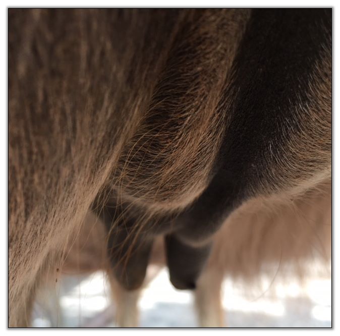 Two hours later and even firmer!! As you can see she is no longer flat but rounding out between her teats. We think she will foal within 24 to 48 hours!