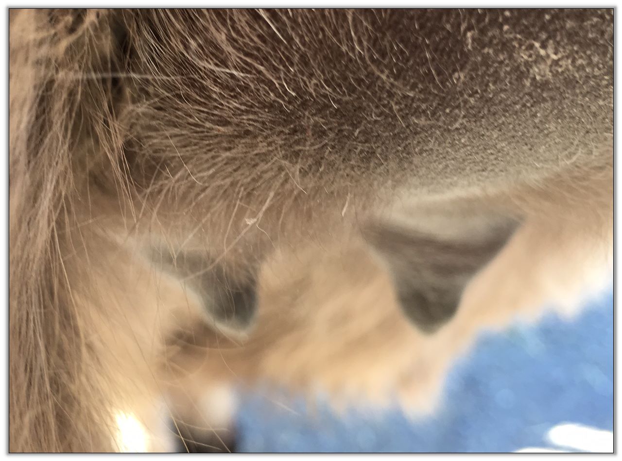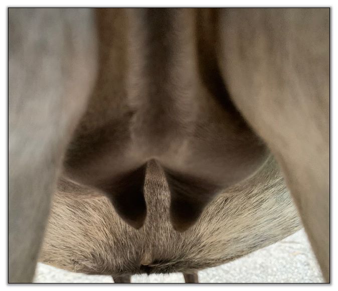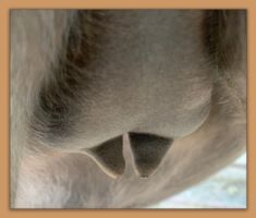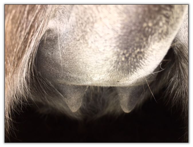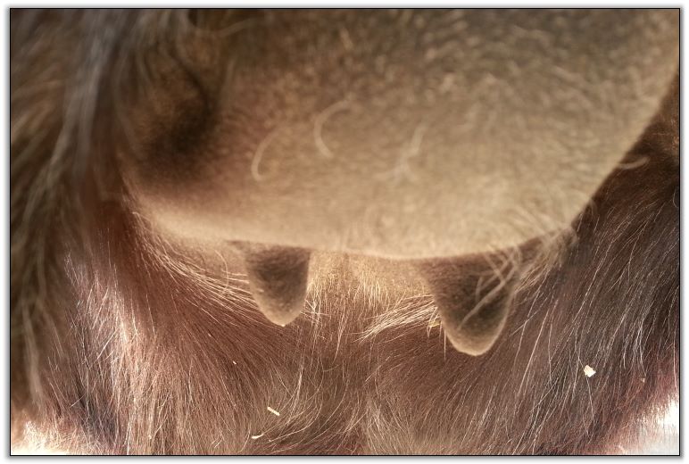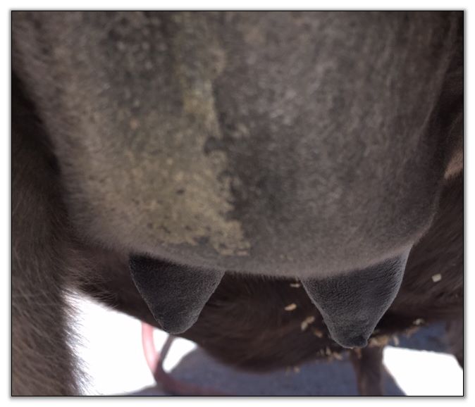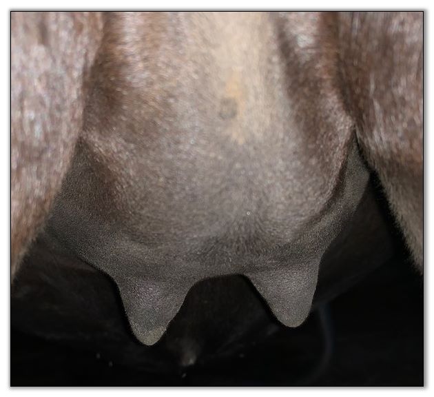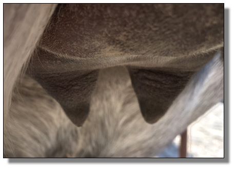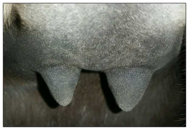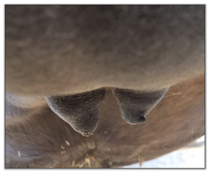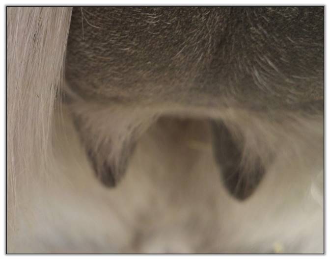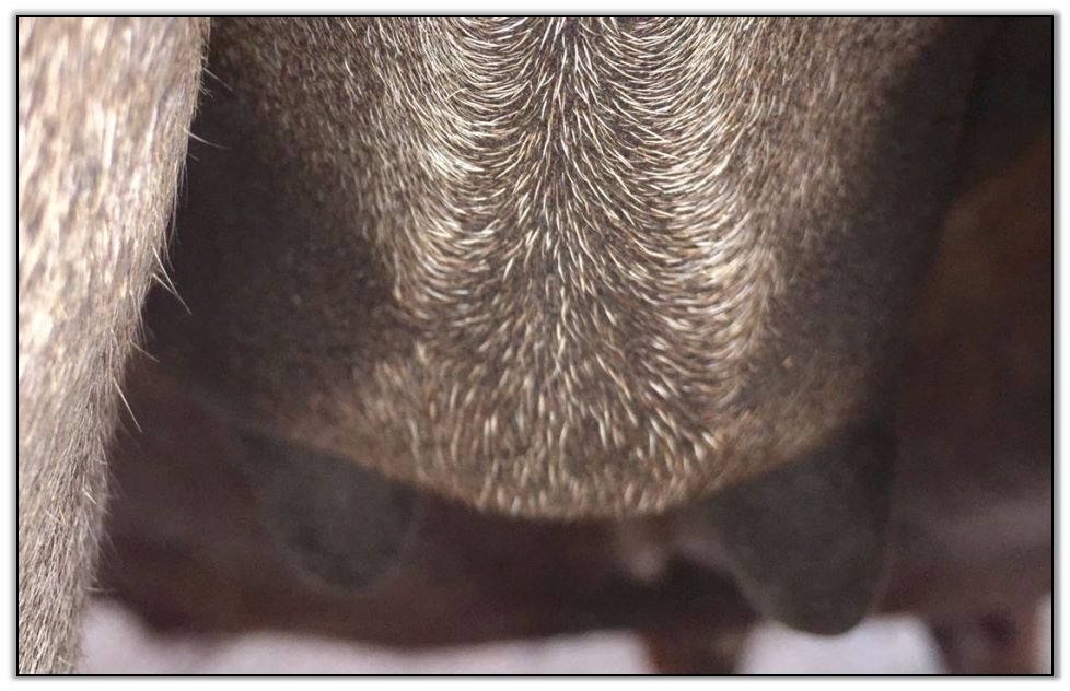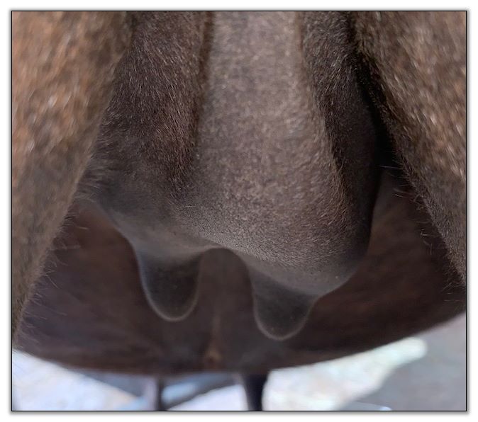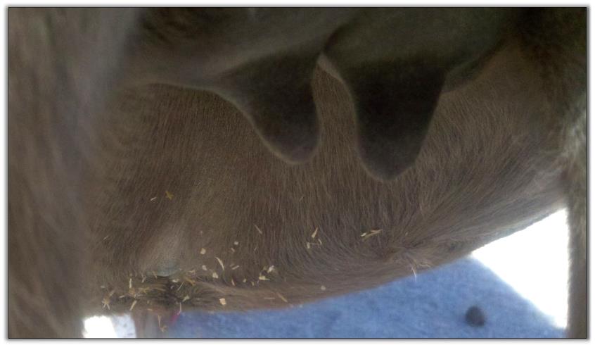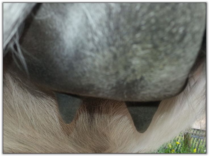 Two hours later and even firmer!! As you can see she is no longer flat but rounding out between her teats. We think she will foal within 24 to 48 hours!