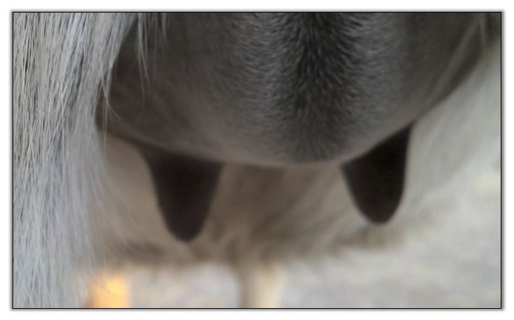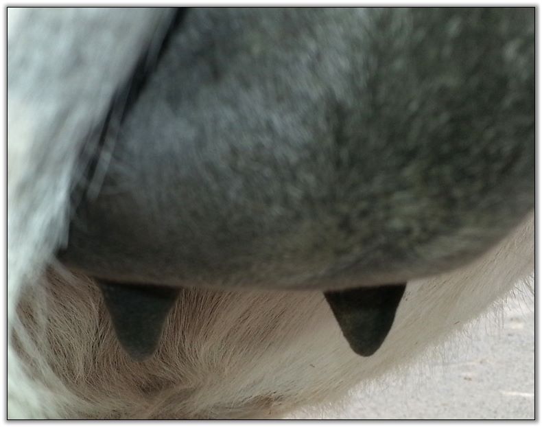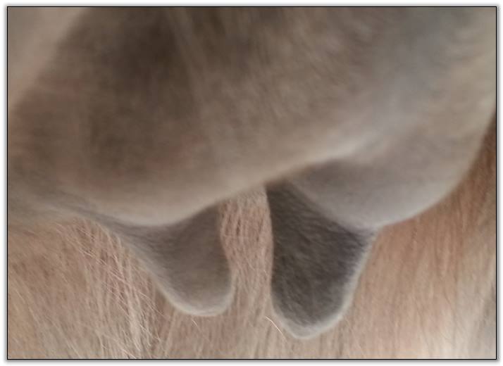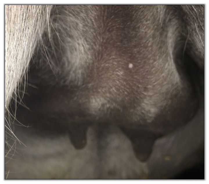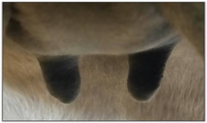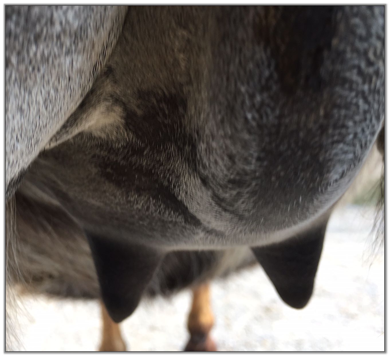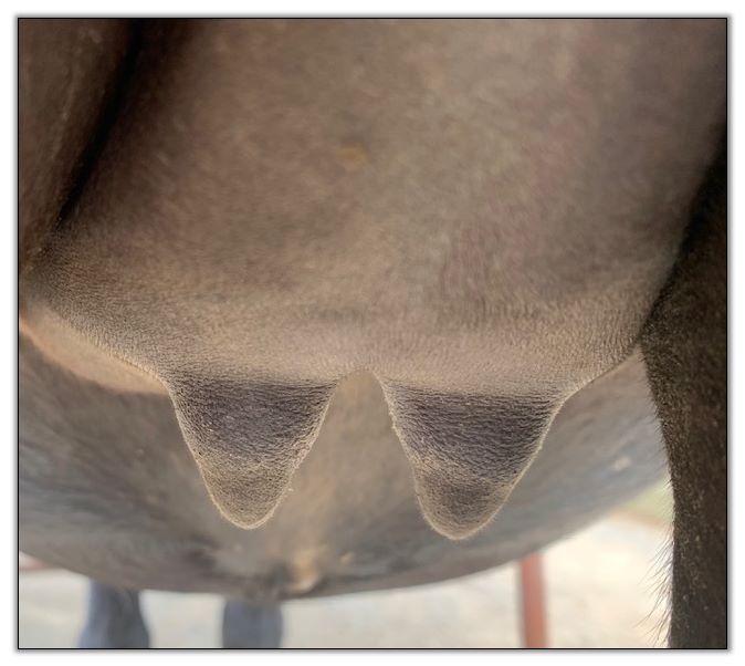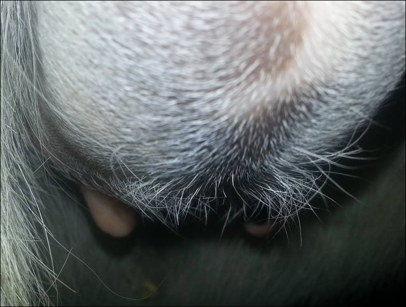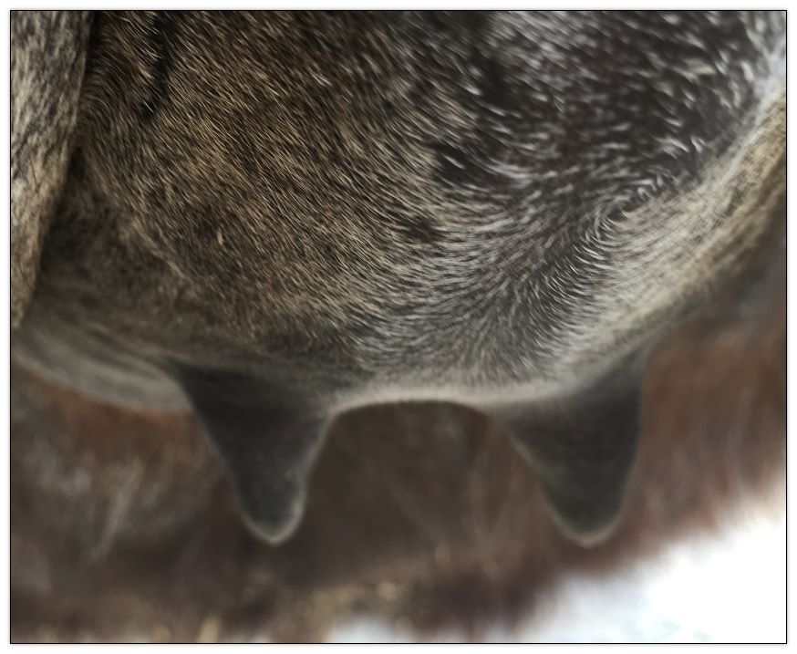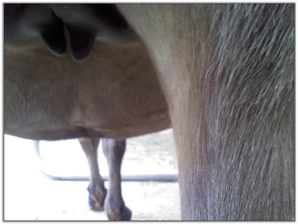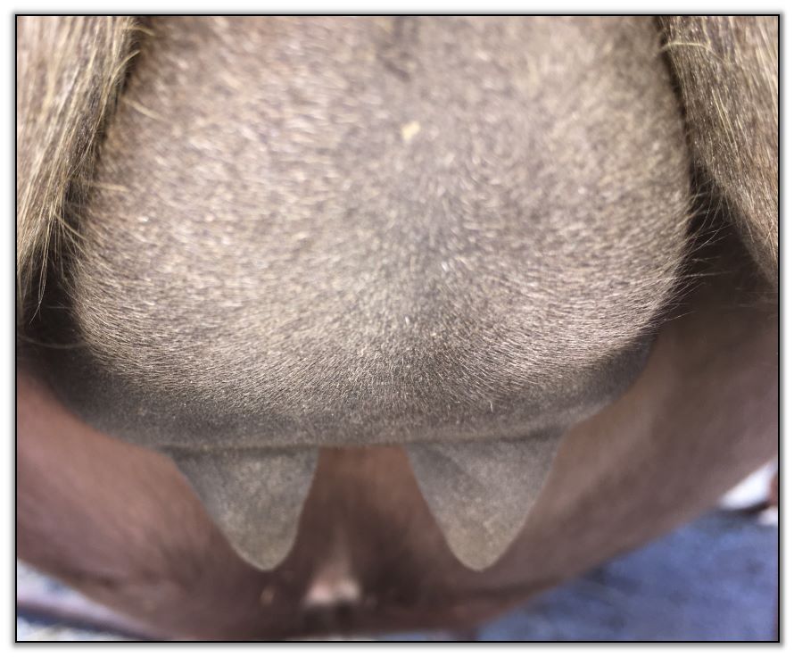 Two hours later and even firmer!! As you can see she is no longer flat but rounding out between her teats. We think she will foal within 24 to 48 hours!