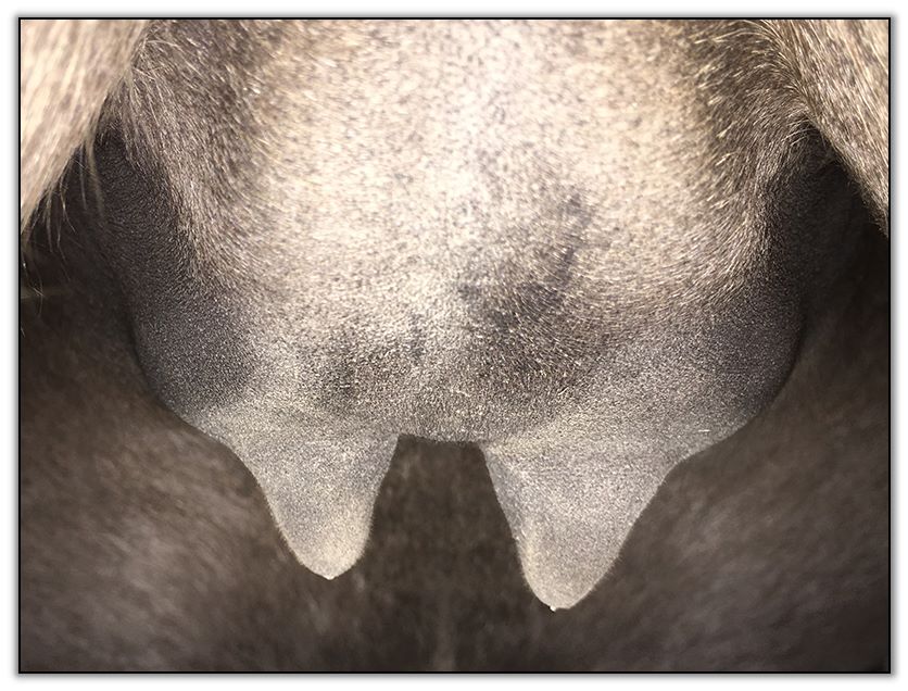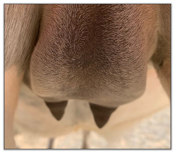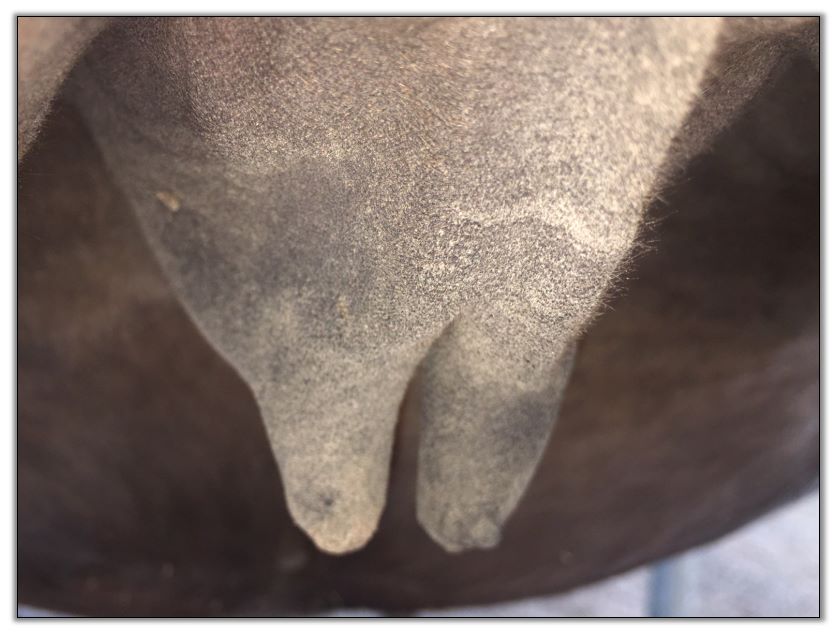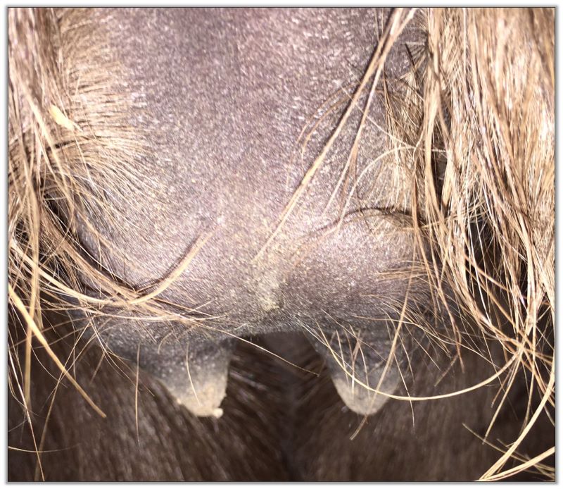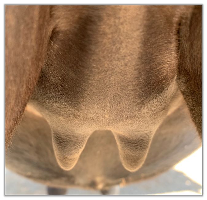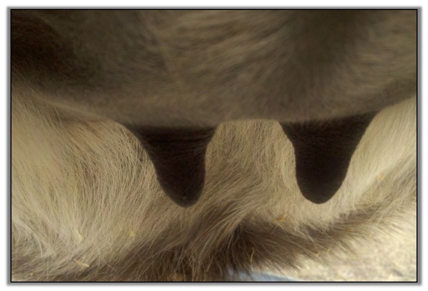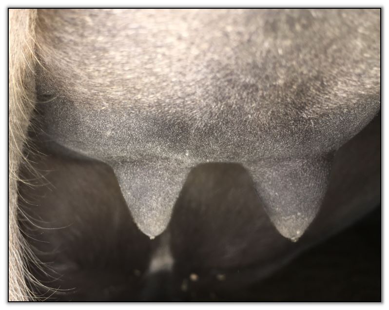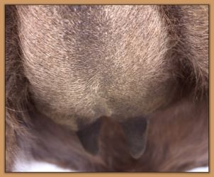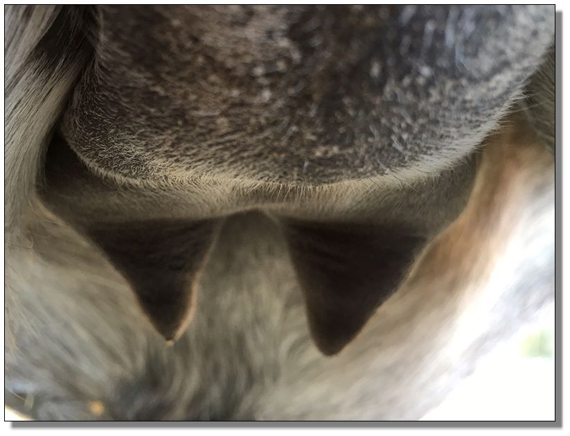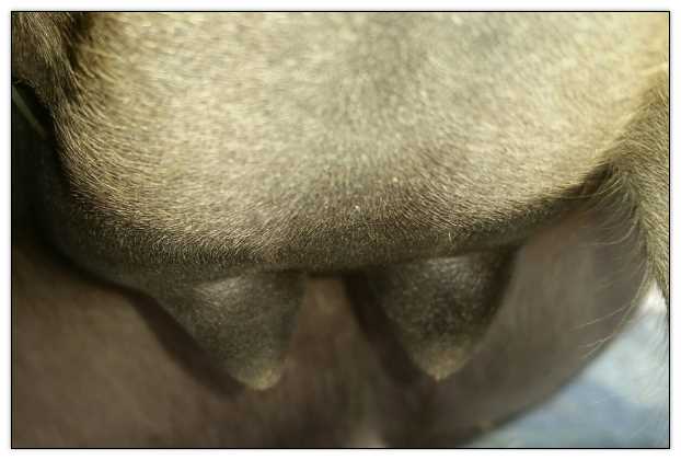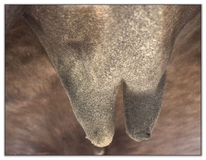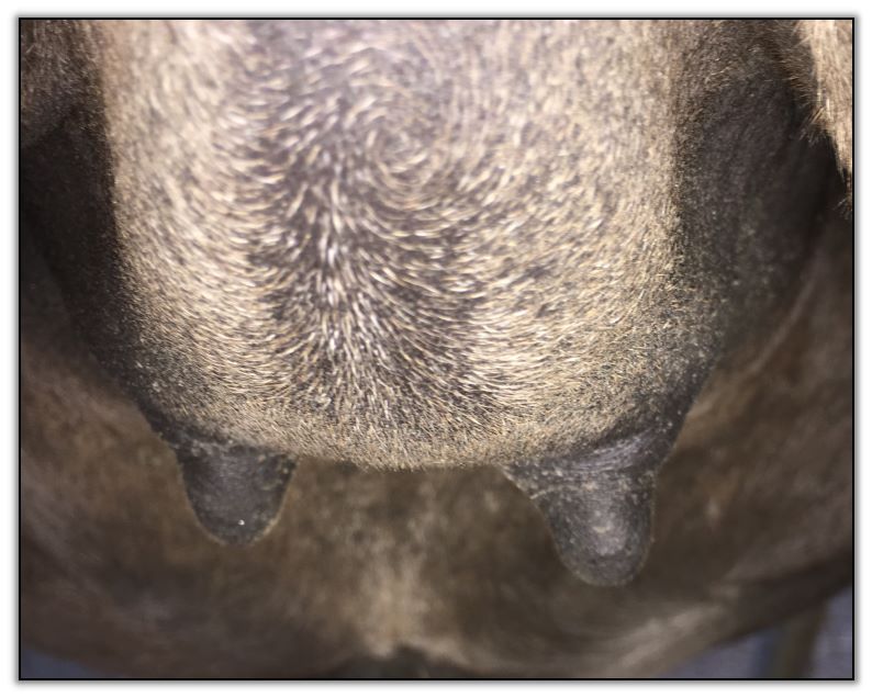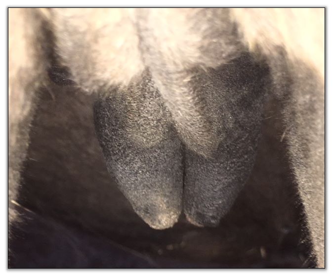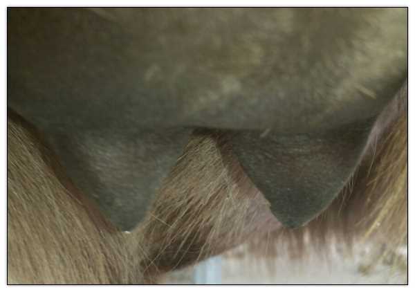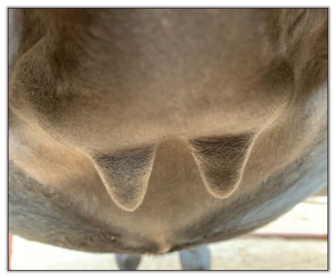 Two hours later and even firmer!! As you can see she is no longer flat but rounding out between her teats. We think she will foal within 24 to 48 hours!