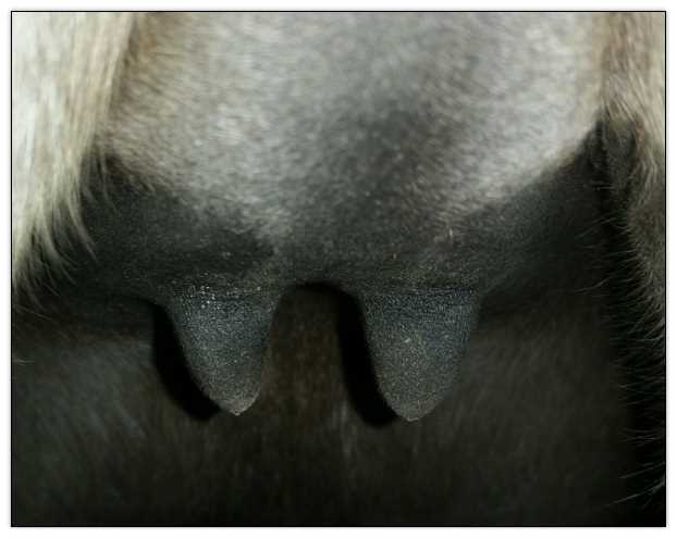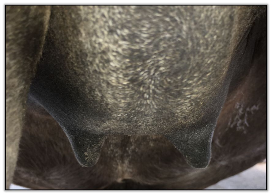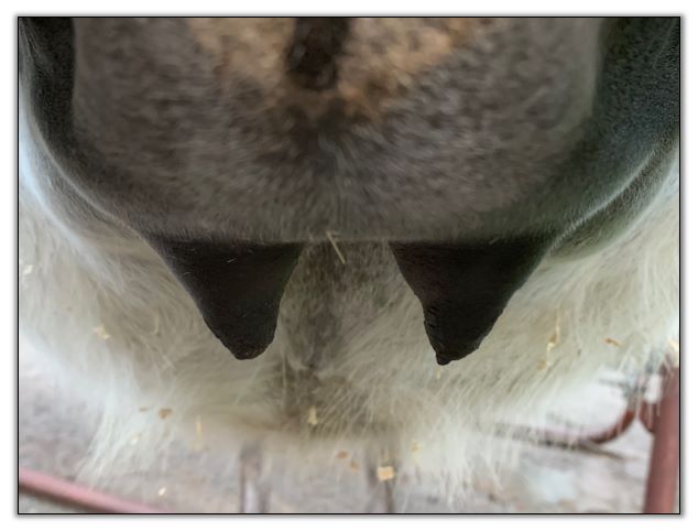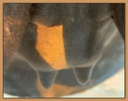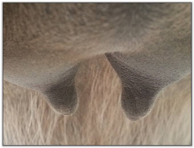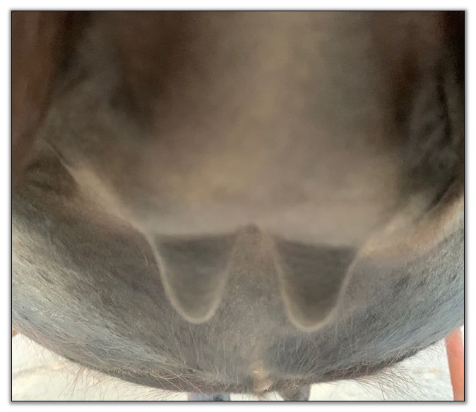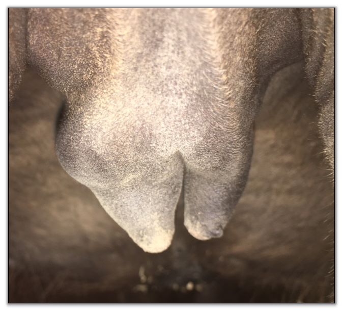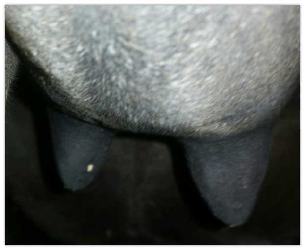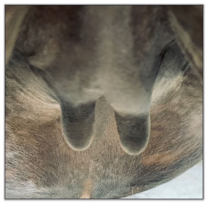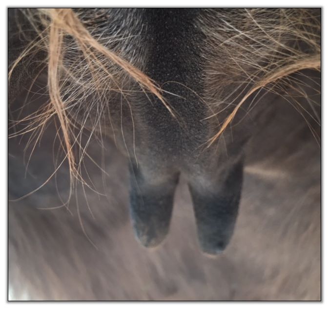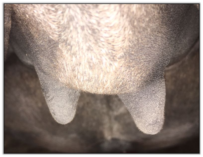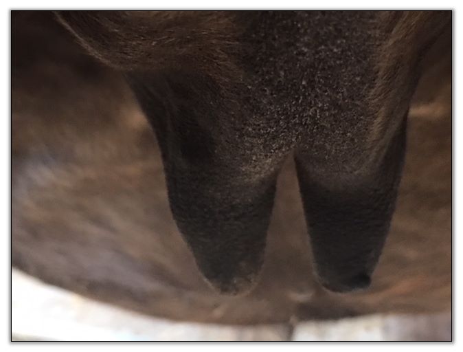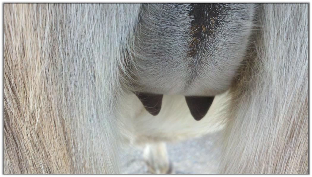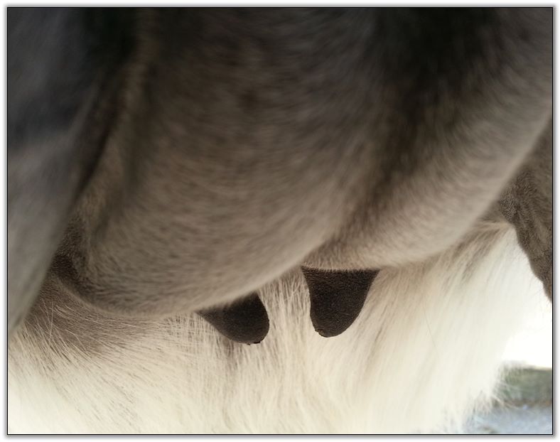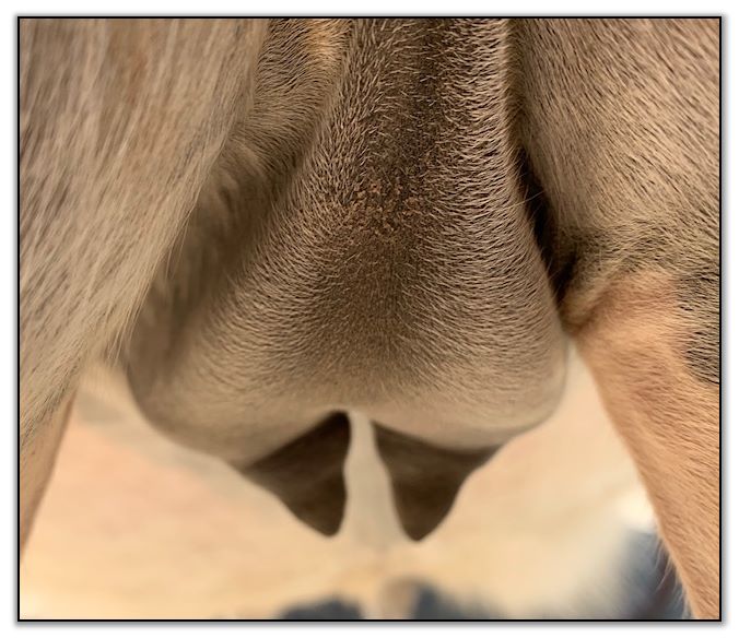 Two hours later and even firmer!! As you can see she is no longer flat but rounding out between her teats. We think she will foal within 24 to 48 hours!