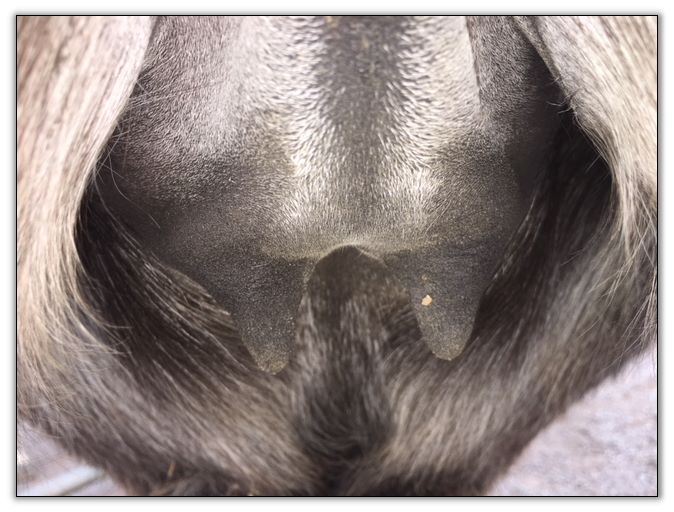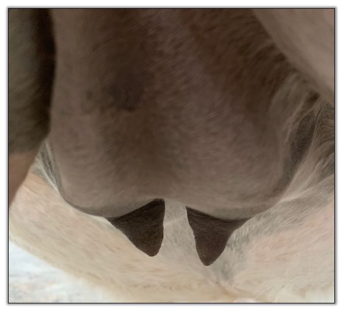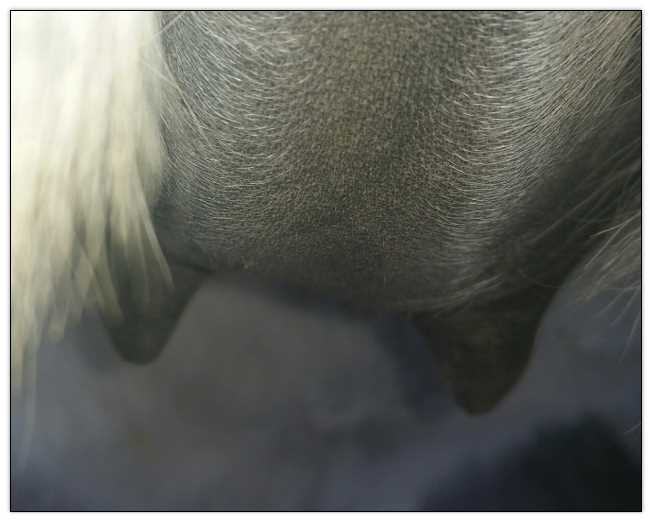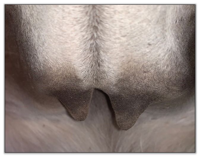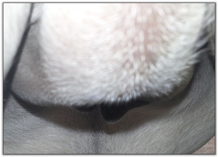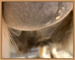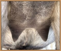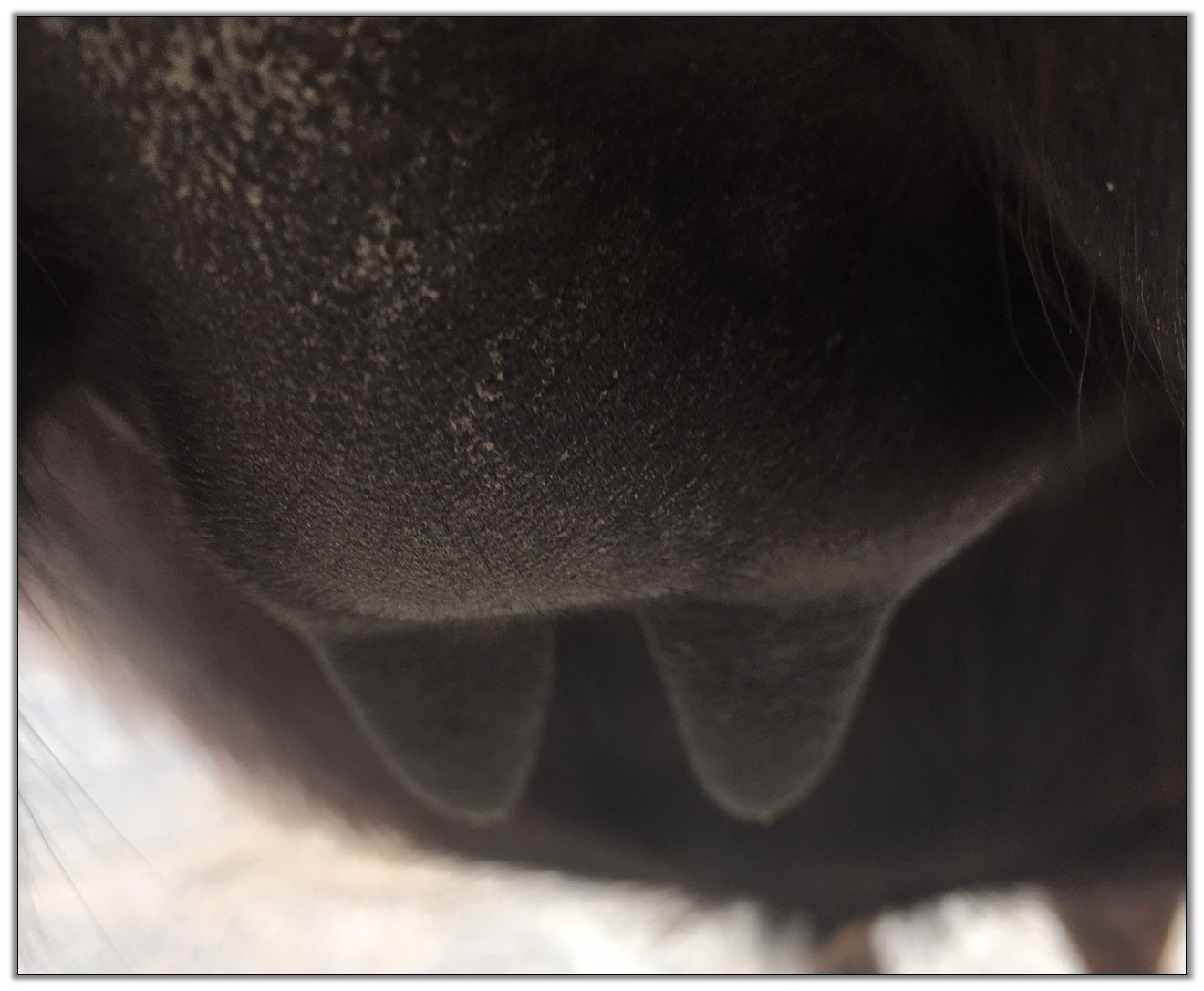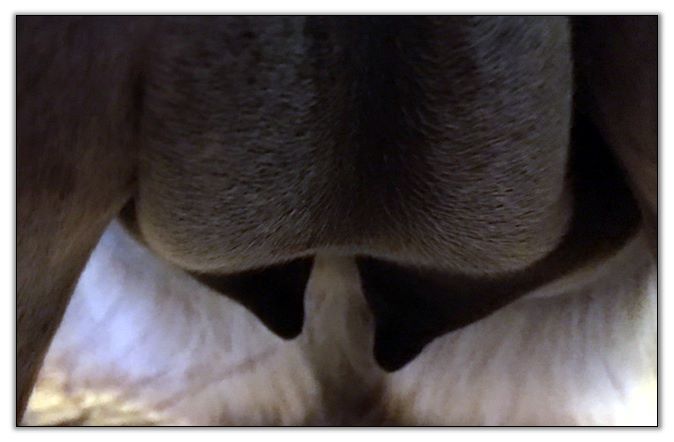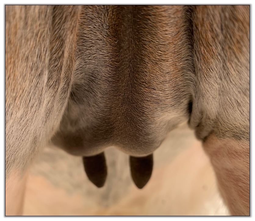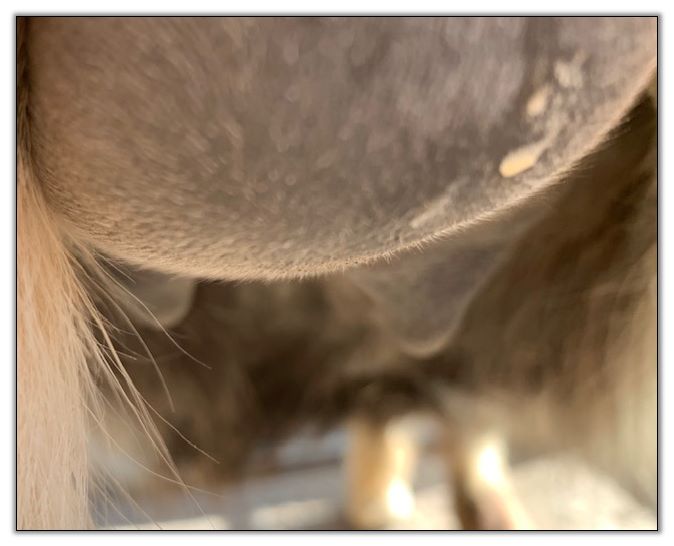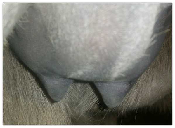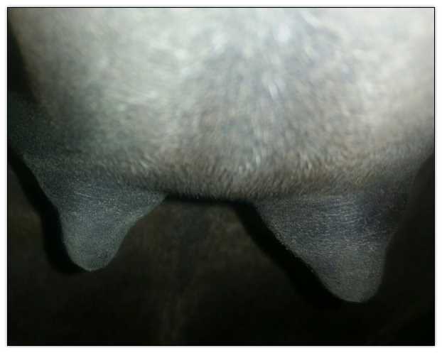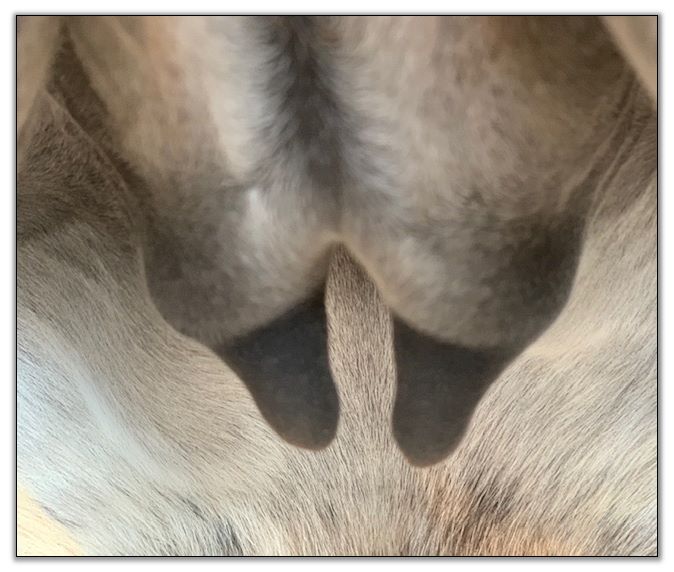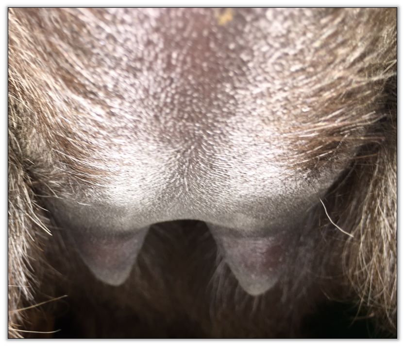 Two hours later and even firmer!! As you can see she is no longer flat but rounding out between her teats. We think she will foal within 24 to 48 hours!