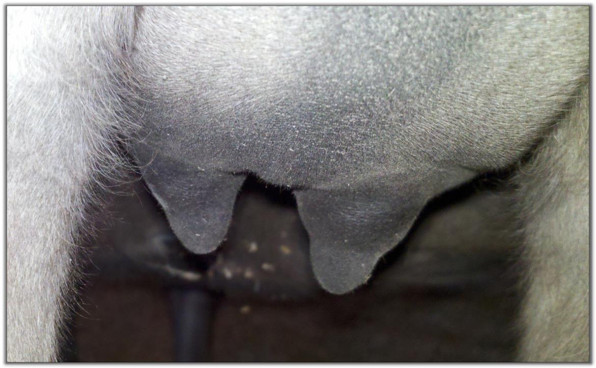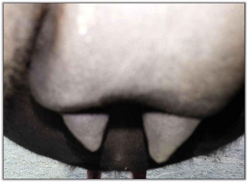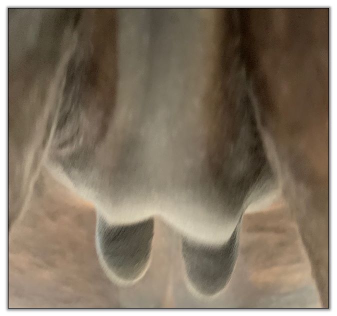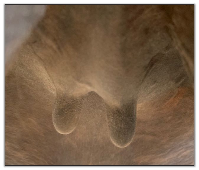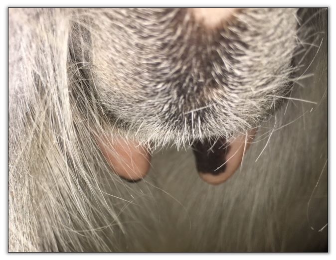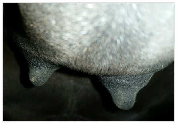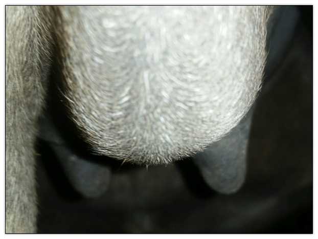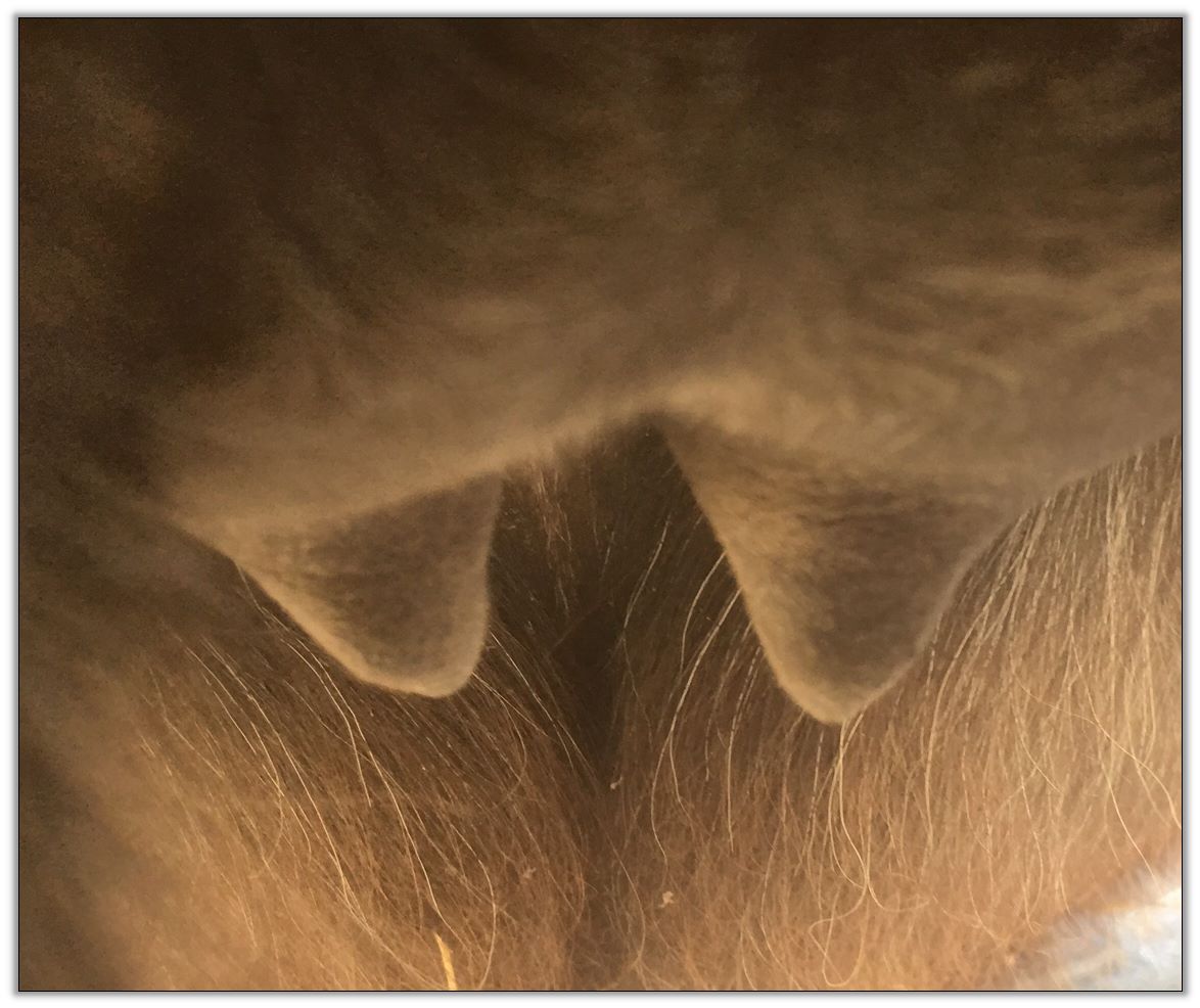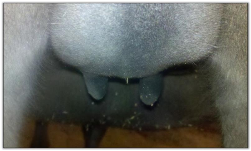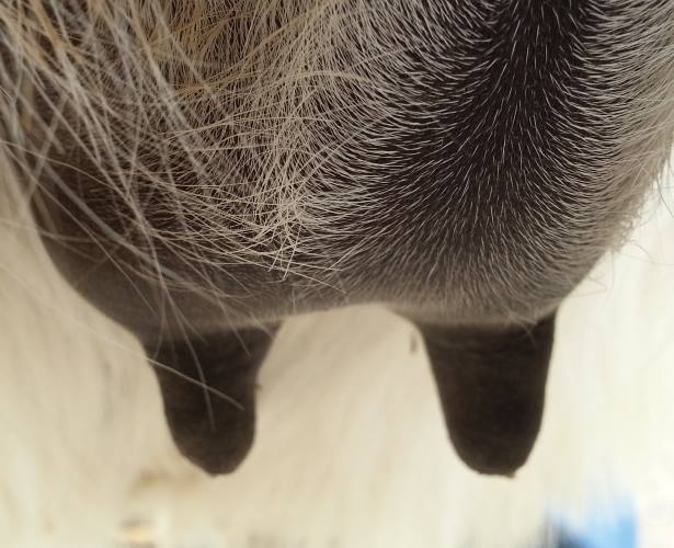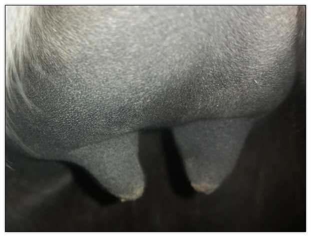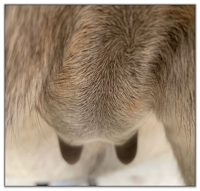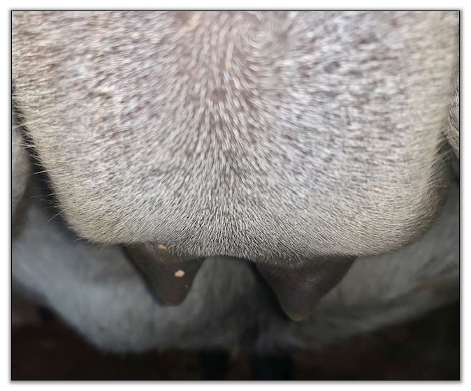 Two hours later and even firmer!! As you can see she is no longer flat but rounding out between her teats. We think she will foal within 24 to 48 hours!
