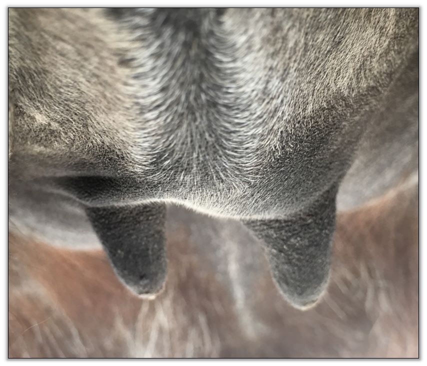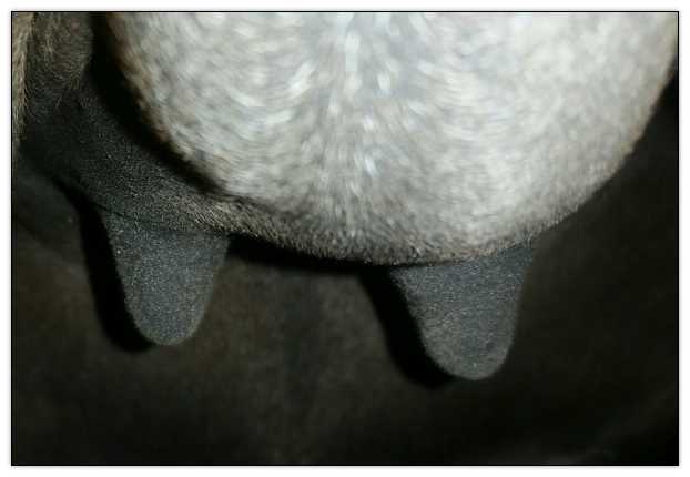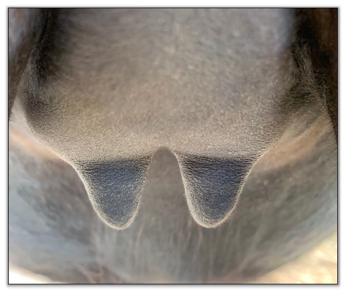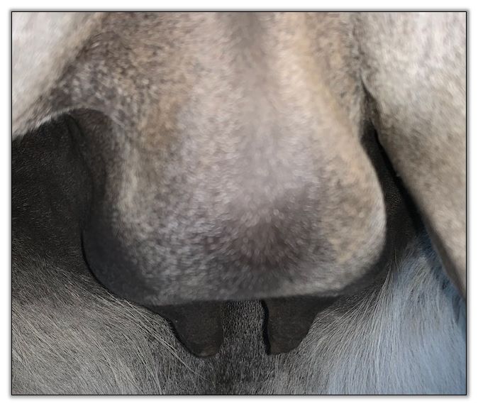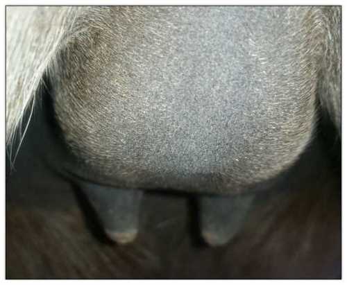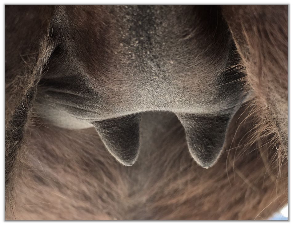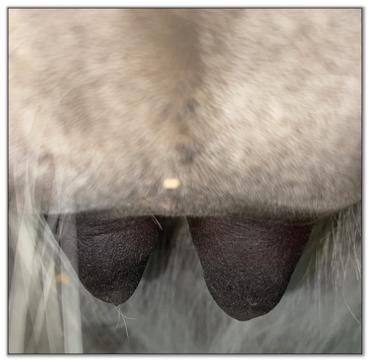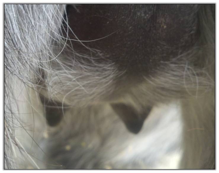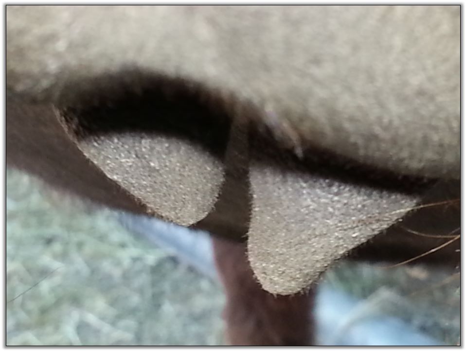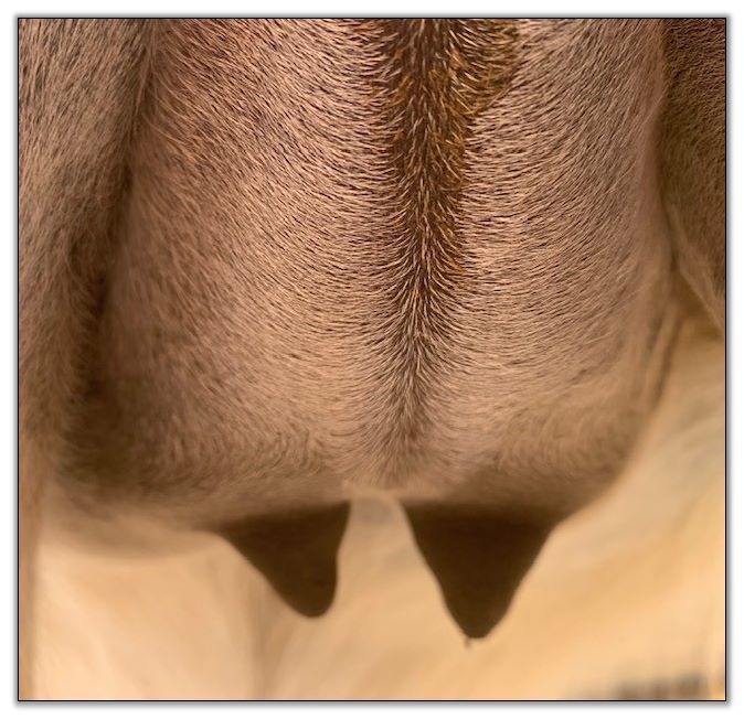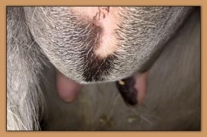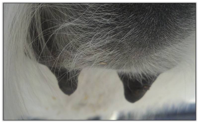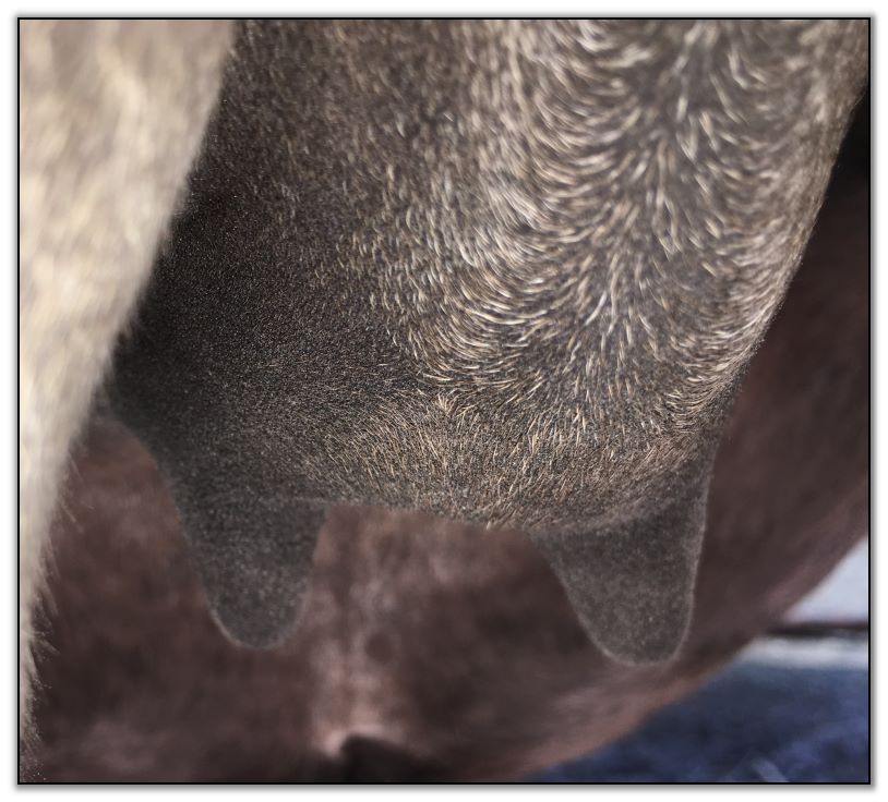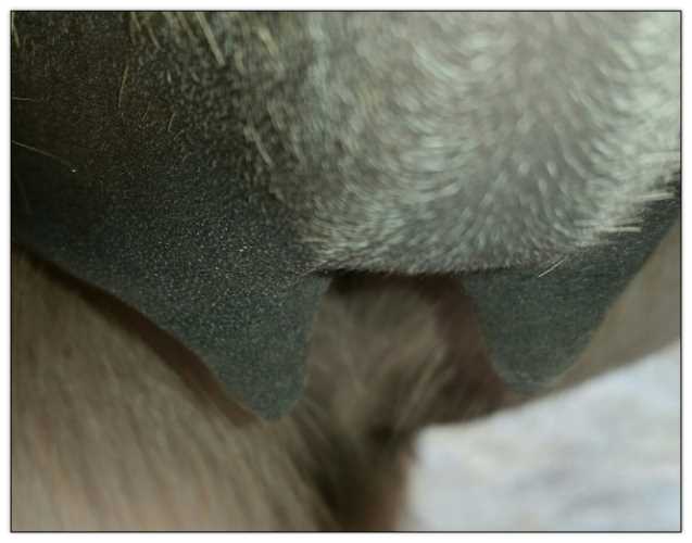 Two hours later and even firmer!! As you can see she is no longer flat but rounding out between her teats. We think she will foal within 24 to 48 hours!