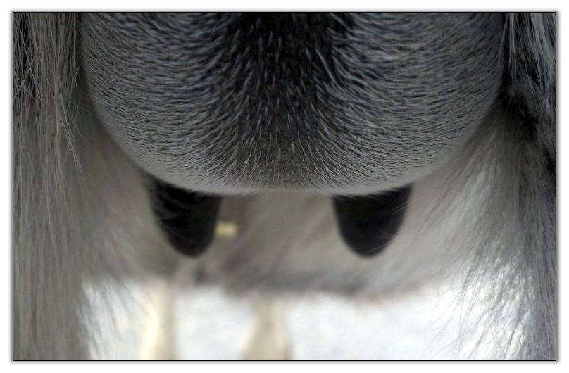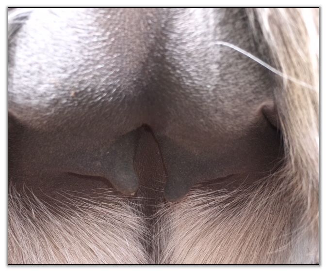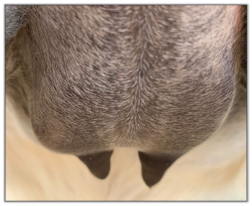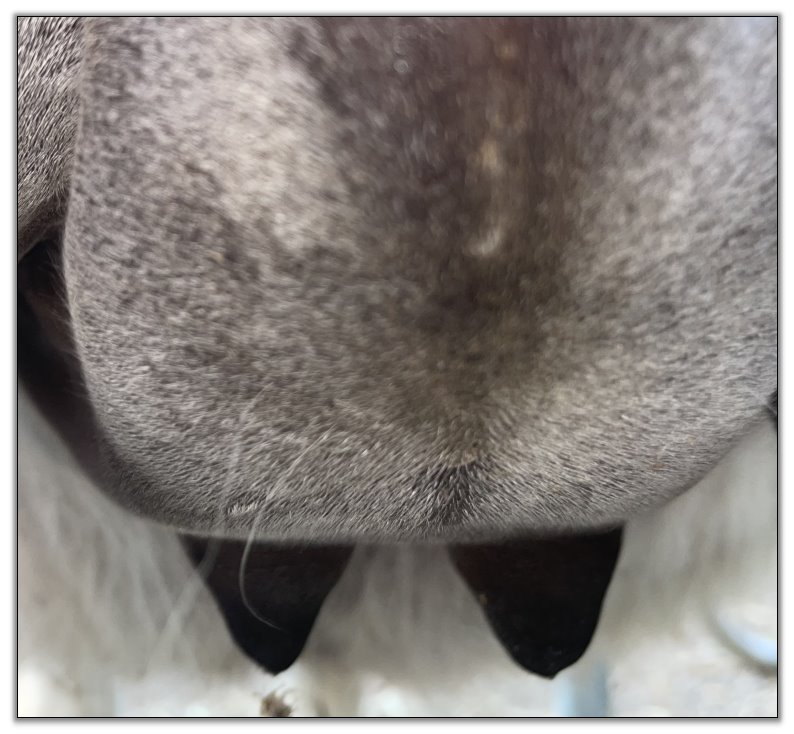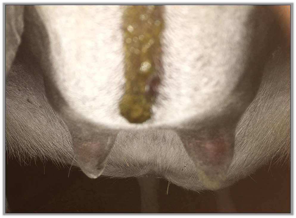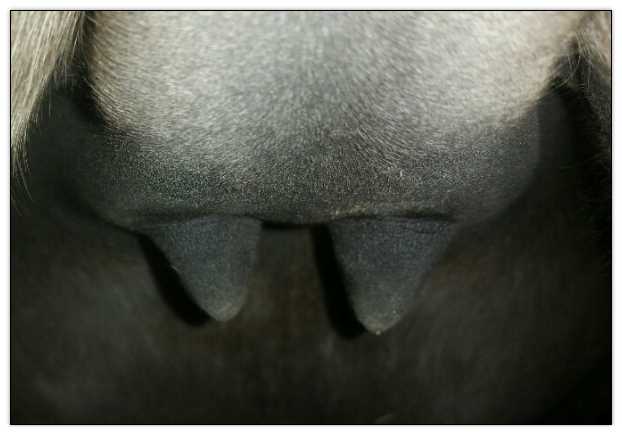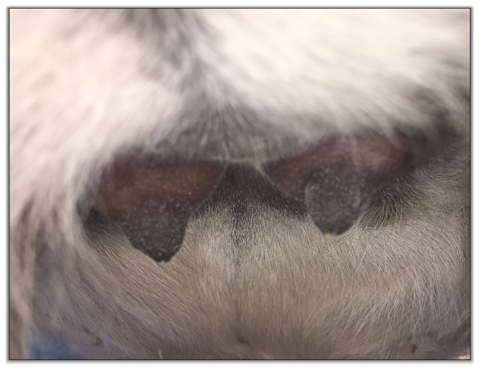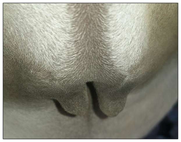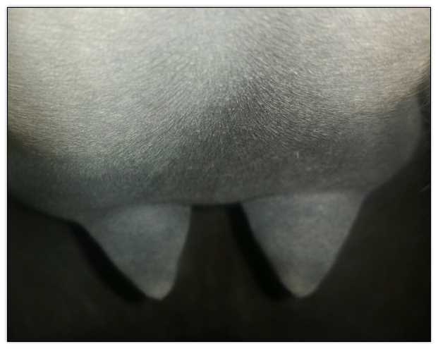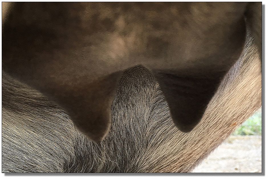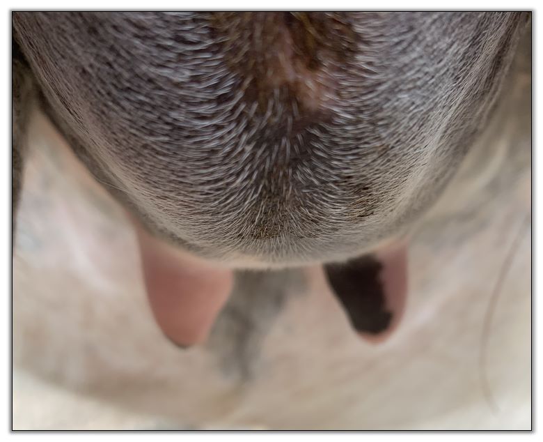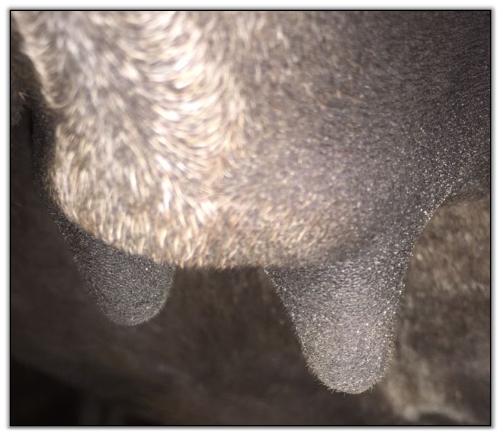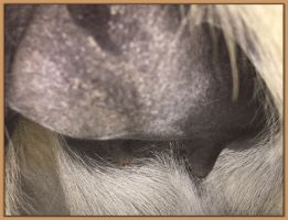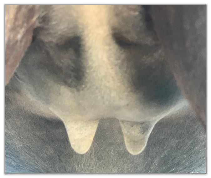 Two hours later and even firmer!! As you can see she is no longer flat but rounding out between her teats. We think she will foal within 24 to 48 hours!