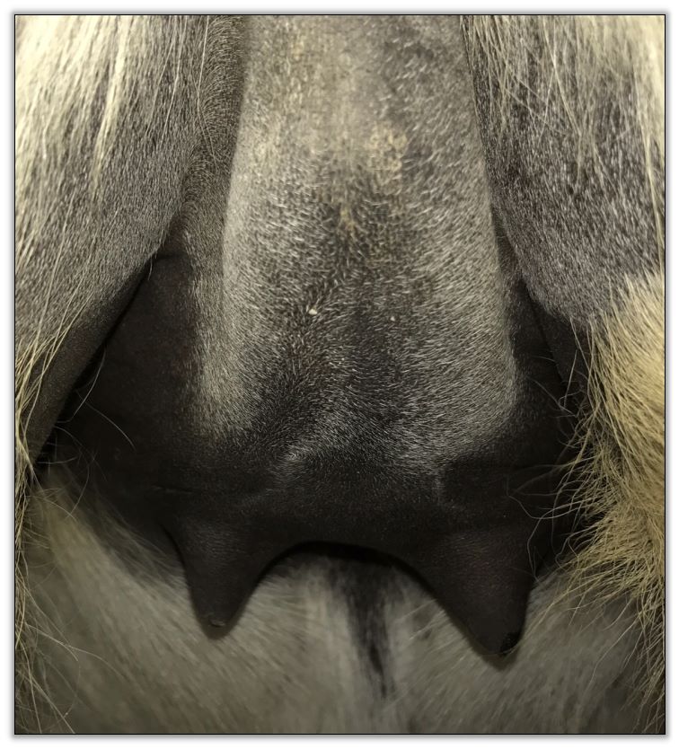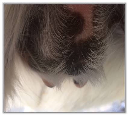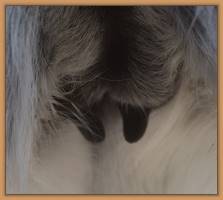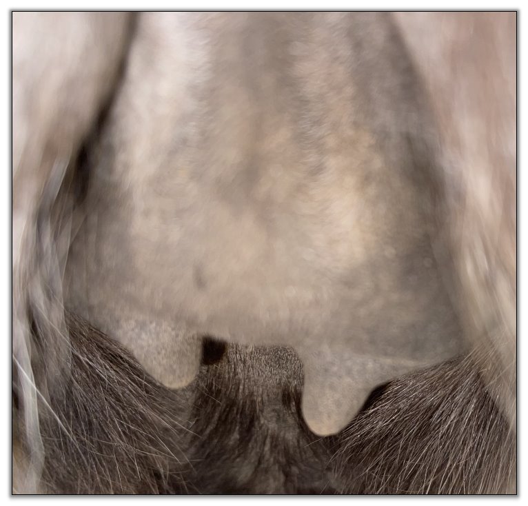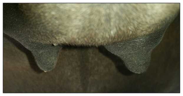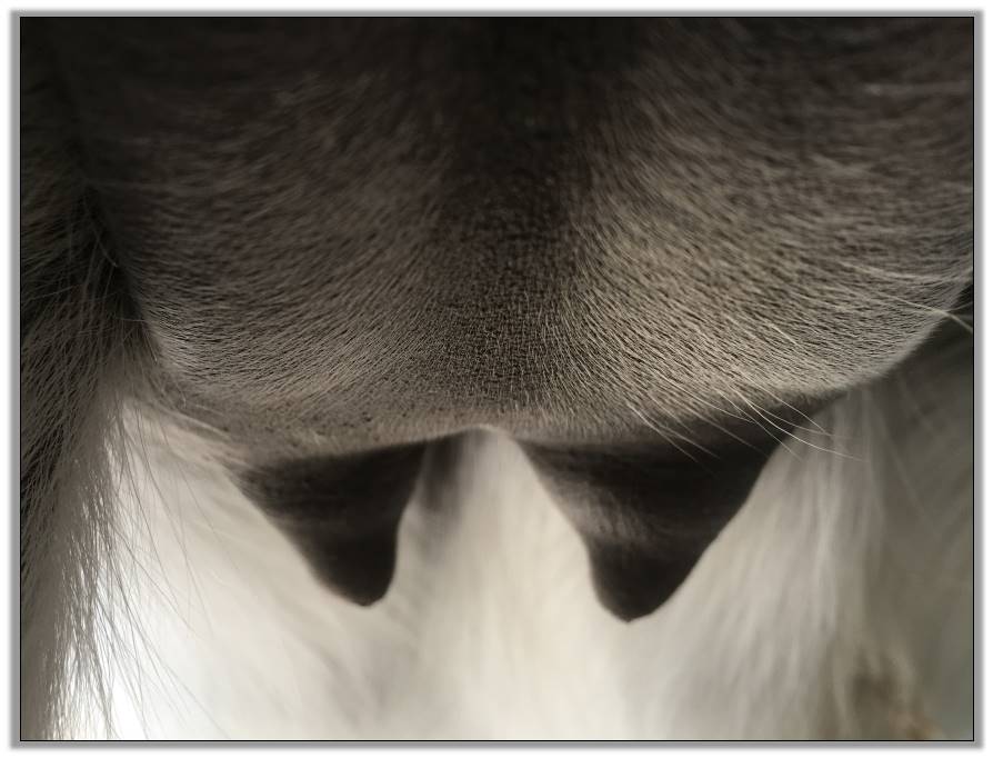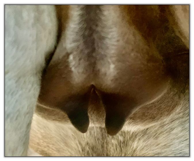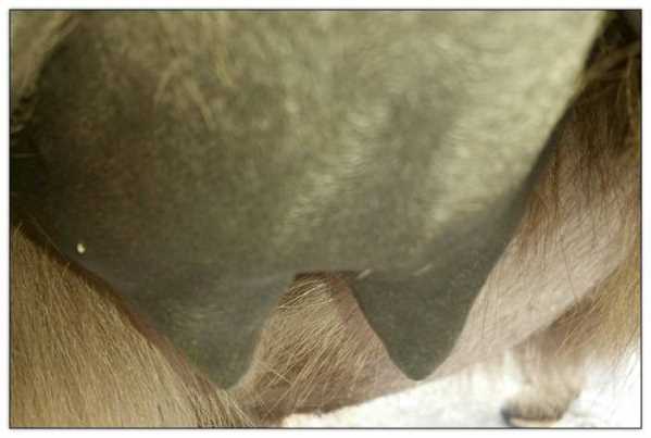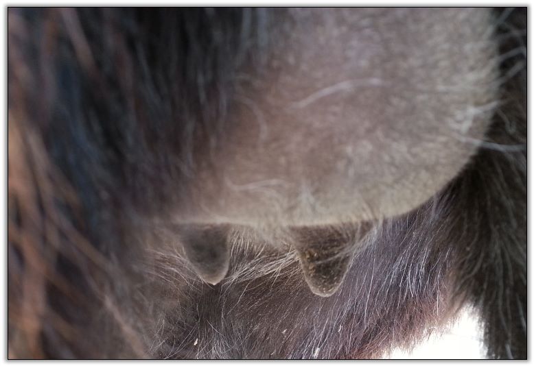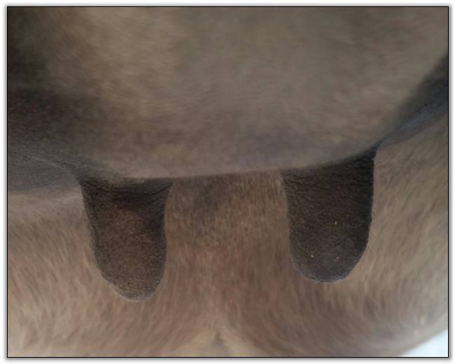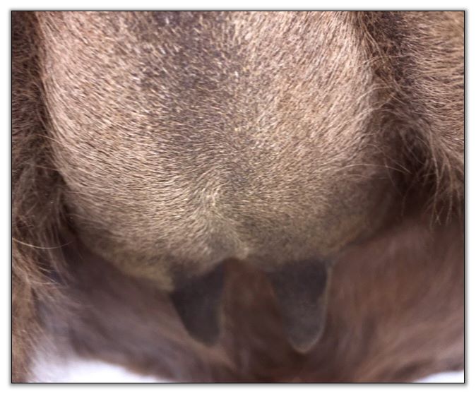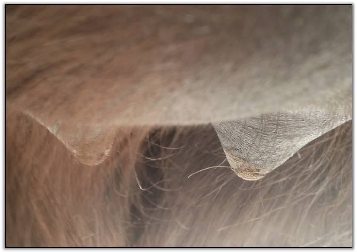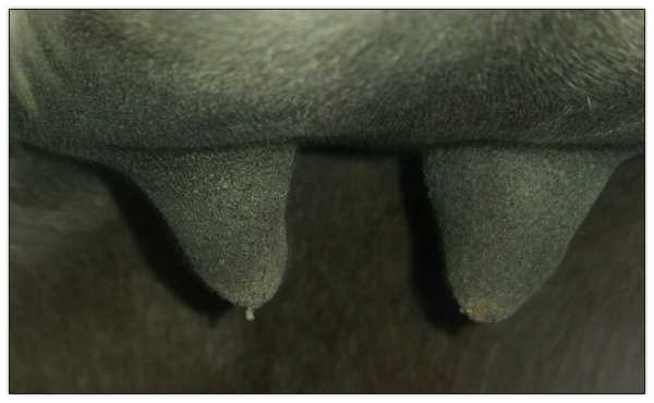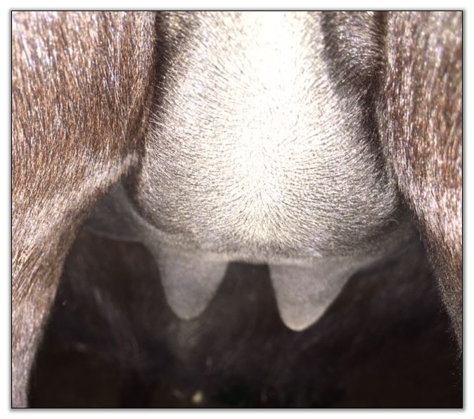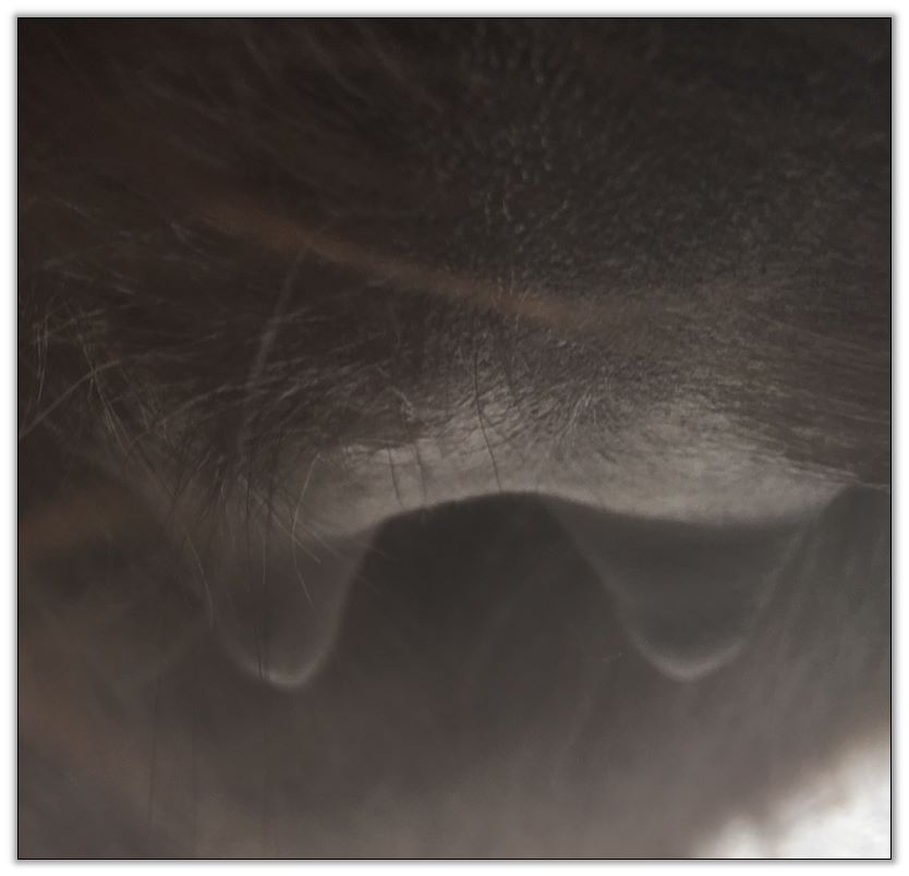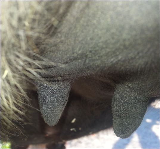 Two hours later and even firmer!! As you can see she is no longer flat but rounding out between her teats. We think she will foal within 24 to 48 hours!