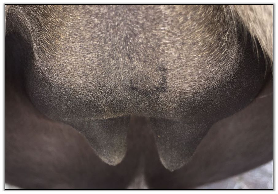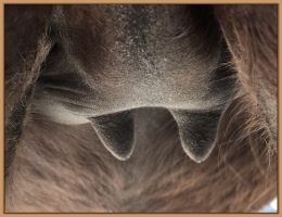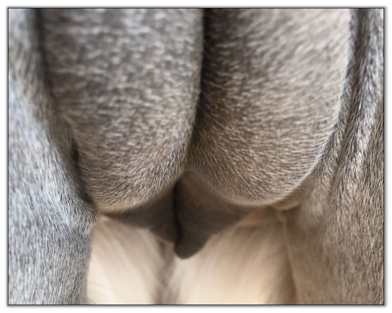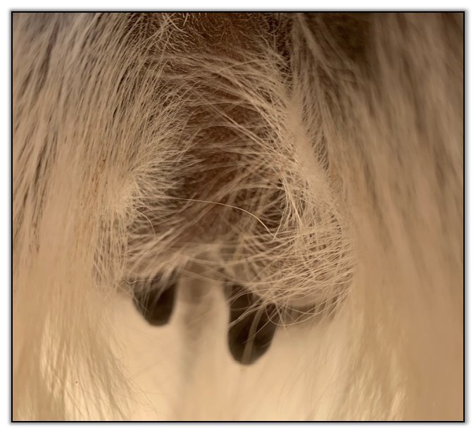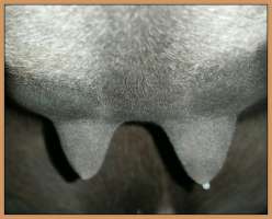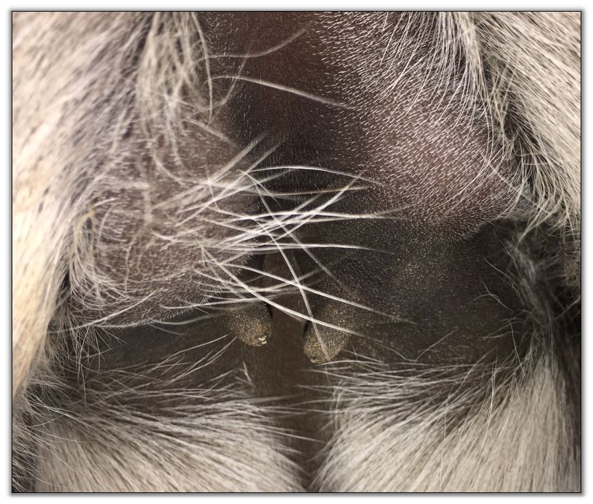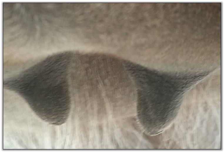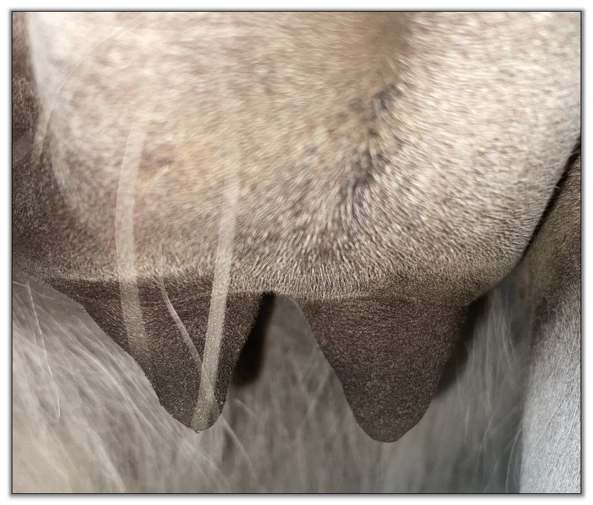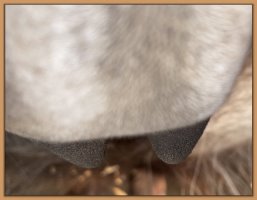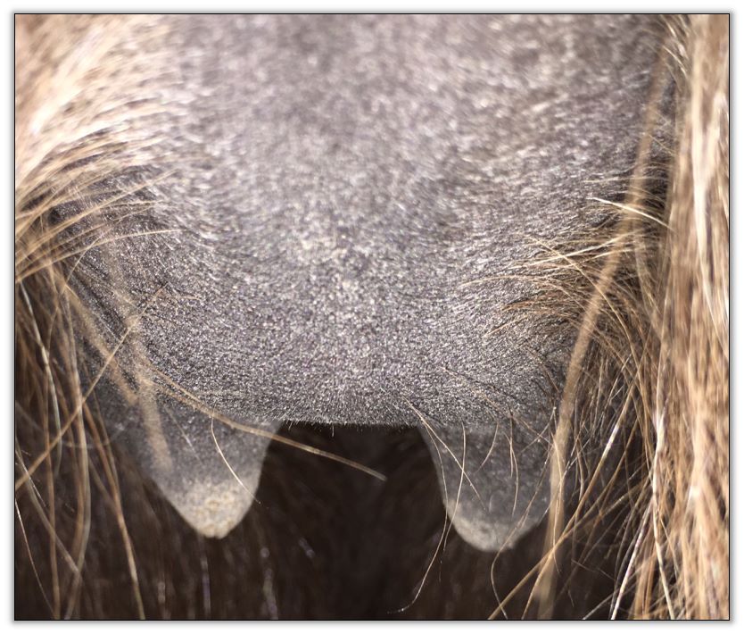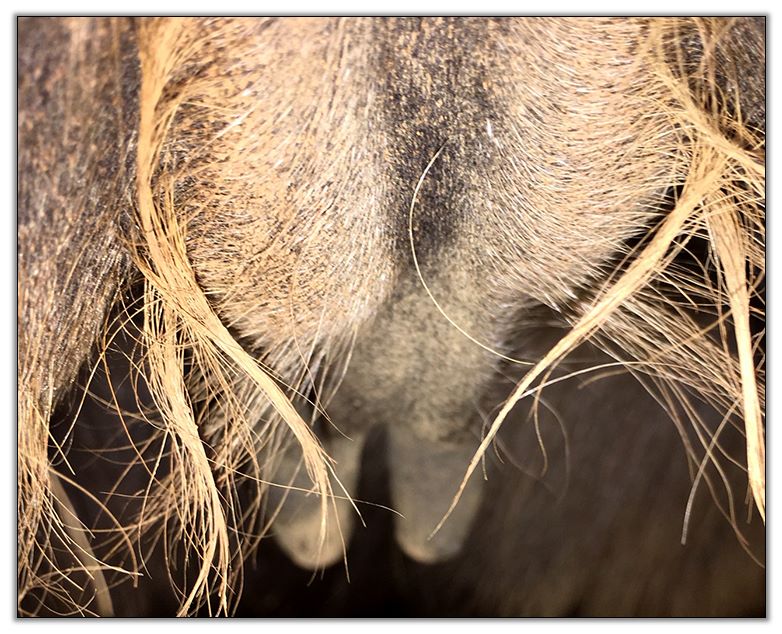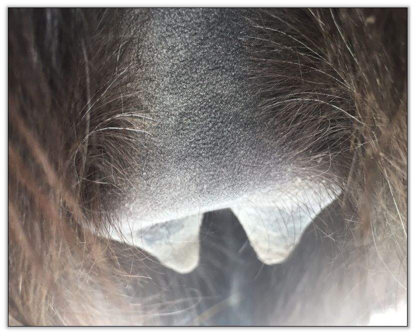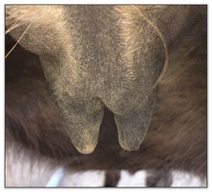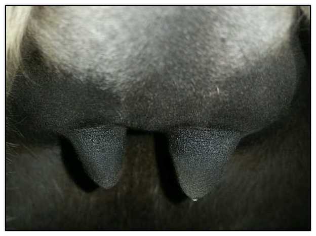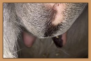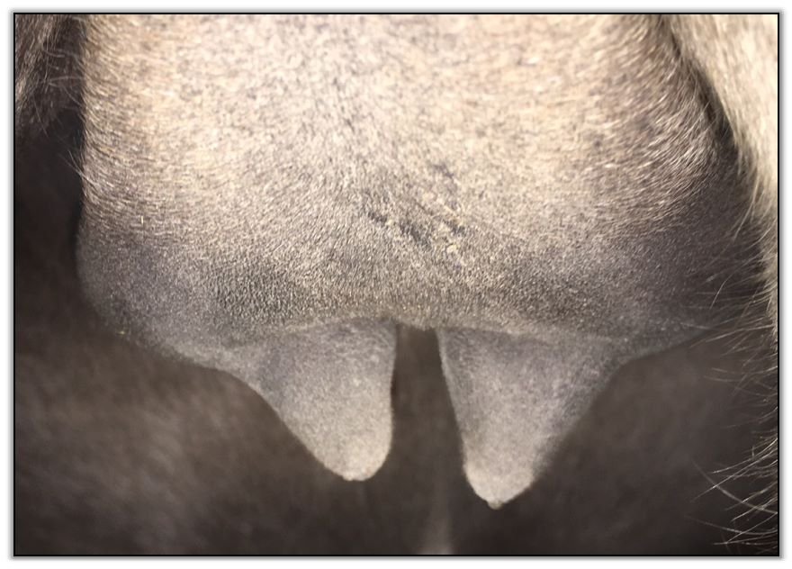 Two hours later and even firmer!! As you can see she is no longer flat but rounding out between her teats. We think she will foal within 24 to 48 hours!