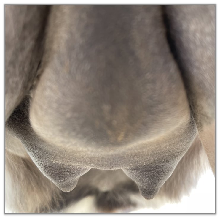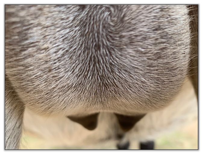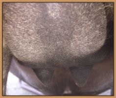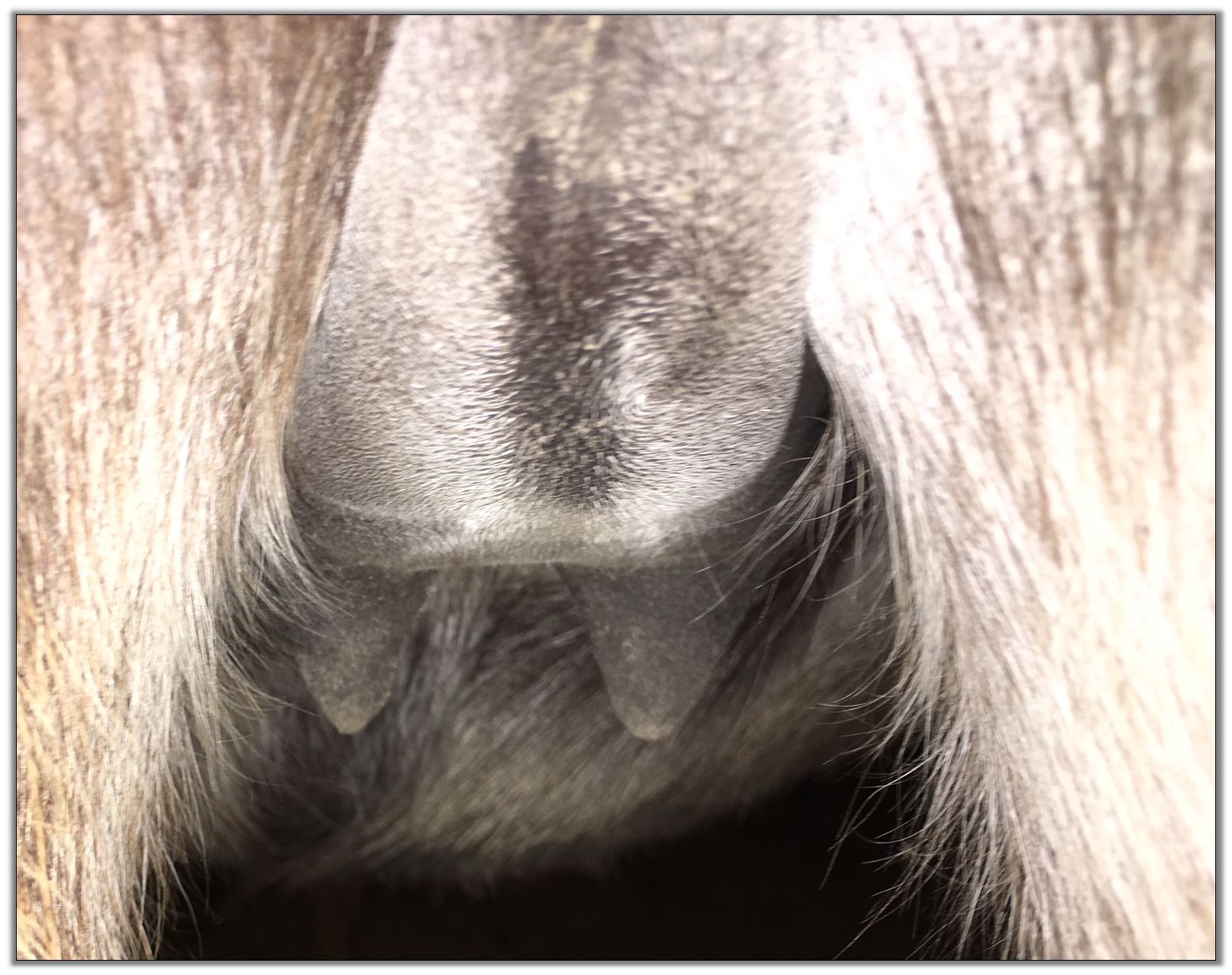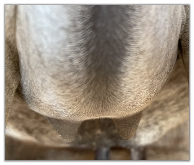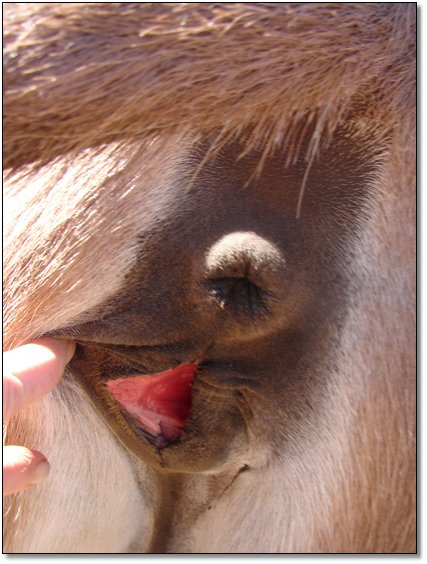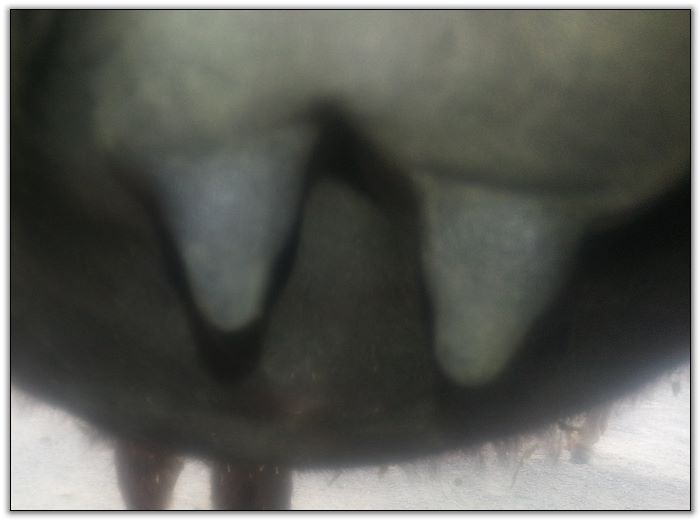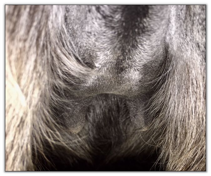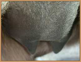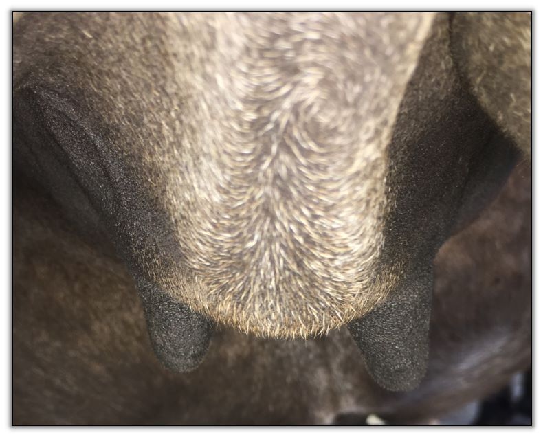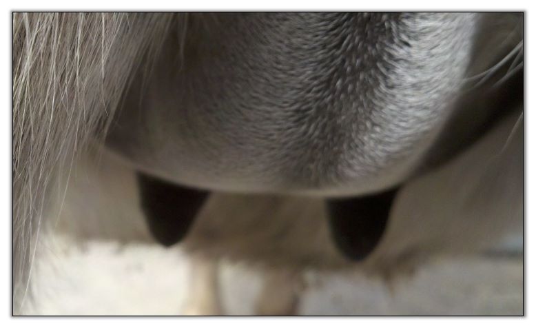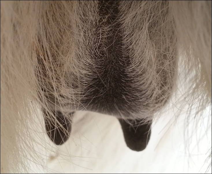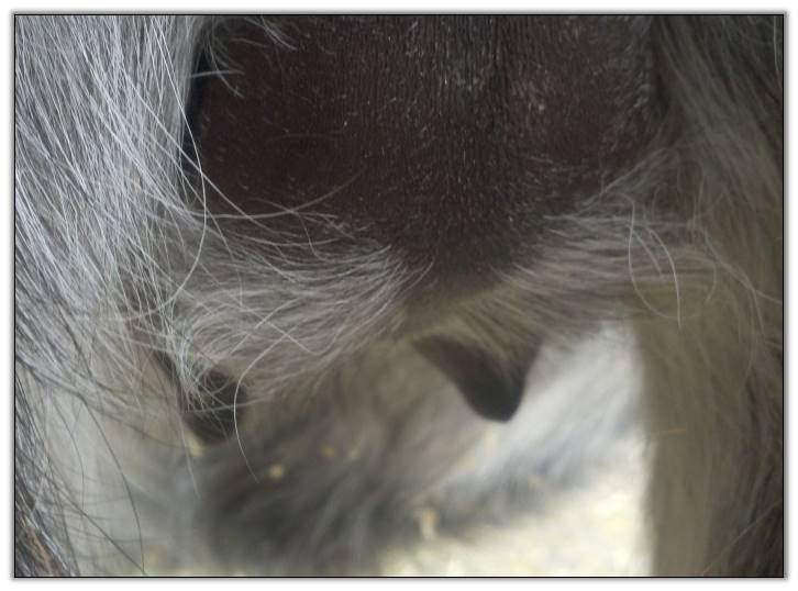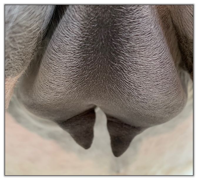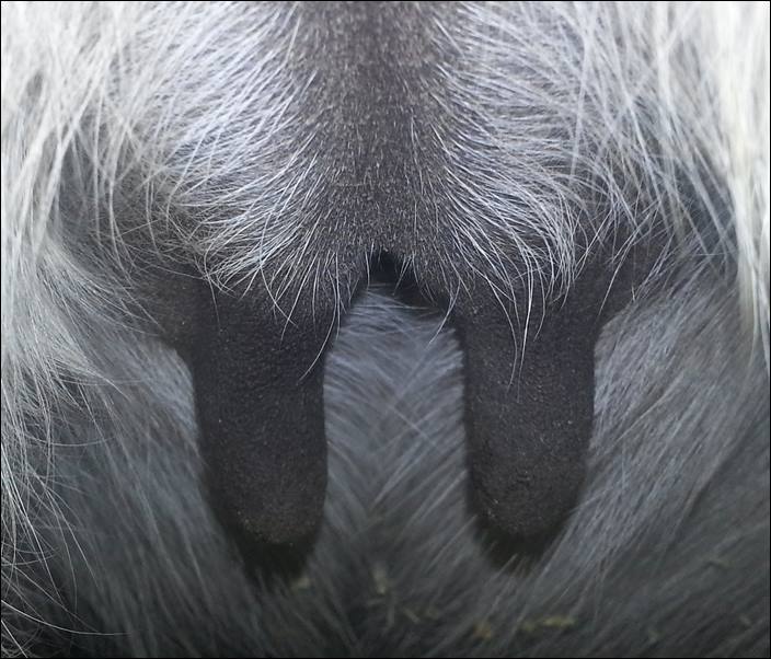 Two hours later and even firmer!! As you can see she is no longer flat but rounding out between her teats. We think she will foal within 24 to 48 hours!