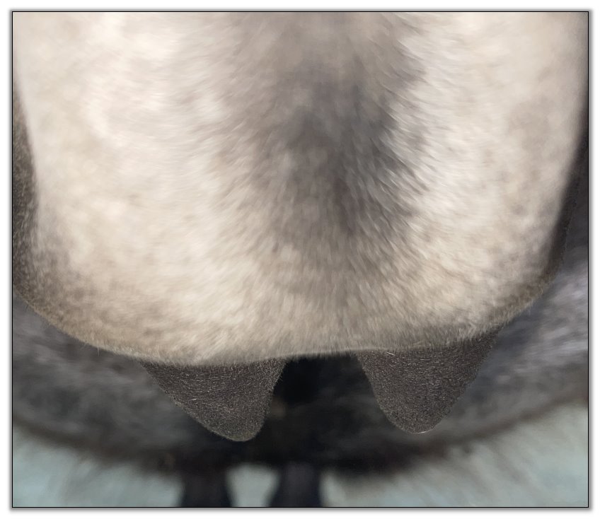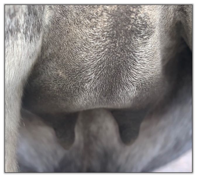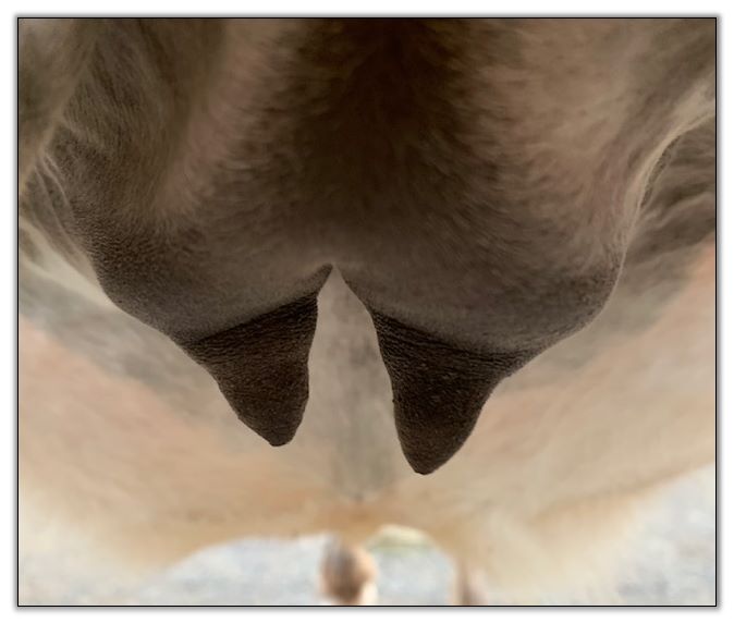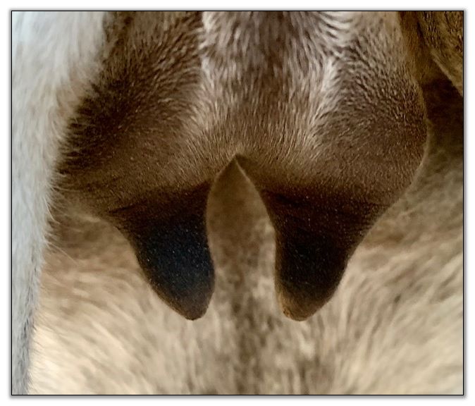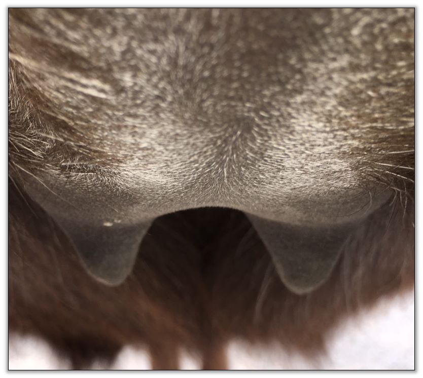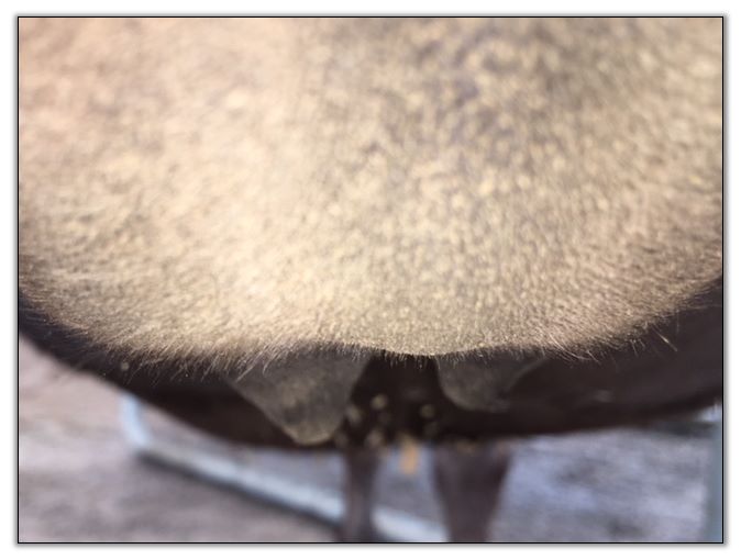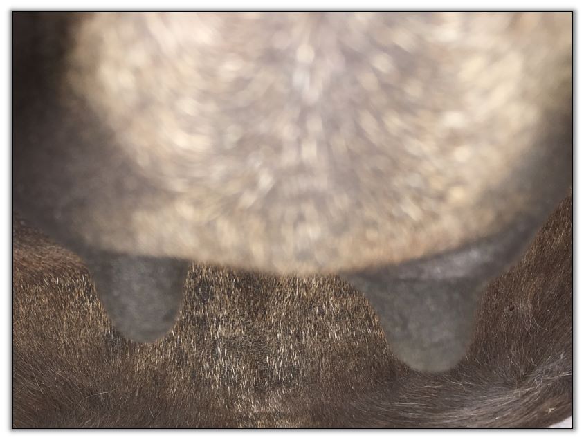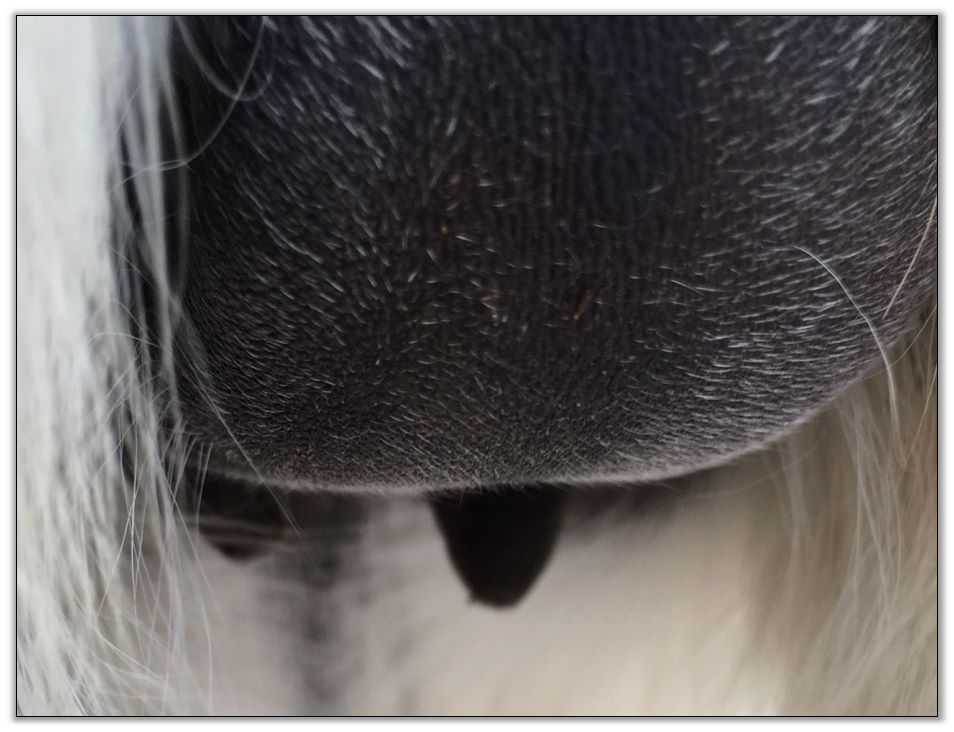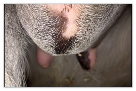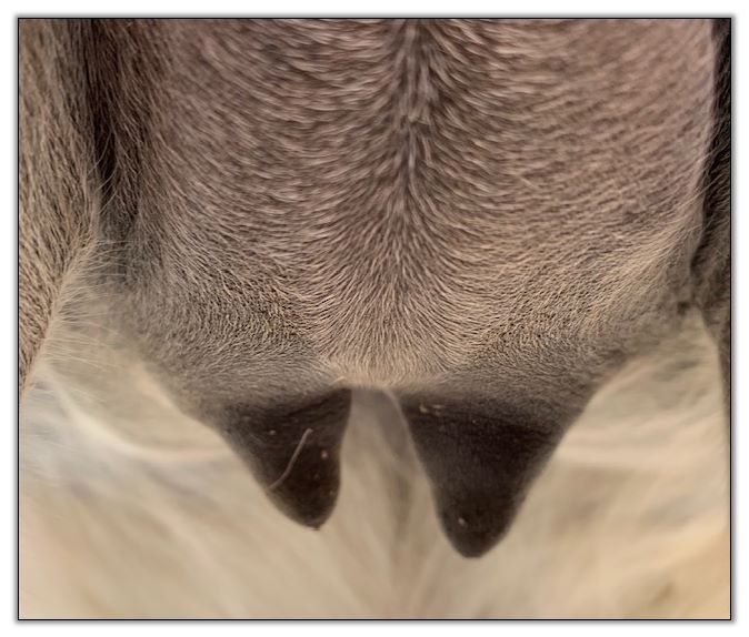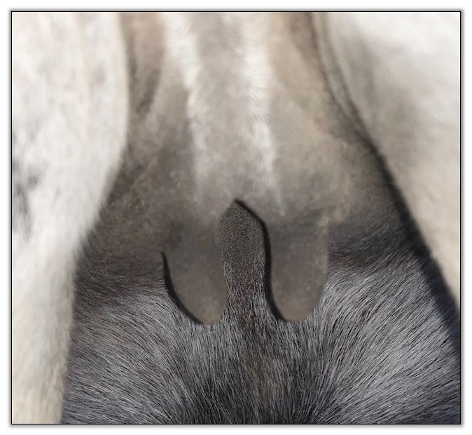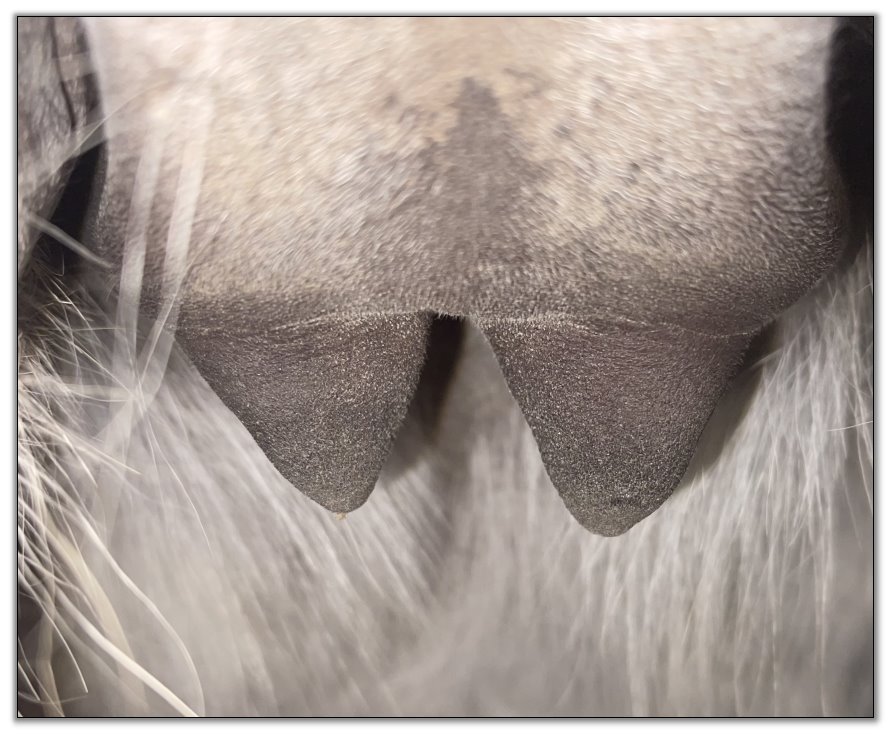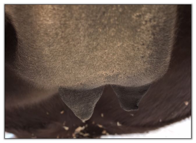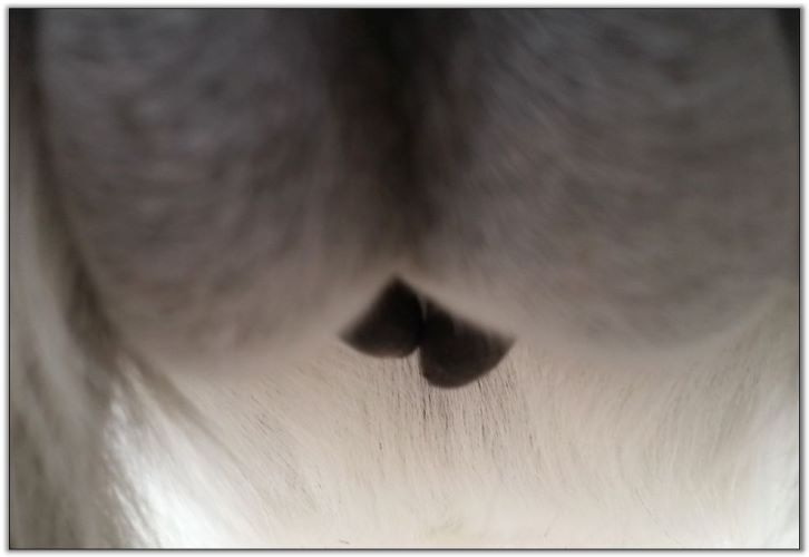 Two hours later and even firmer!! As you can see she is no longer flat but rounding out between her teats. We think she will foal within 24 to 48 hours!