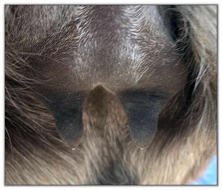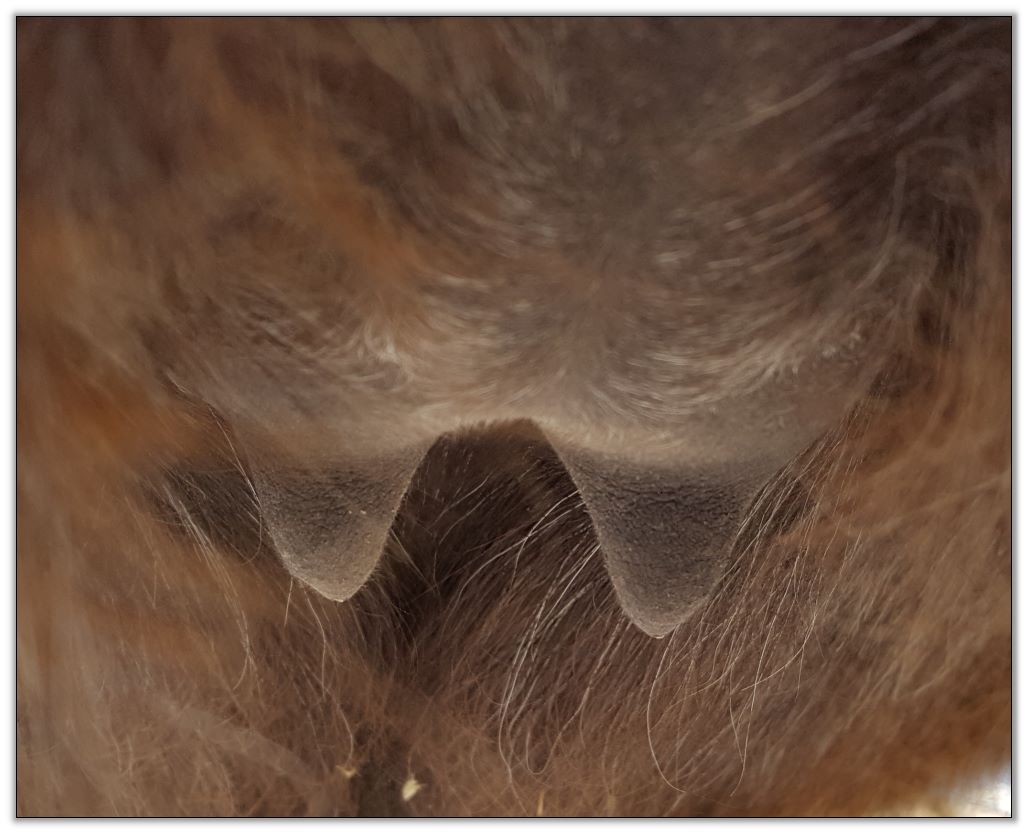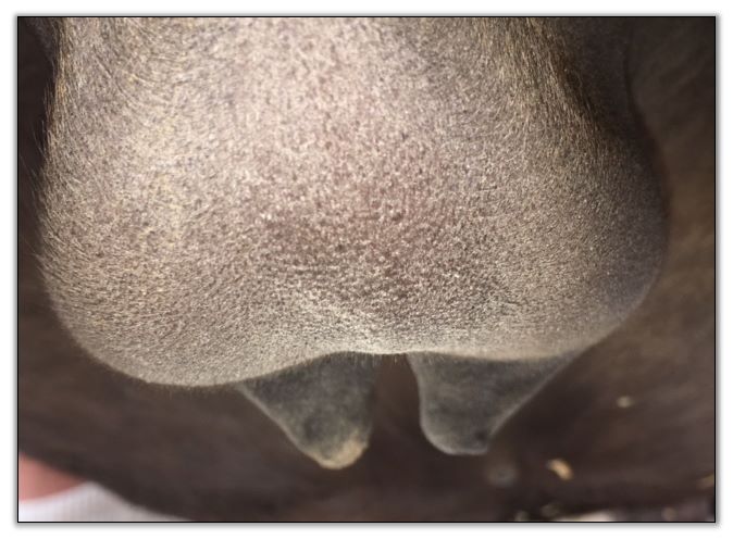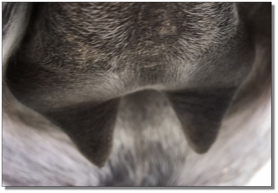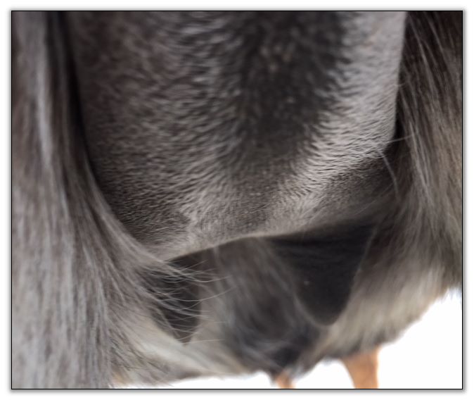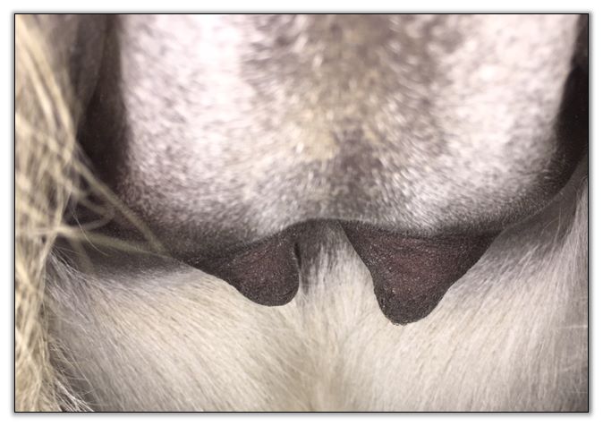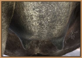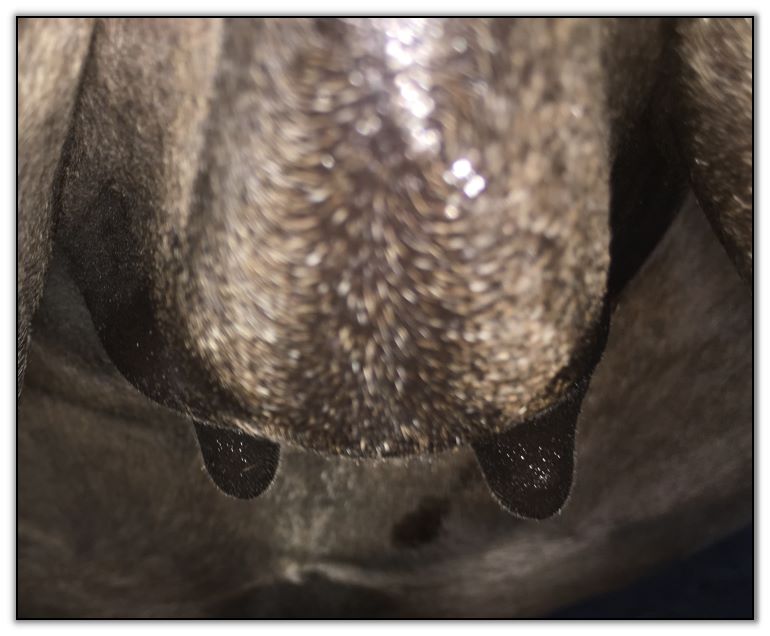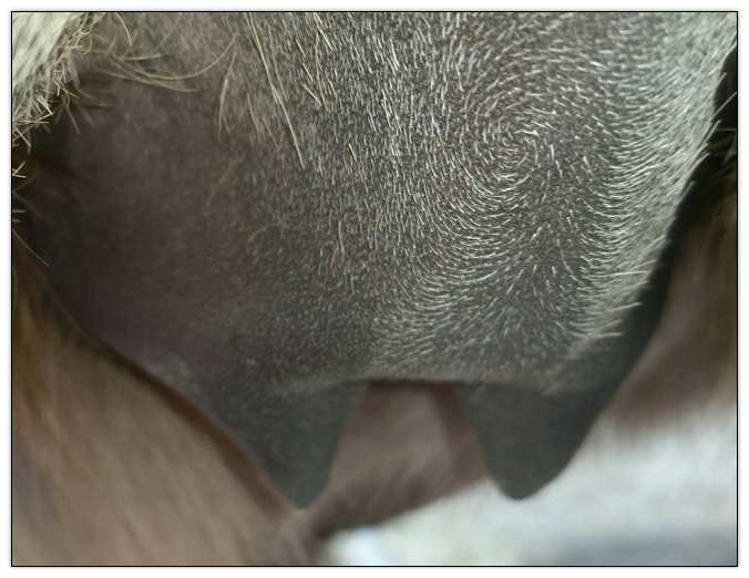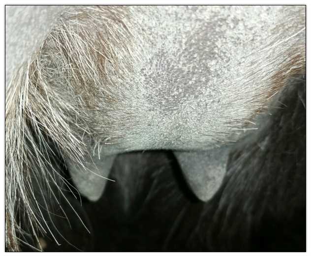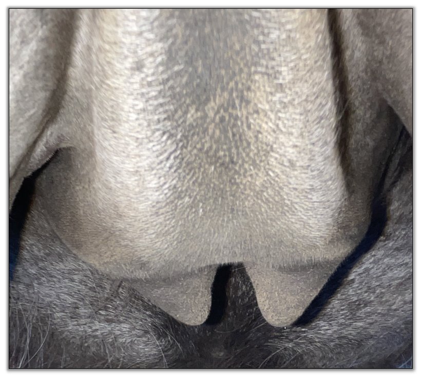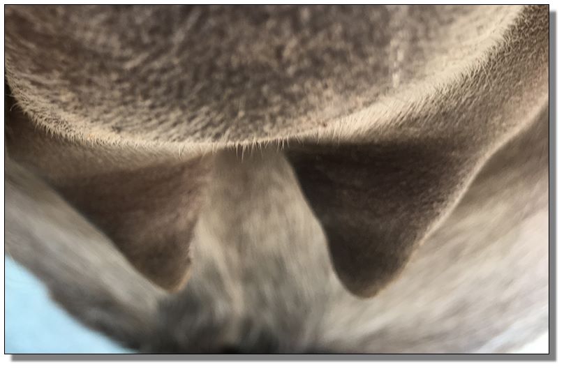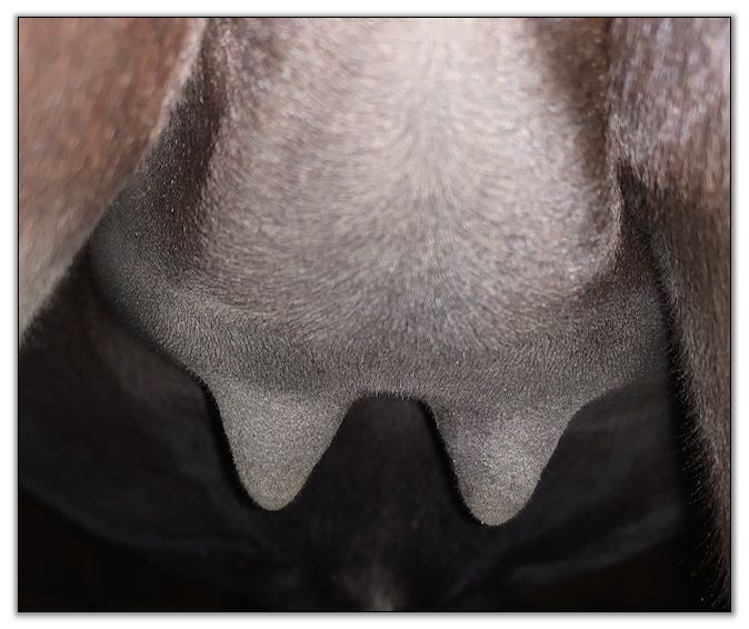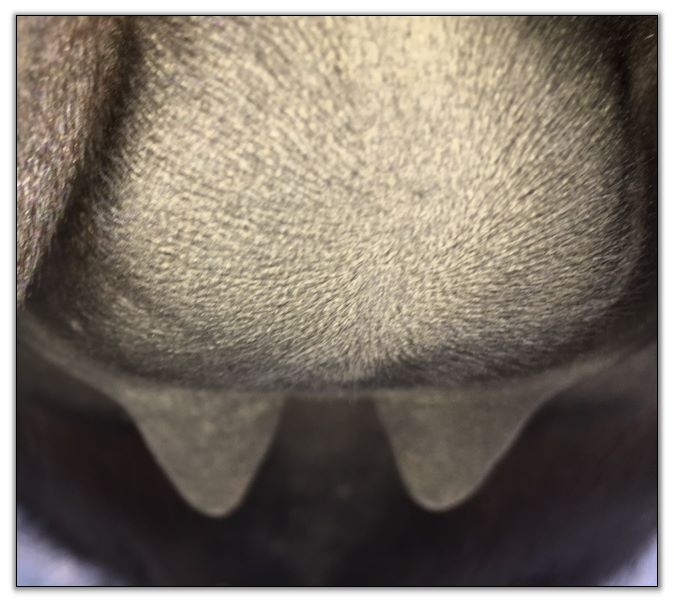 Two hours later and even firmer!! As you can see she is no longer flat but rounding out between her teats. We think she will foal within 24 to 48 hours!