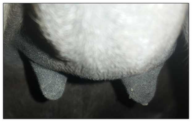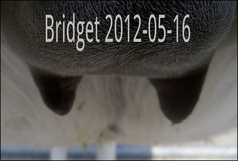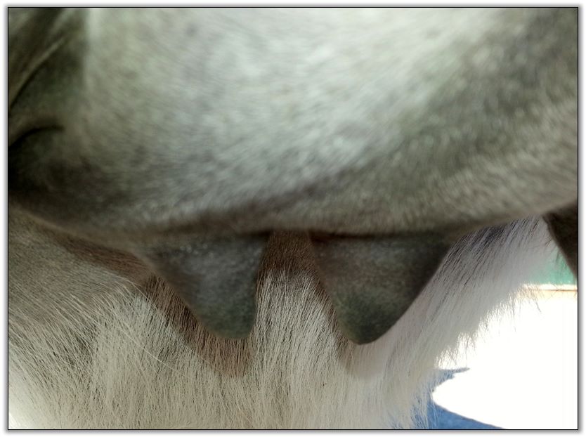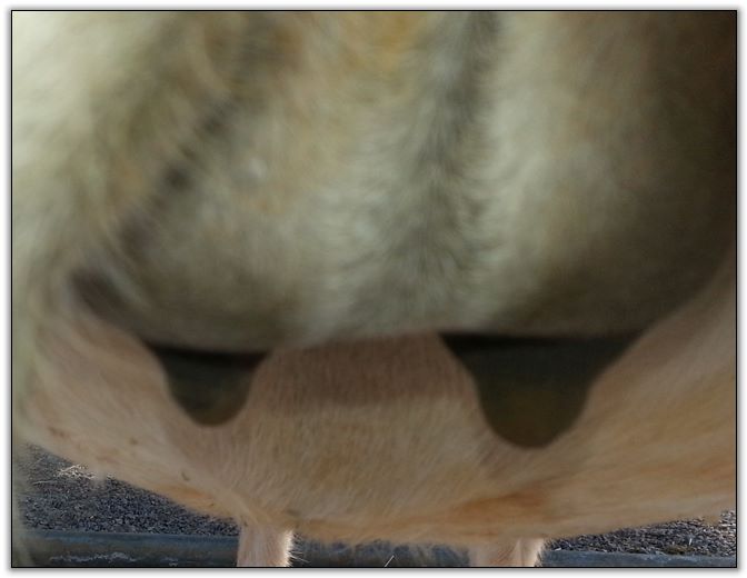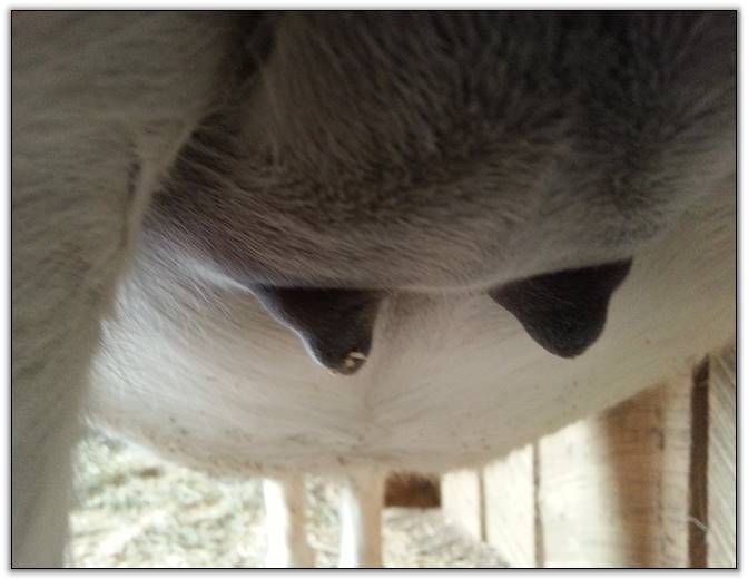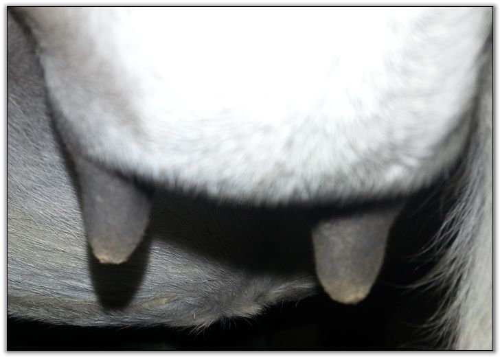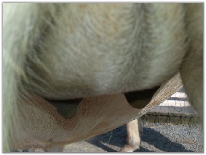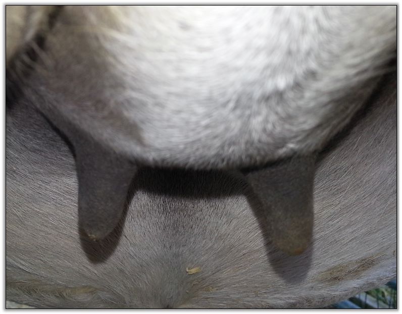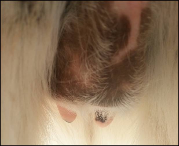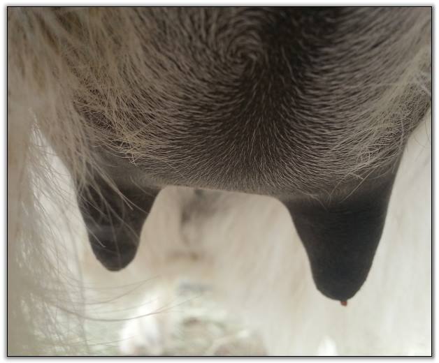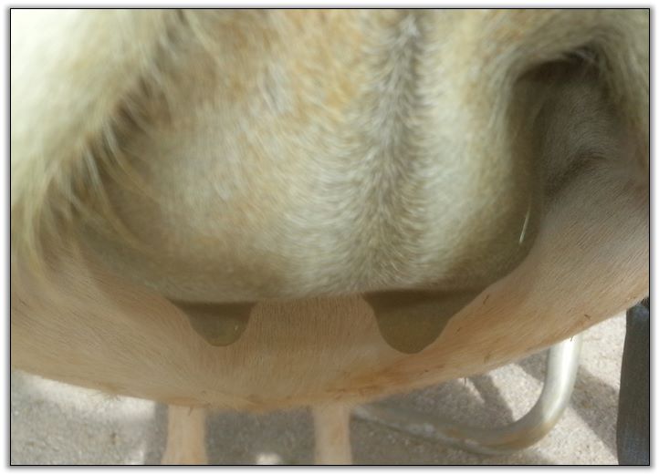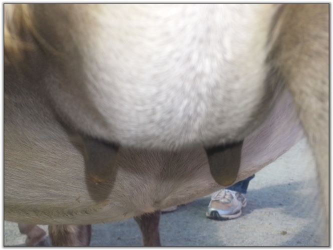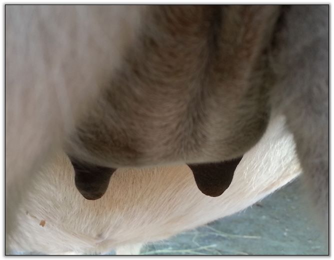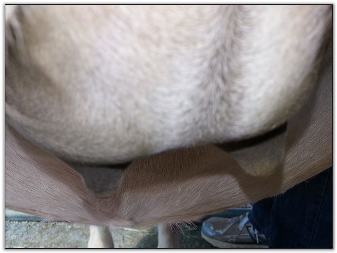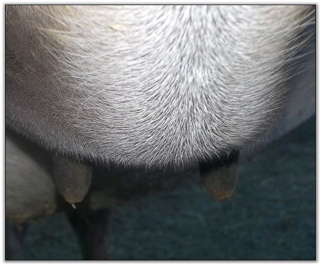 I feel that Bridget will have white milk within 24 hours...her bag/teats are very firm and teats are almost fully engorged...photo taken at 6am.