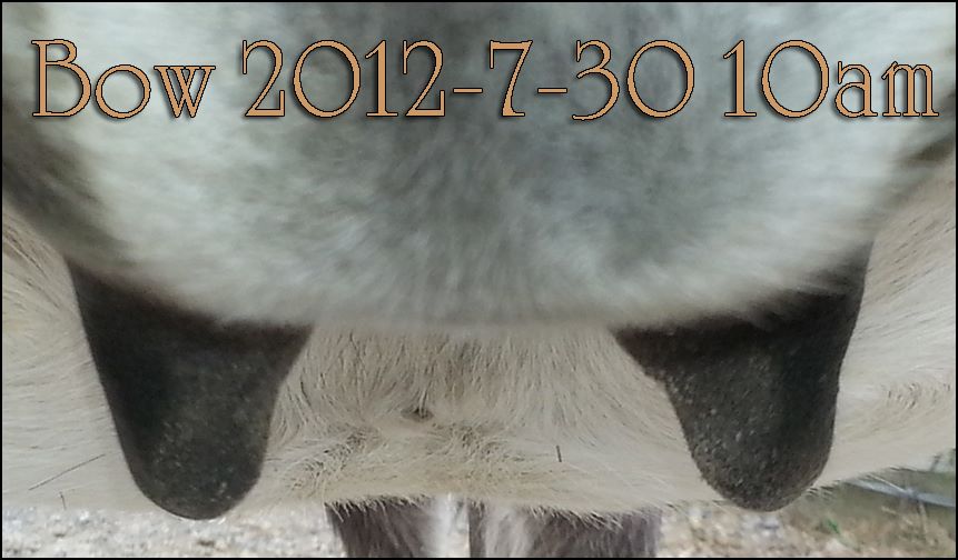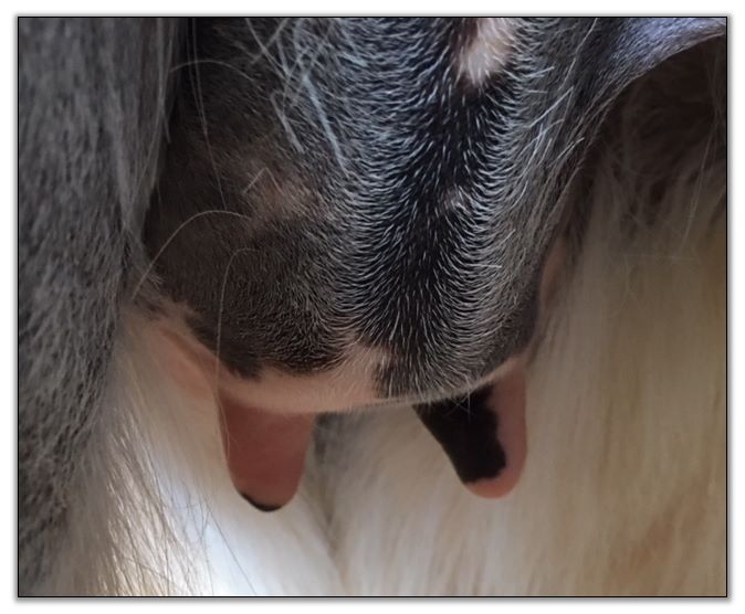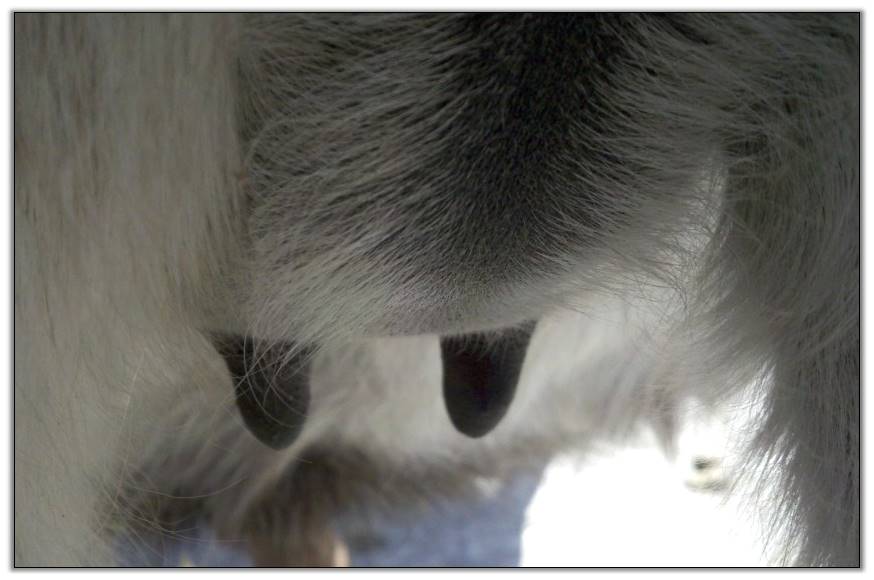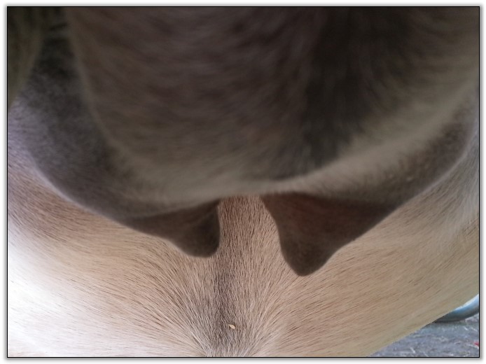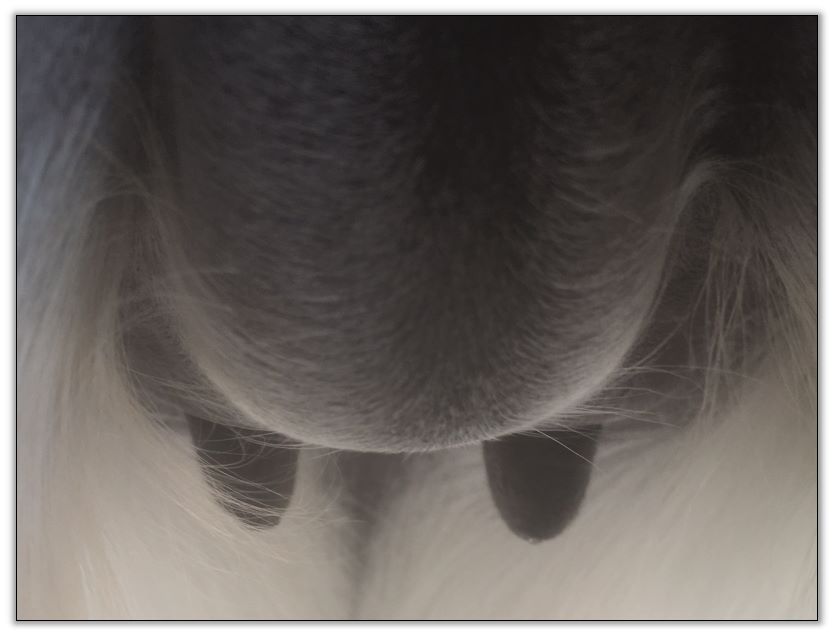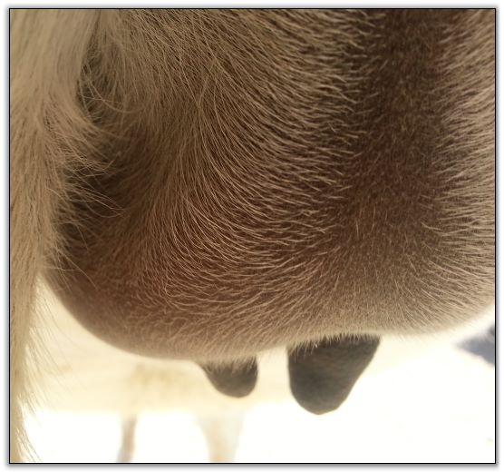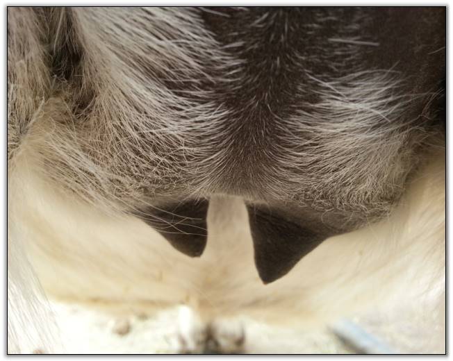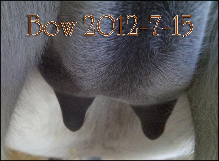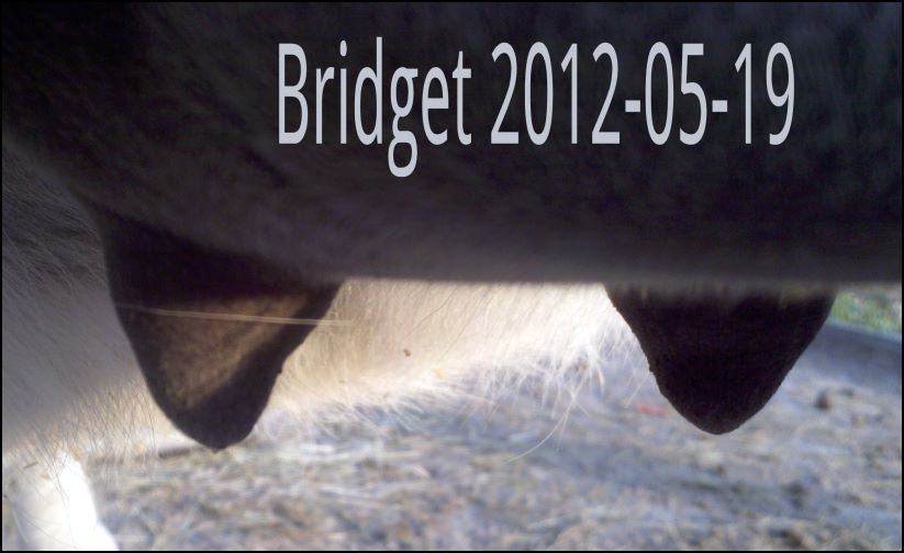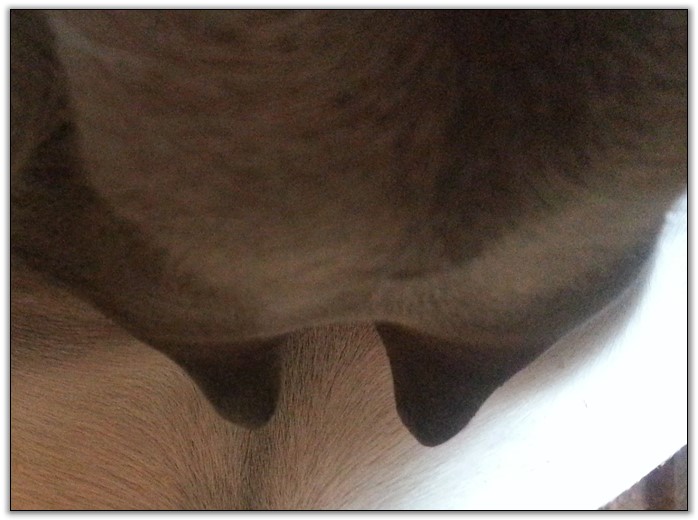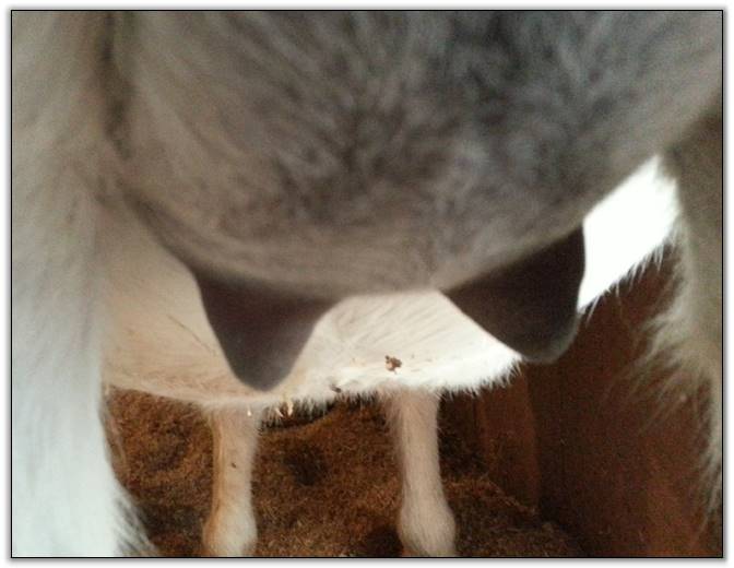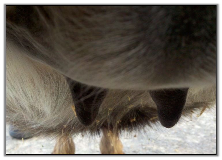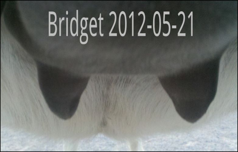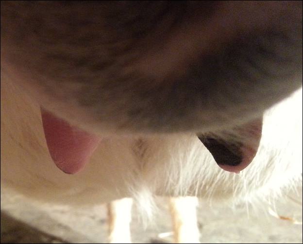 I feel that Bridget will have white milk within 24 hours...her bag/teats are very firm and teats are almost fully engorged...photo taken at 6am.