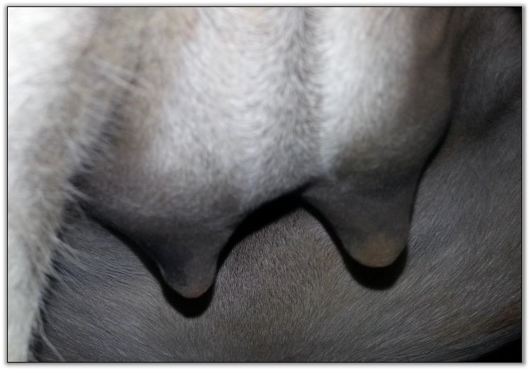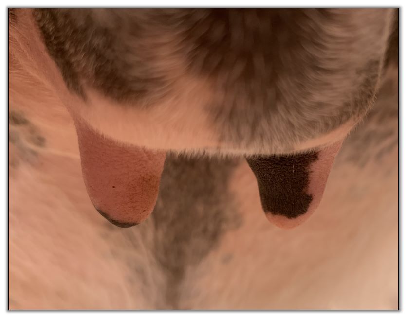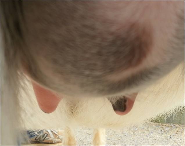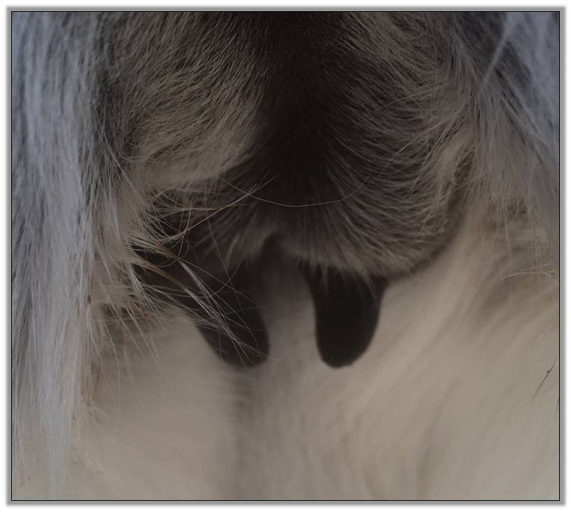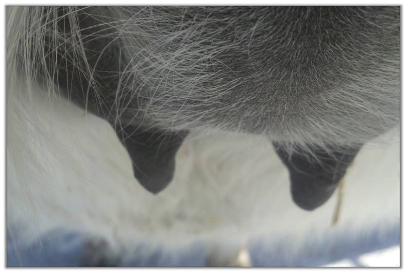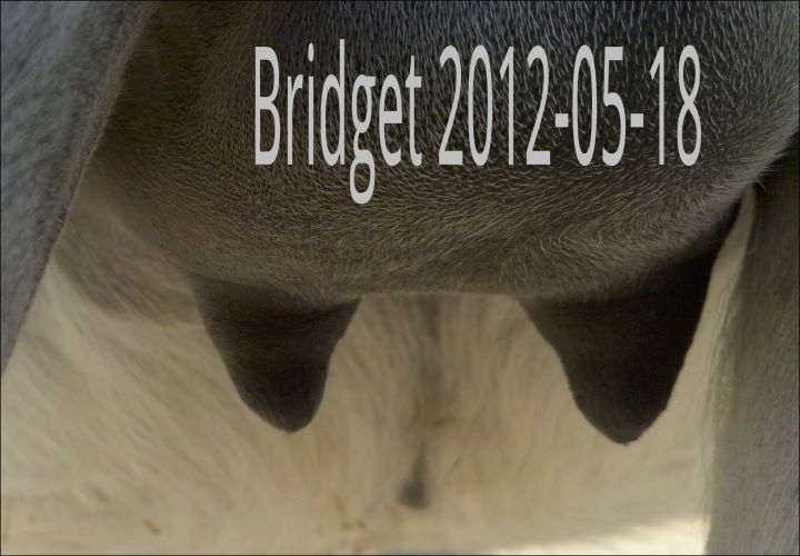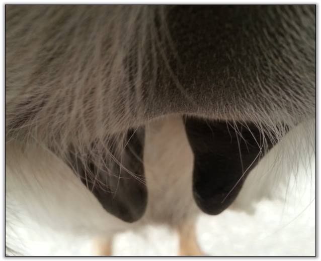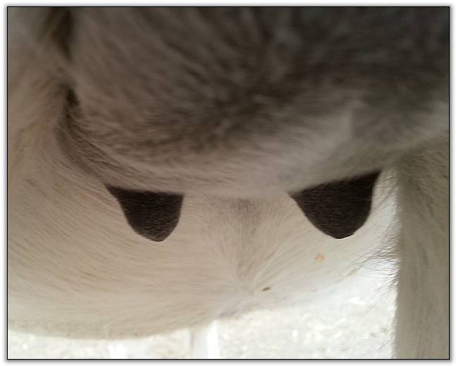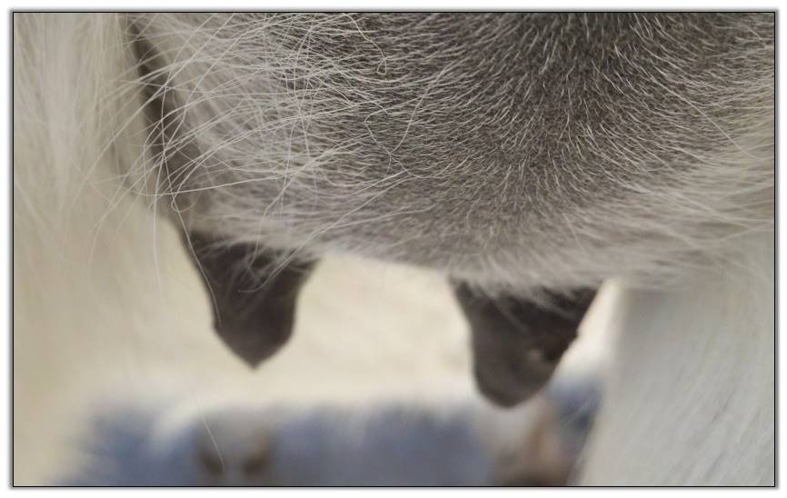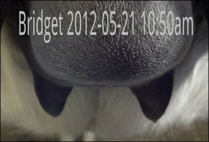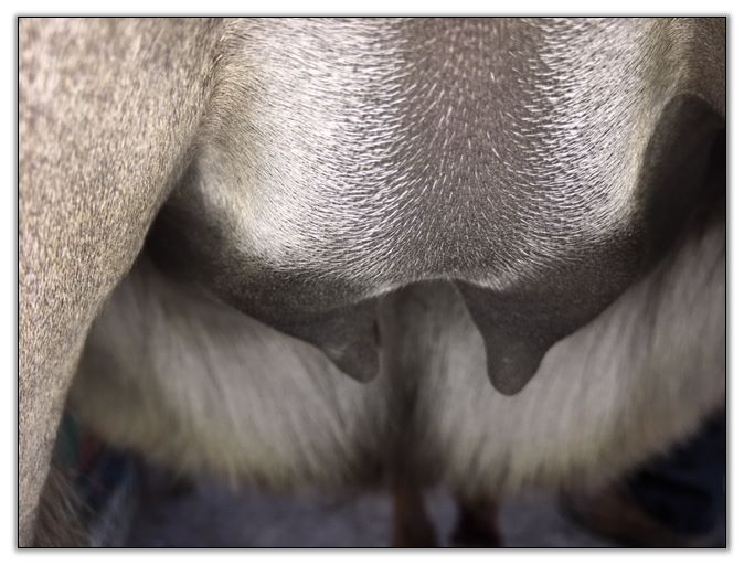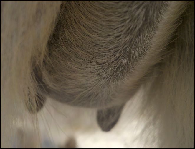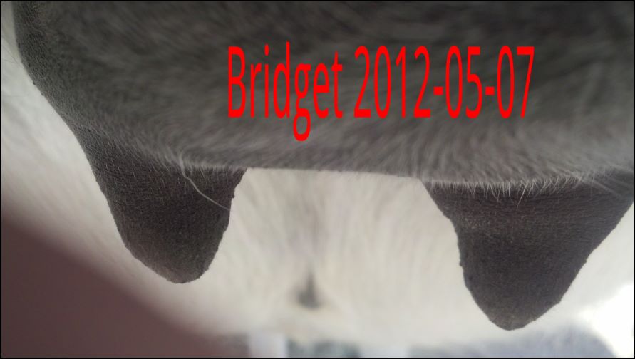 I feel that Bridget will have white milk within 24 hours...her bag/teats are very firm and teats are almost fully engorged...photo taken at 6am.