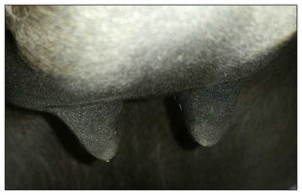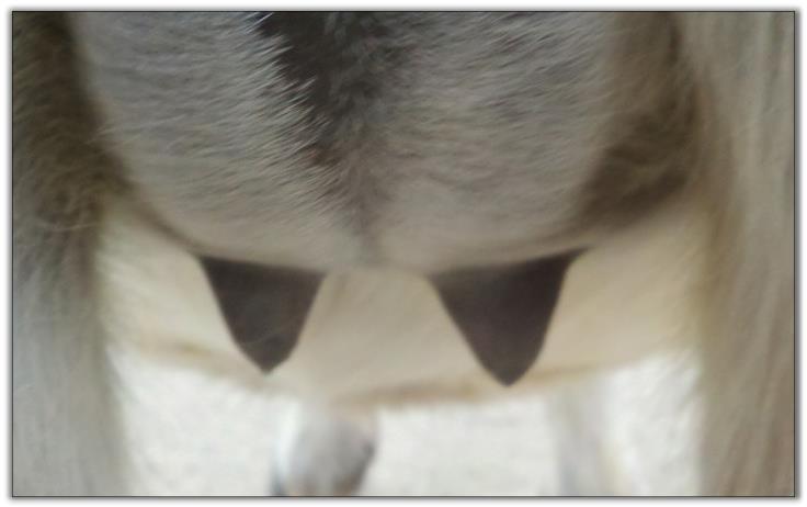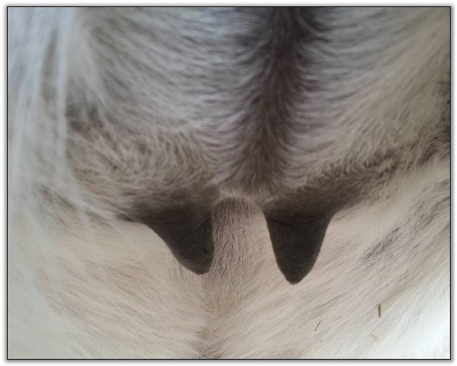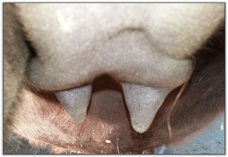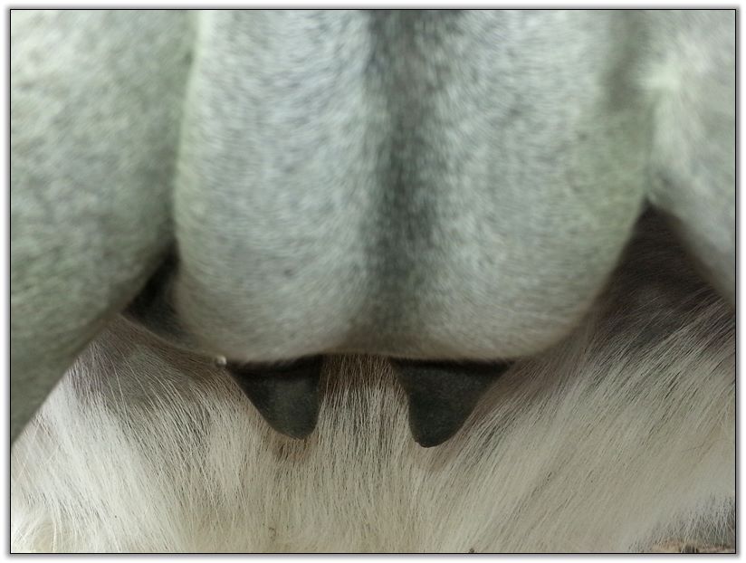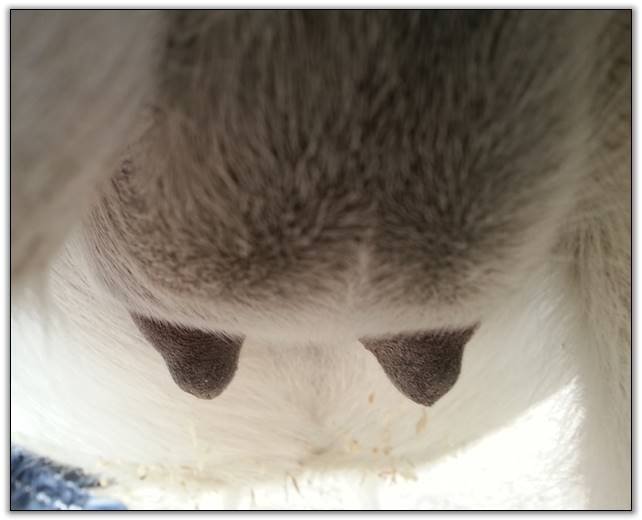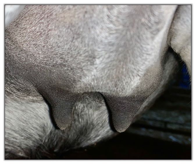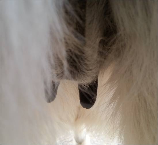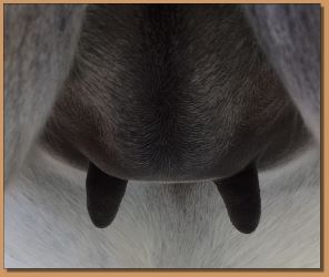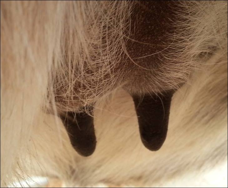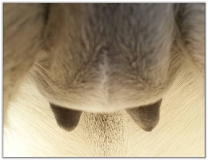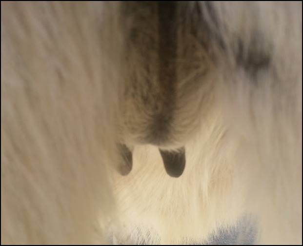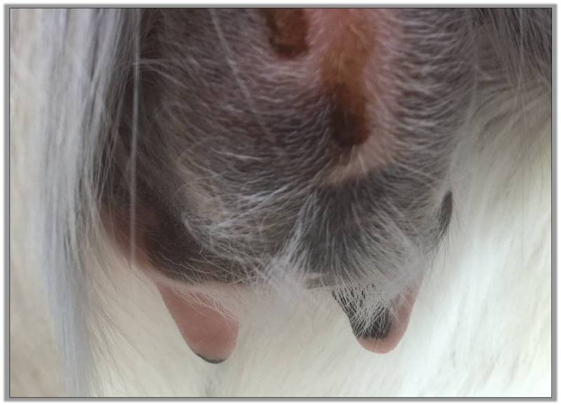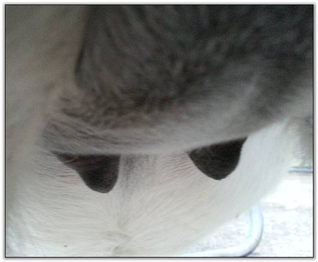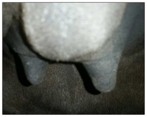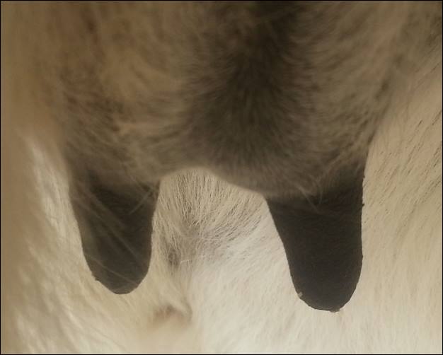 I feel that Bridget will have white milk within 24 hours...her bag/teats are very firm and teats are almost fully engorged...photo taken at 6am.