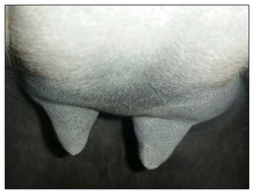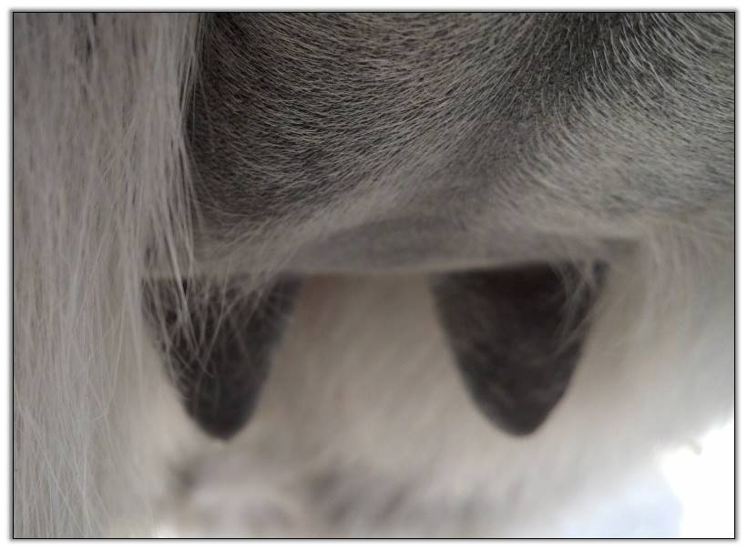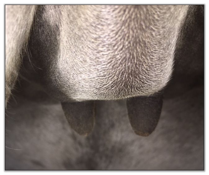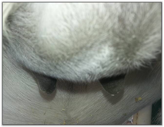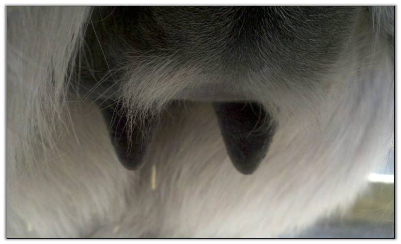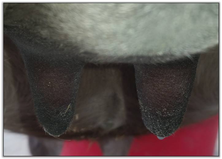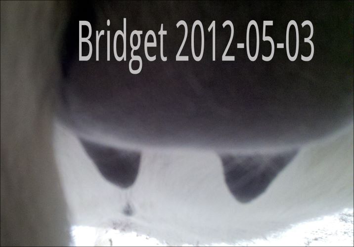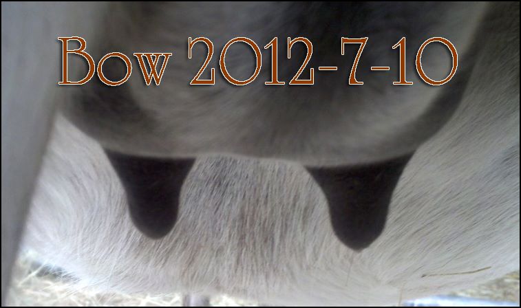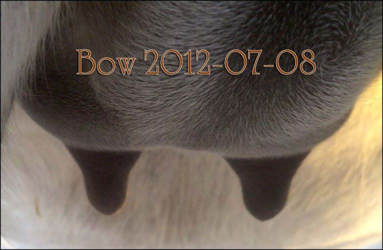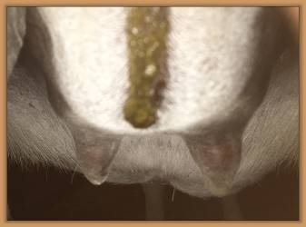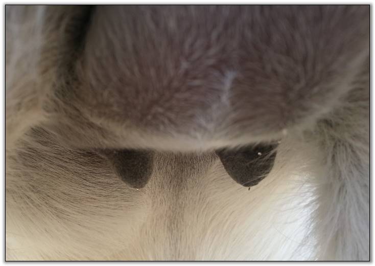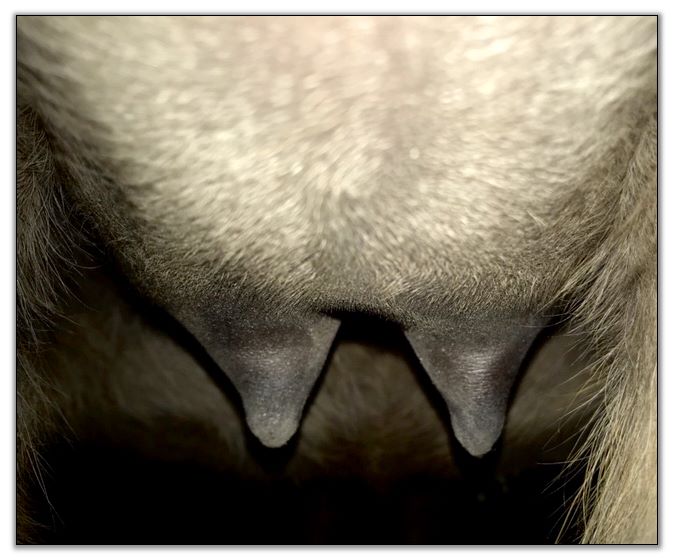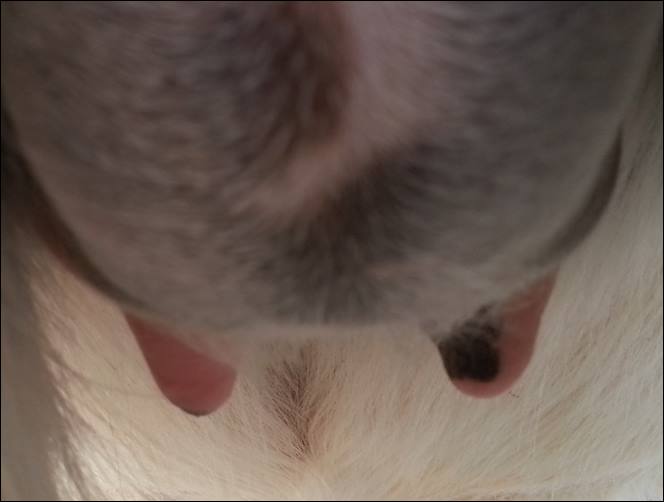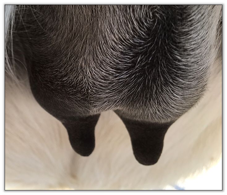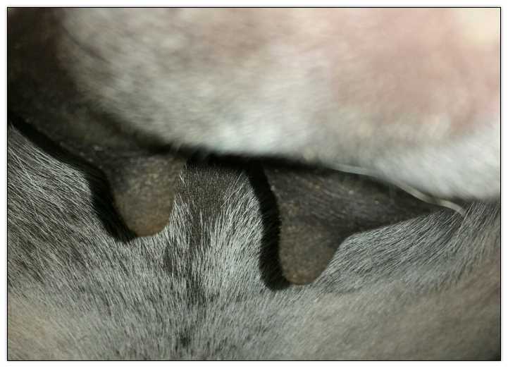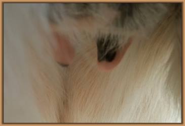 I feel that Bridget will have white milk within 24 hours...her bag/teats are very firm and teats are almost fully engorged...photo taken at 6am.