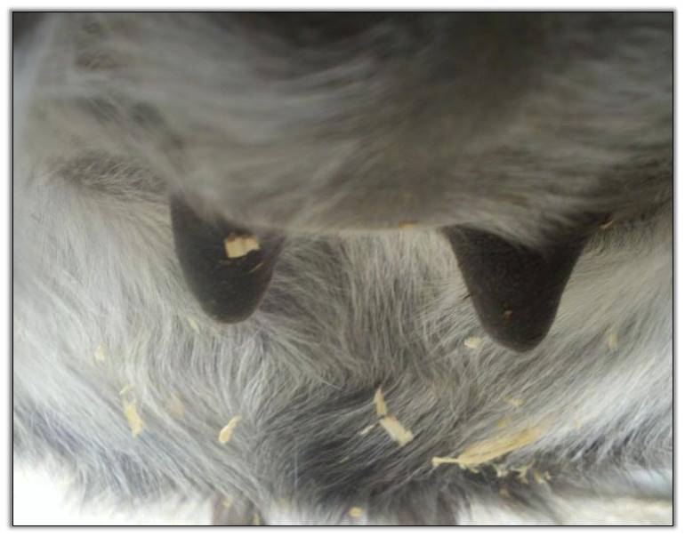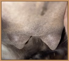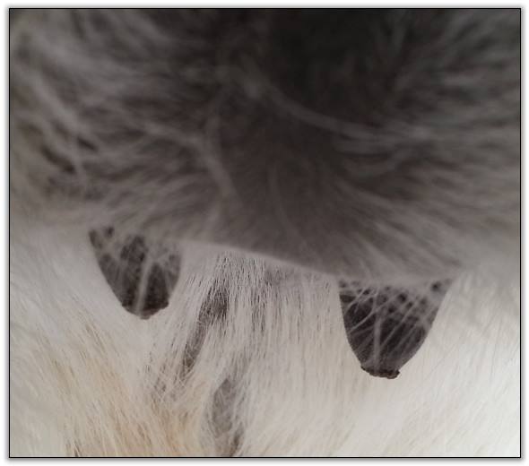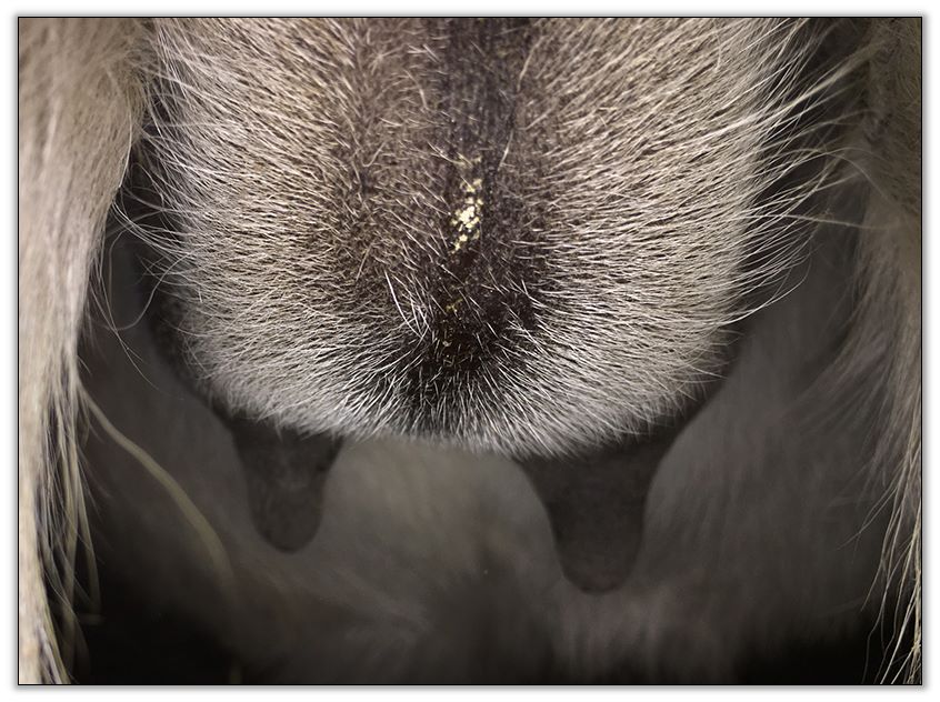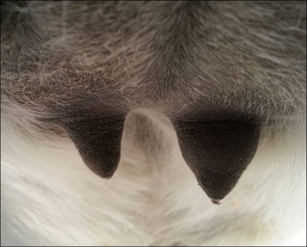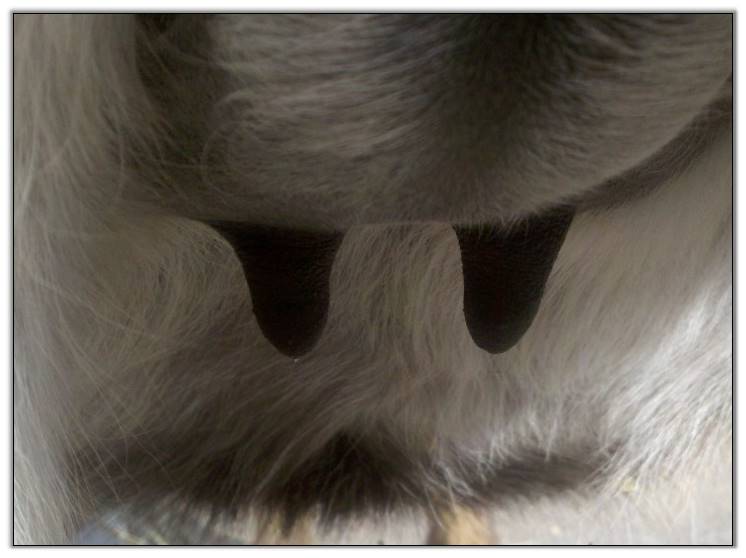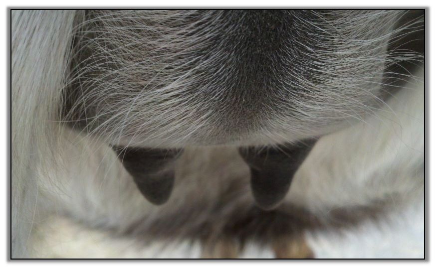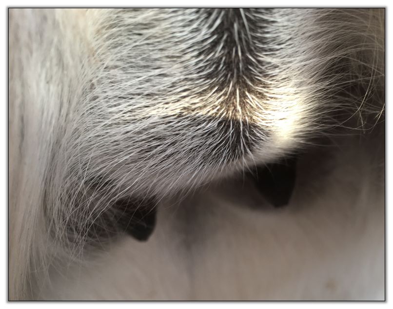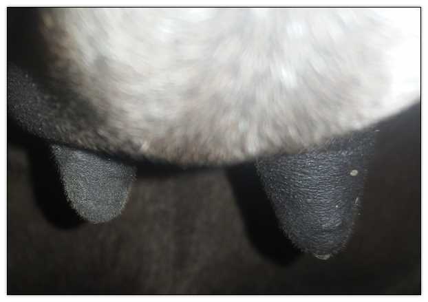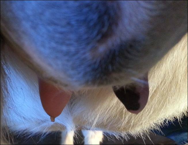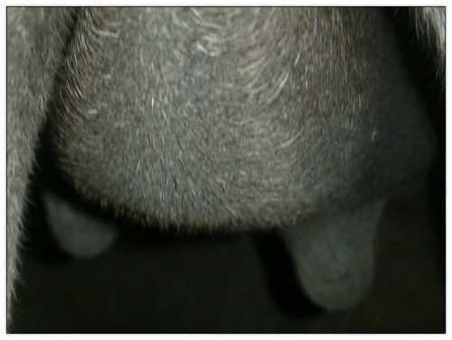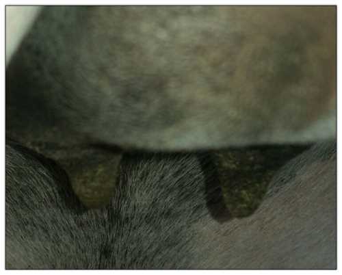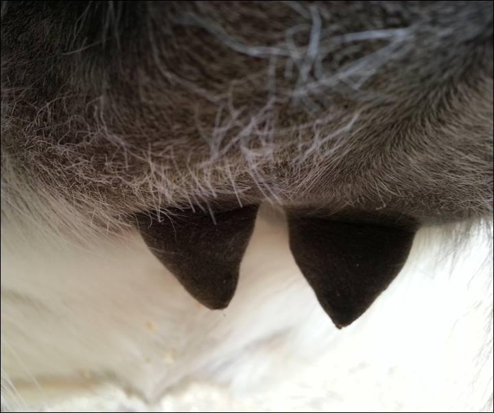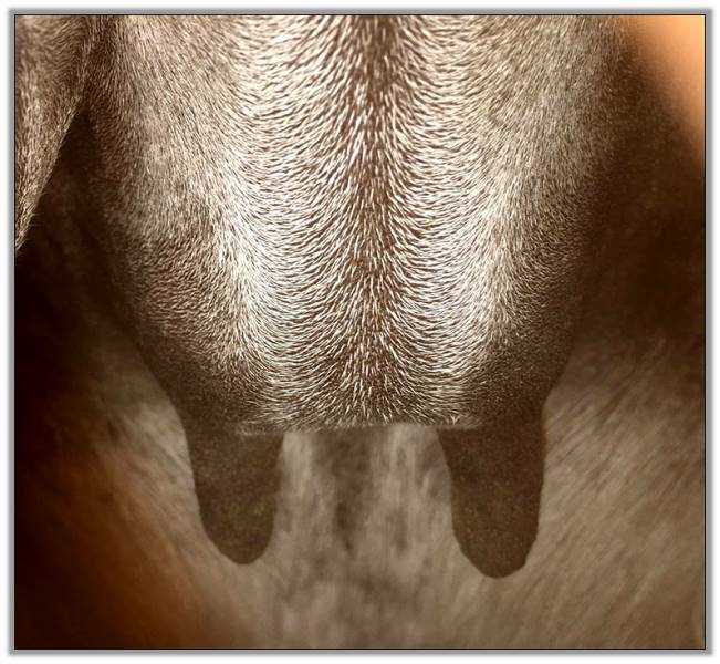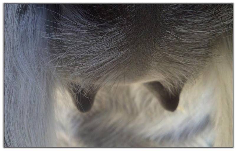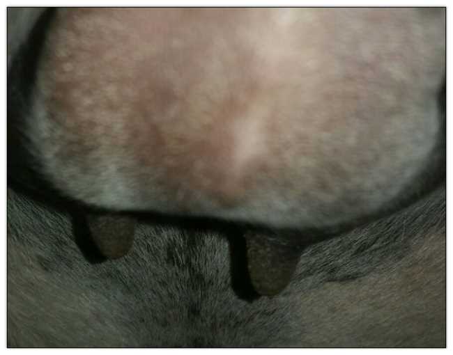 I feel that Bridget will have white milk within 24 hours...her bag/teats are very firm and teats are almost fully engorged...photo taken at 6am.