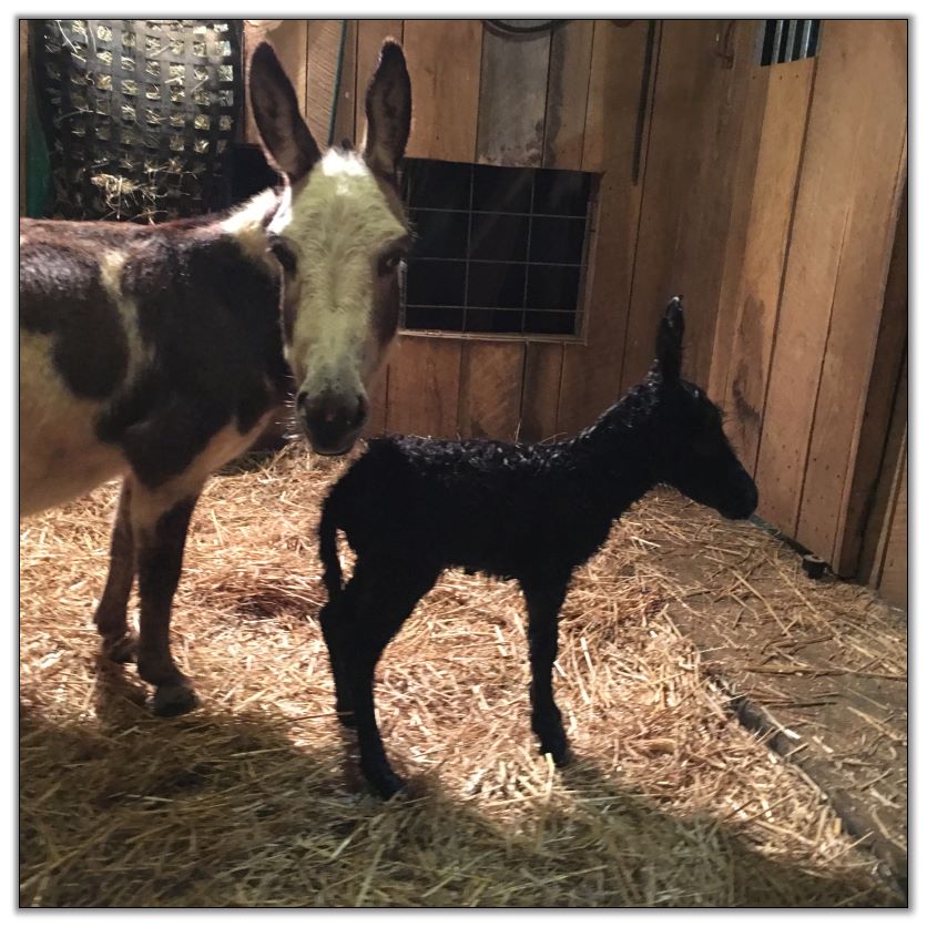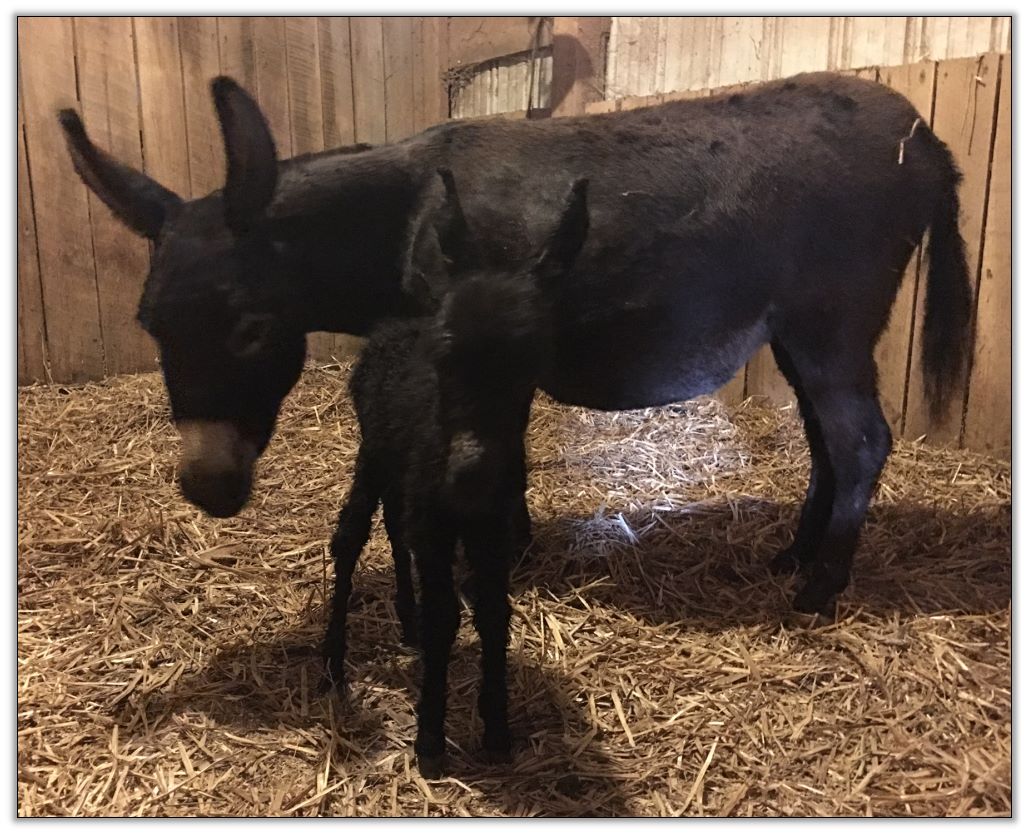Silee foaled a black no light point jack with a star on 6/30/21 @ 12:34 am. His birth weight was 18.2 lbs. We will measure his height later today after he has completely unfolded from being cramped up in the birth canal.